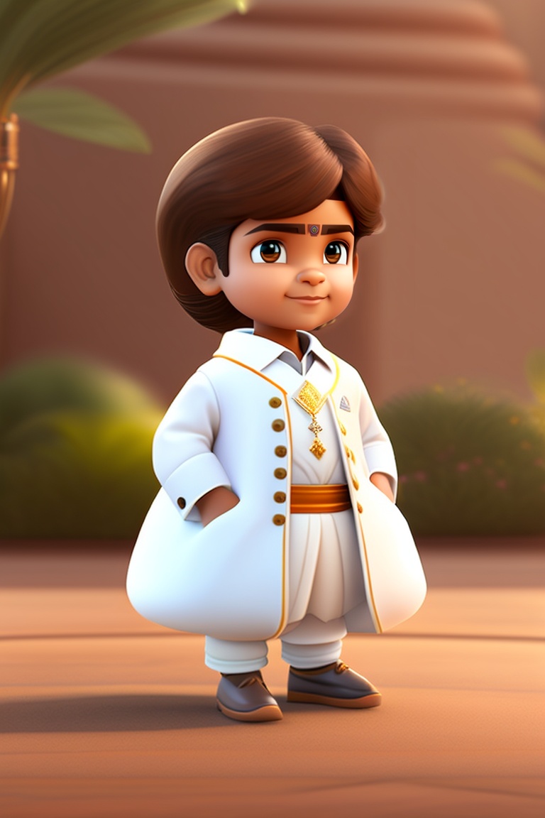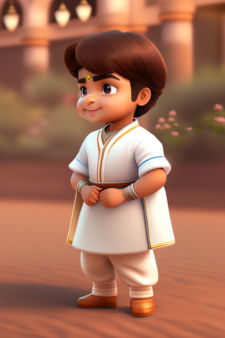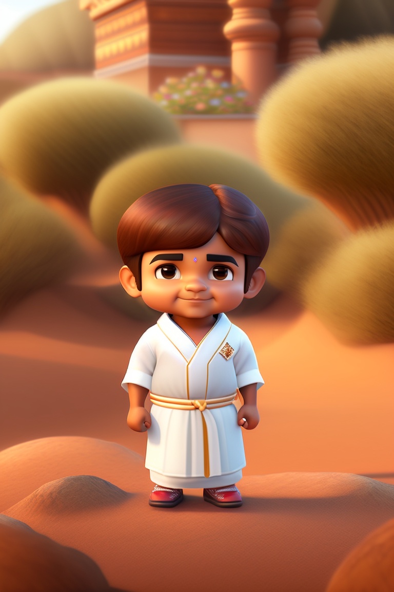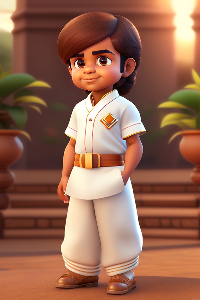 Brown hair indian boy in white dhothi, standing centre of a ground, pixar style, 3d style, disney style, 8k, beautiful
