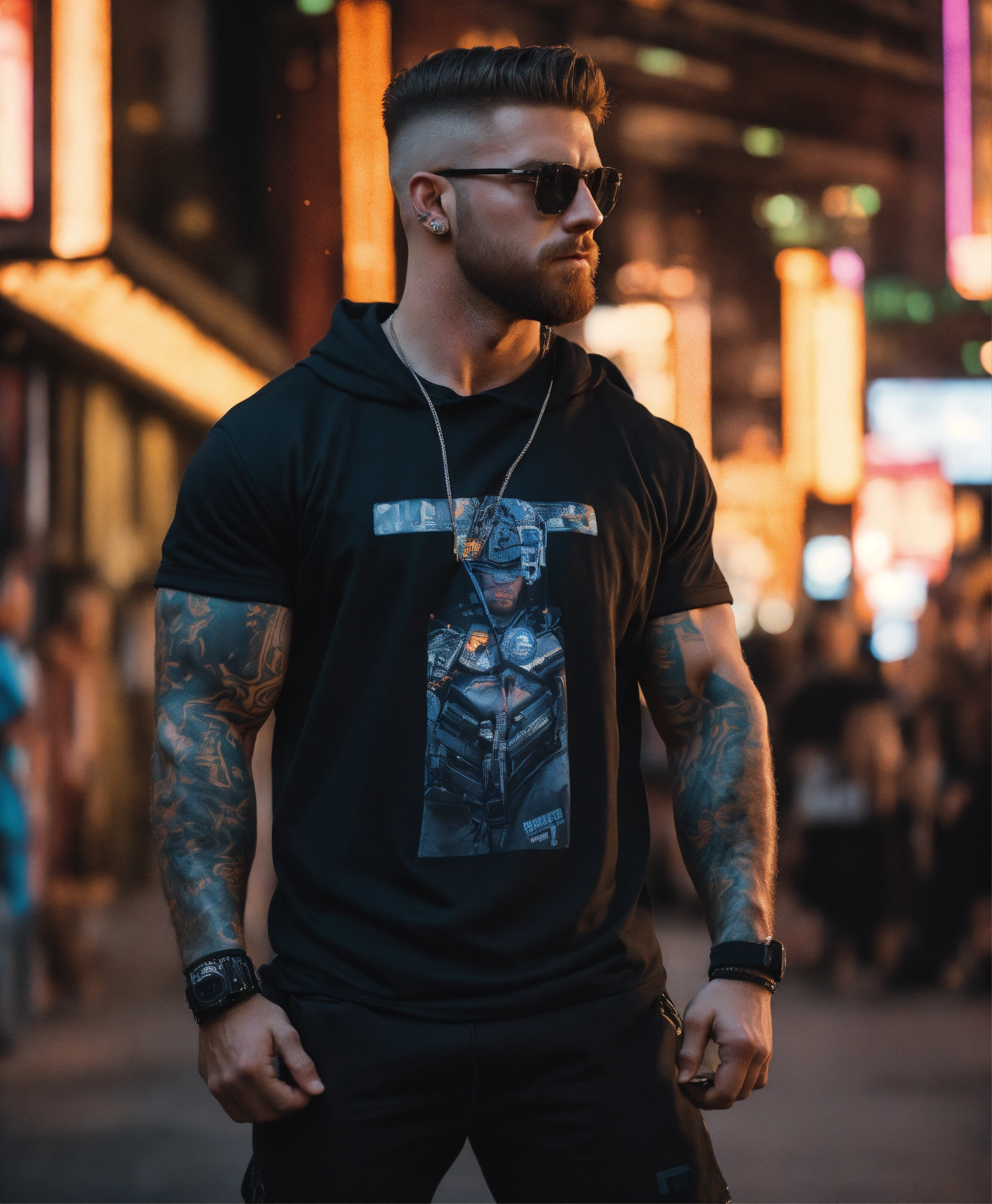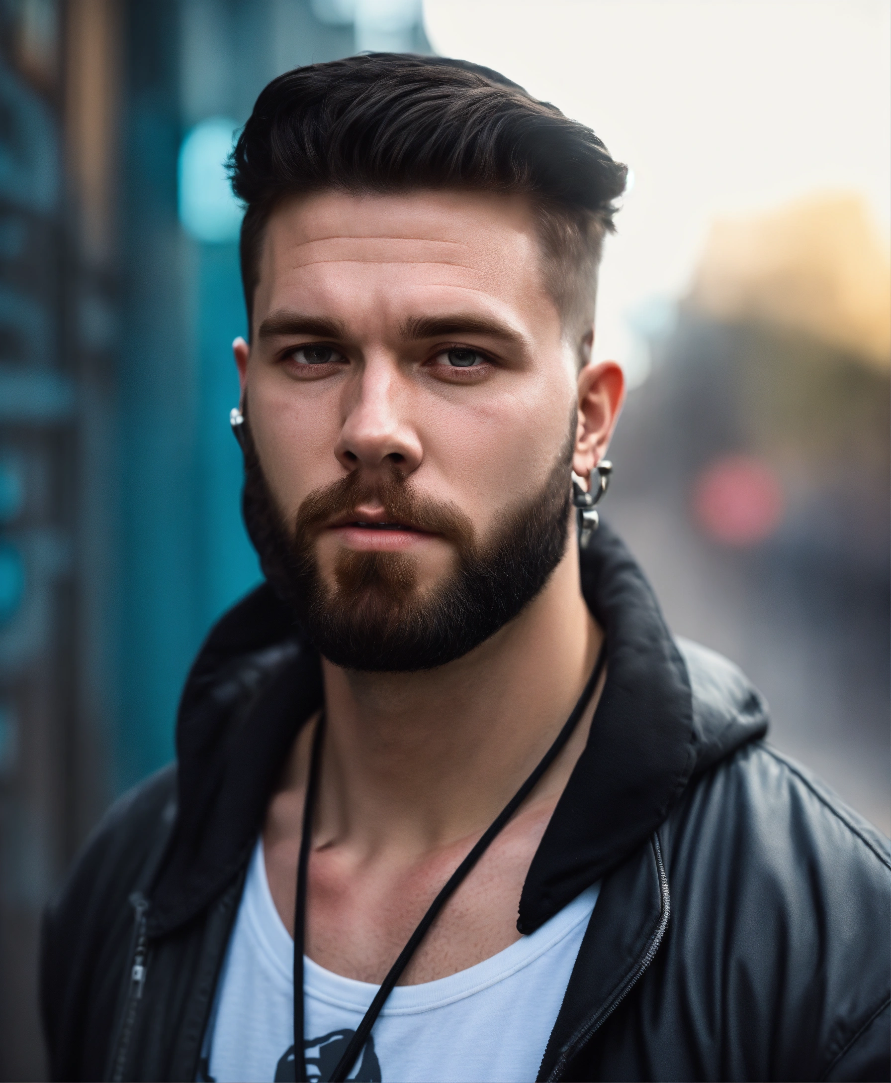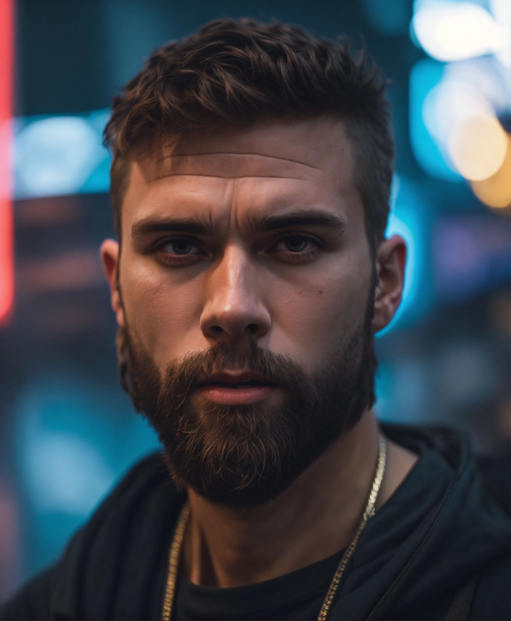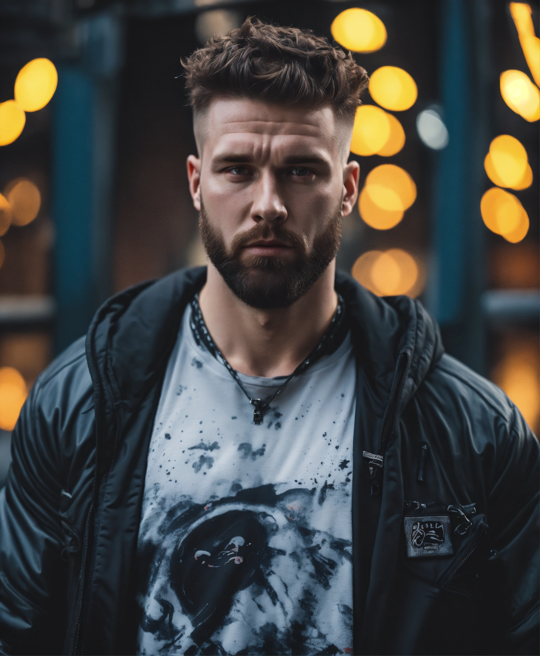 Highly detailed portrait of white man 30 years old, big muscles, huge, black streetwear, cyberpunk, cartoon realism, black, grunge aesthetic!!! bokeh