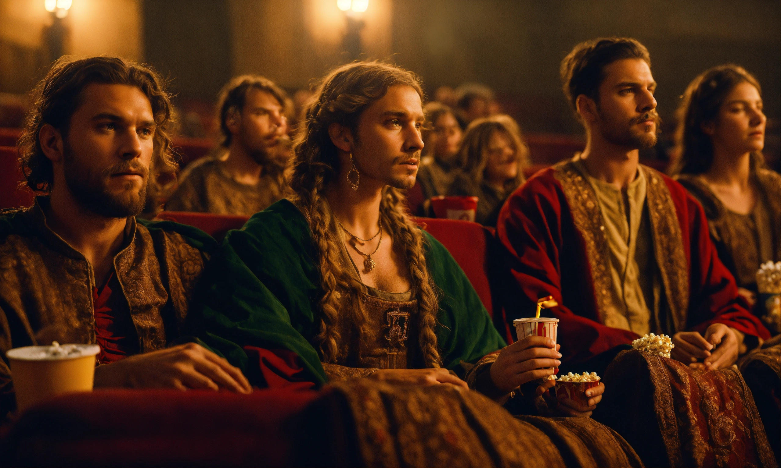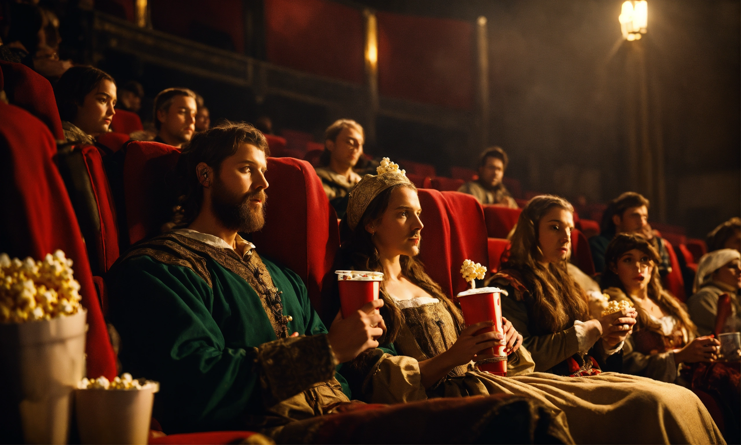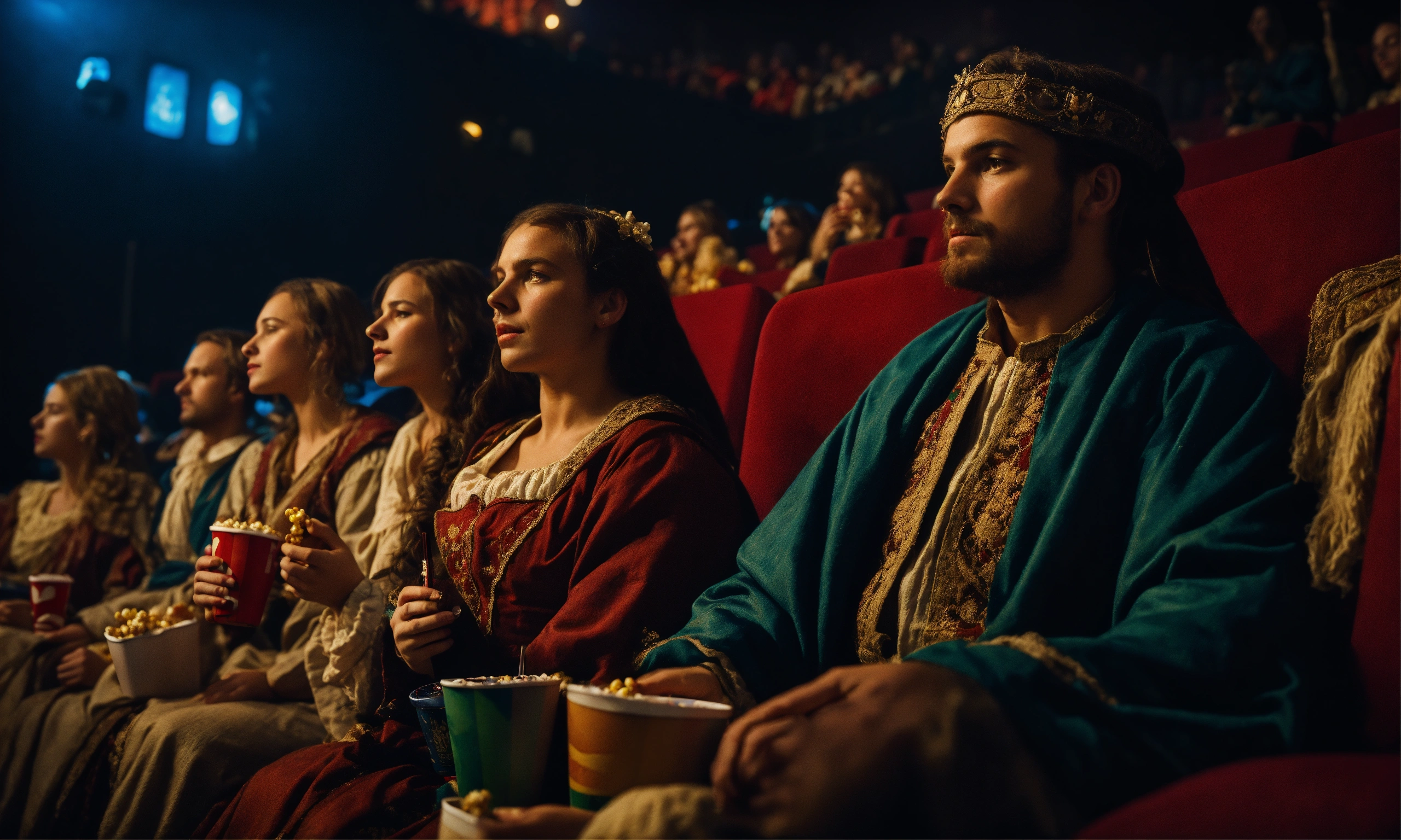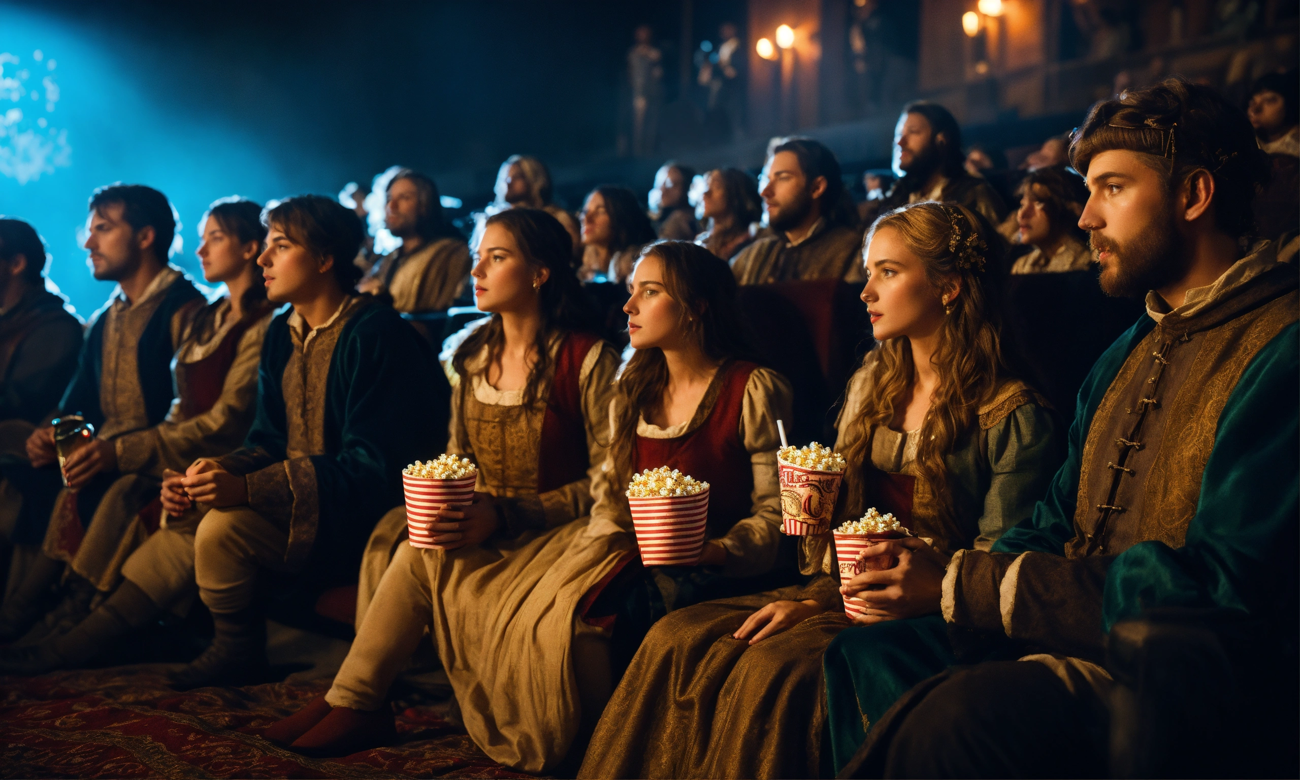 A lot of curious medieval man and women in the traditional midieval cloths, are sitting in a movie theater, eating popcorn and drinking soft drink, watching a movie in the dark
