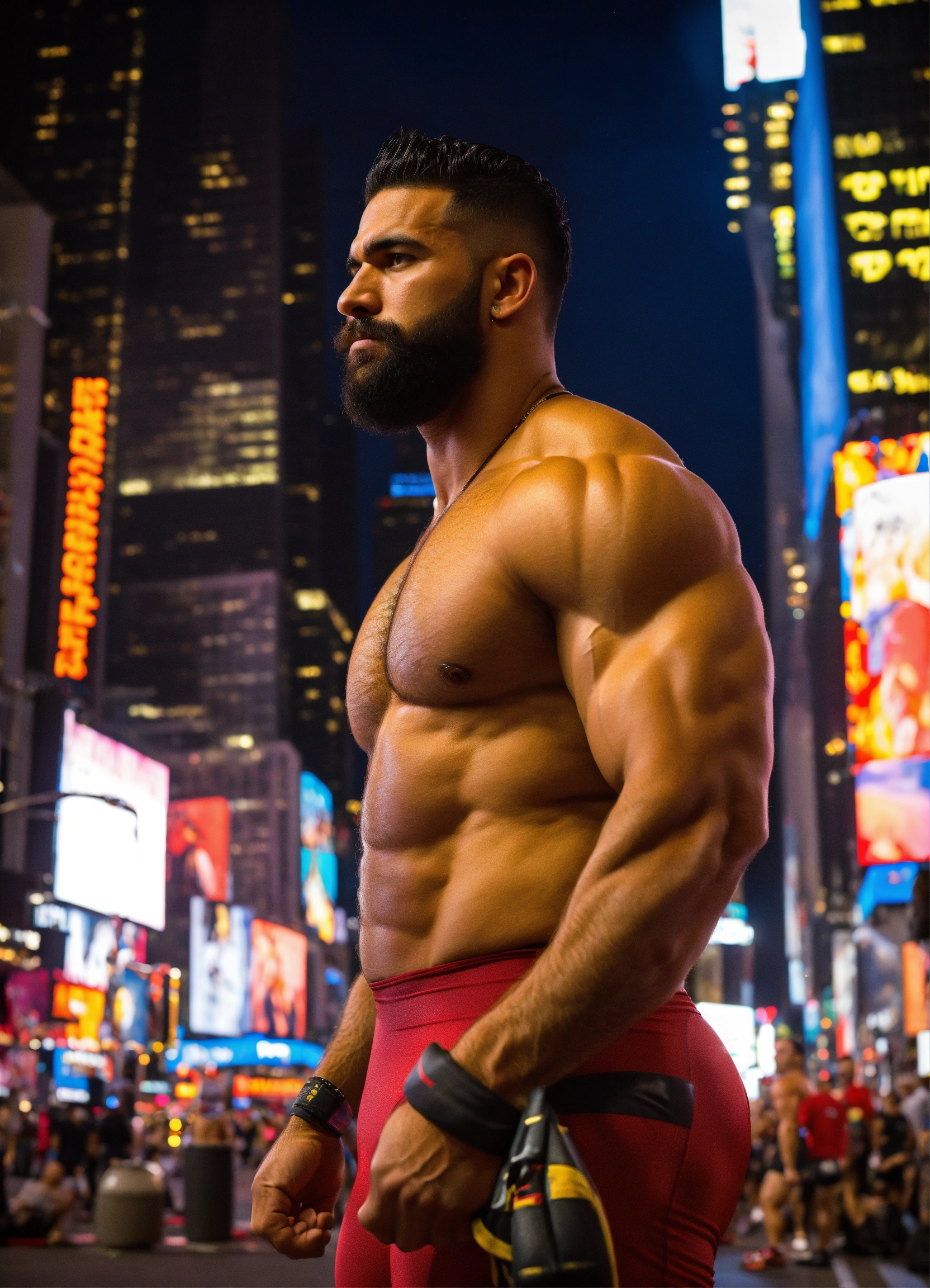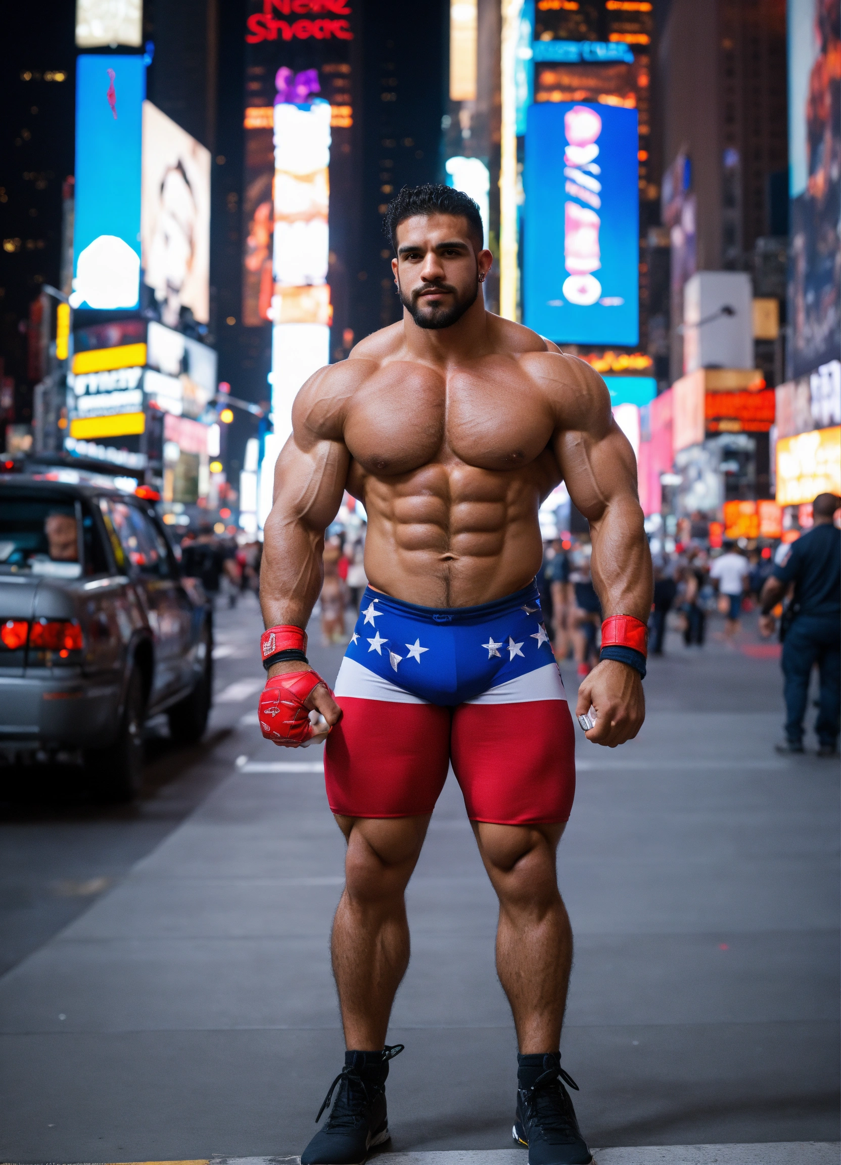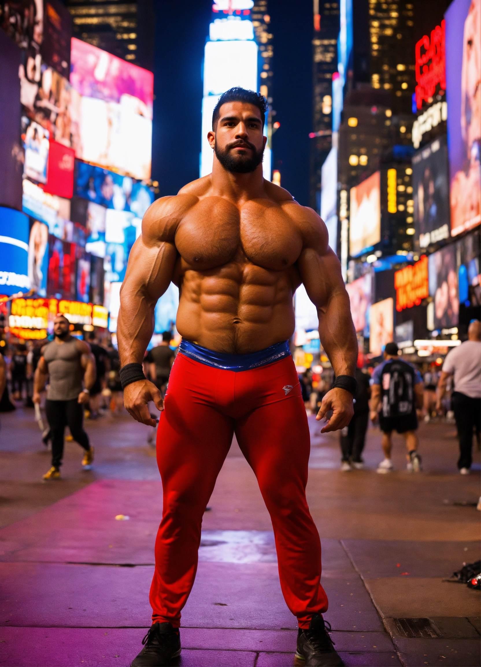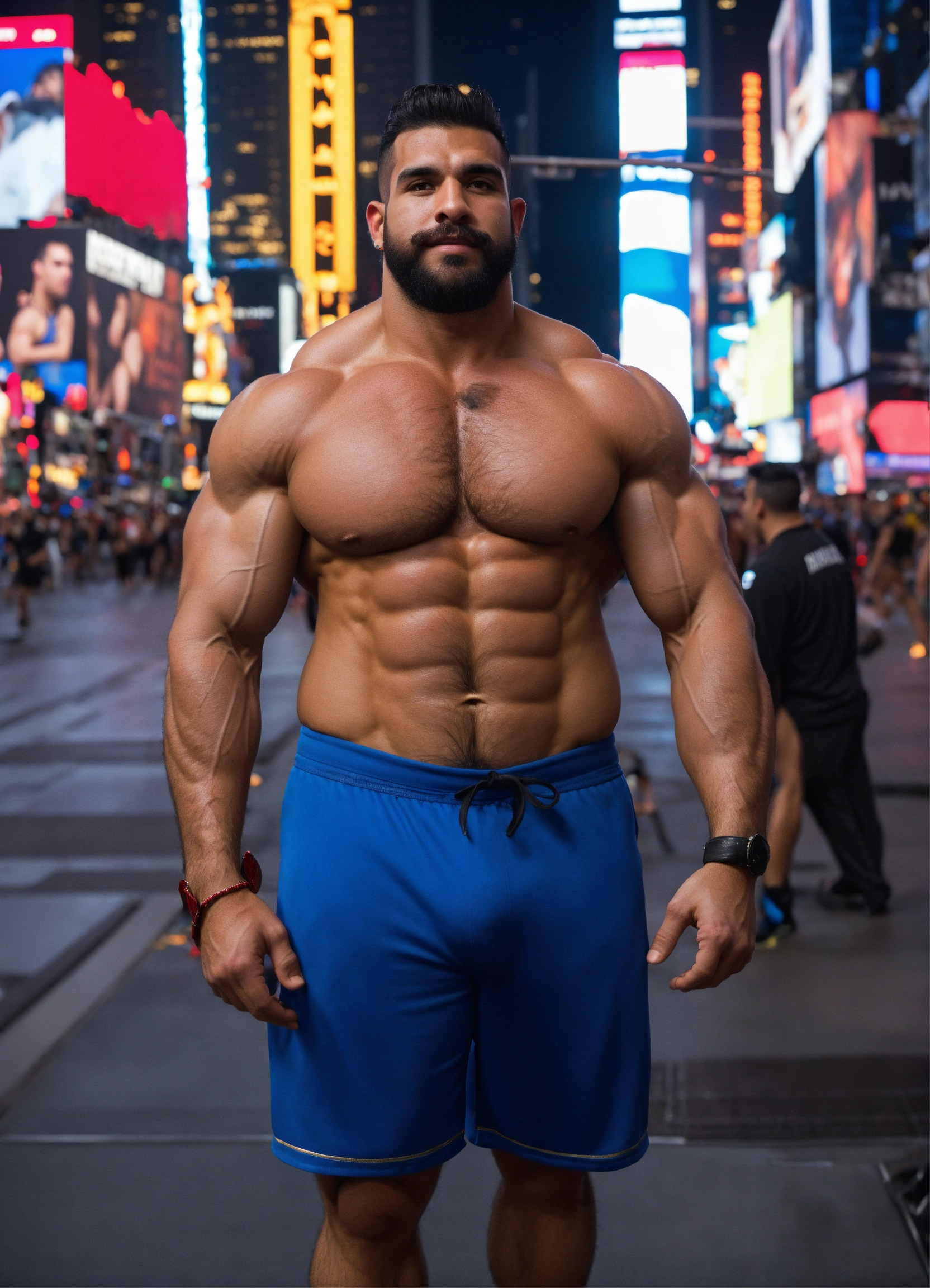 30-year-old hairy puerto rican man with big muscles, big bodybuilder, body like a wrestler, in times square at night