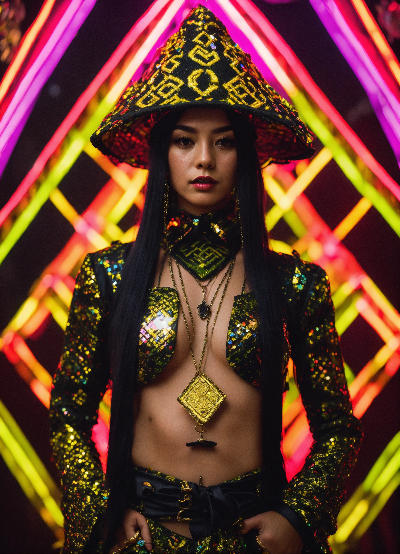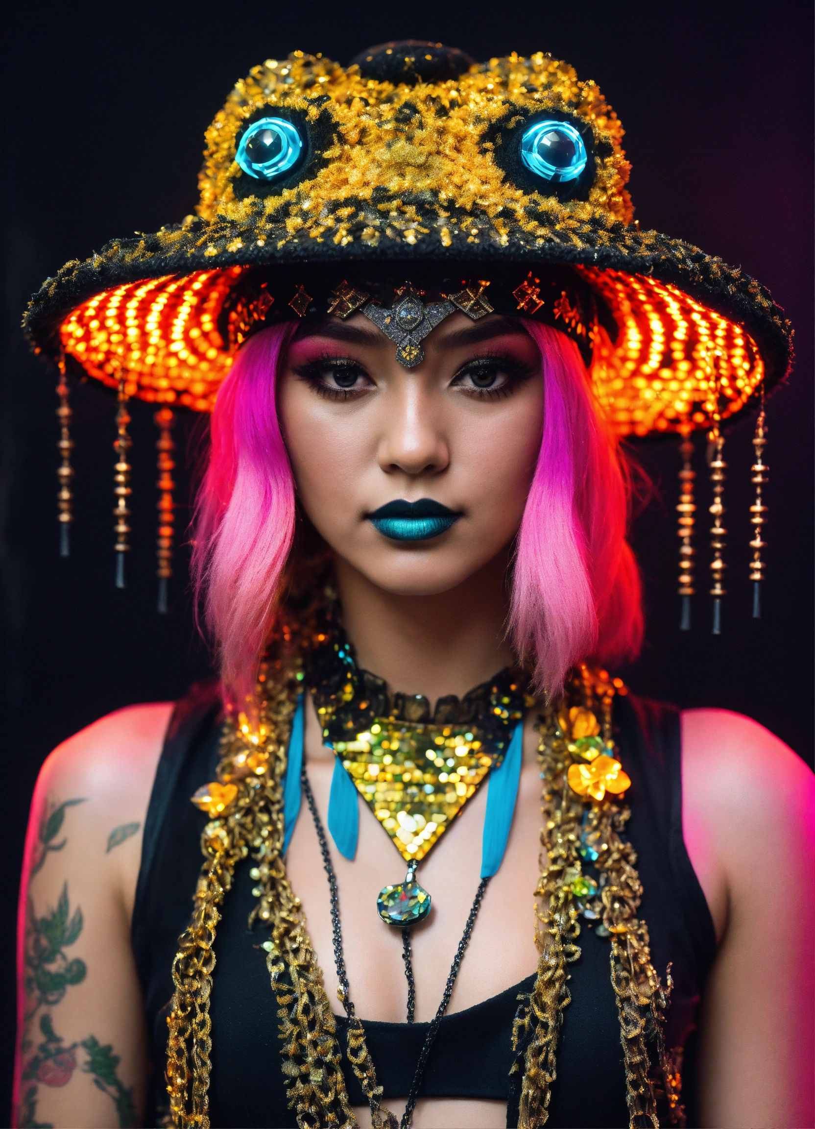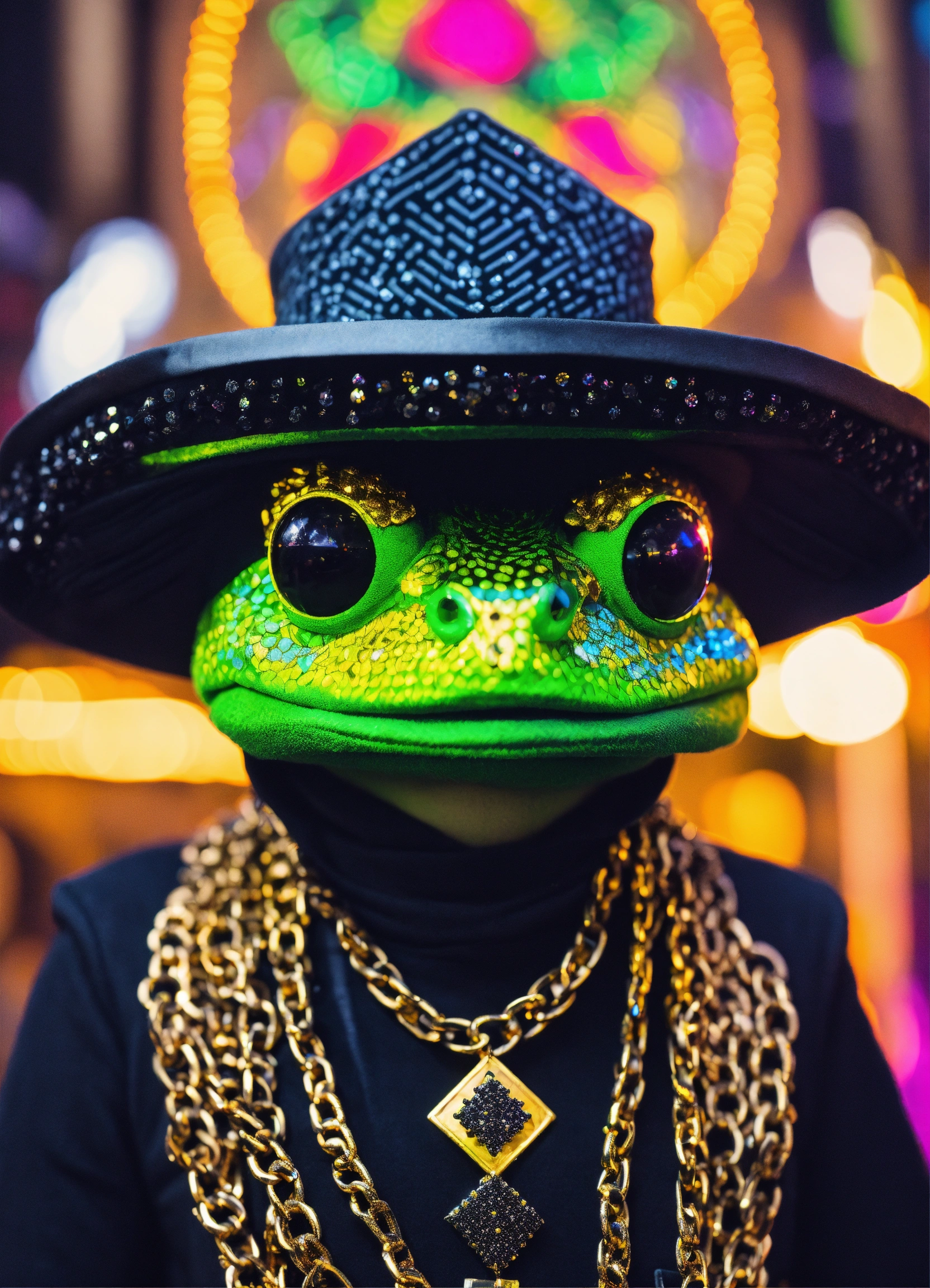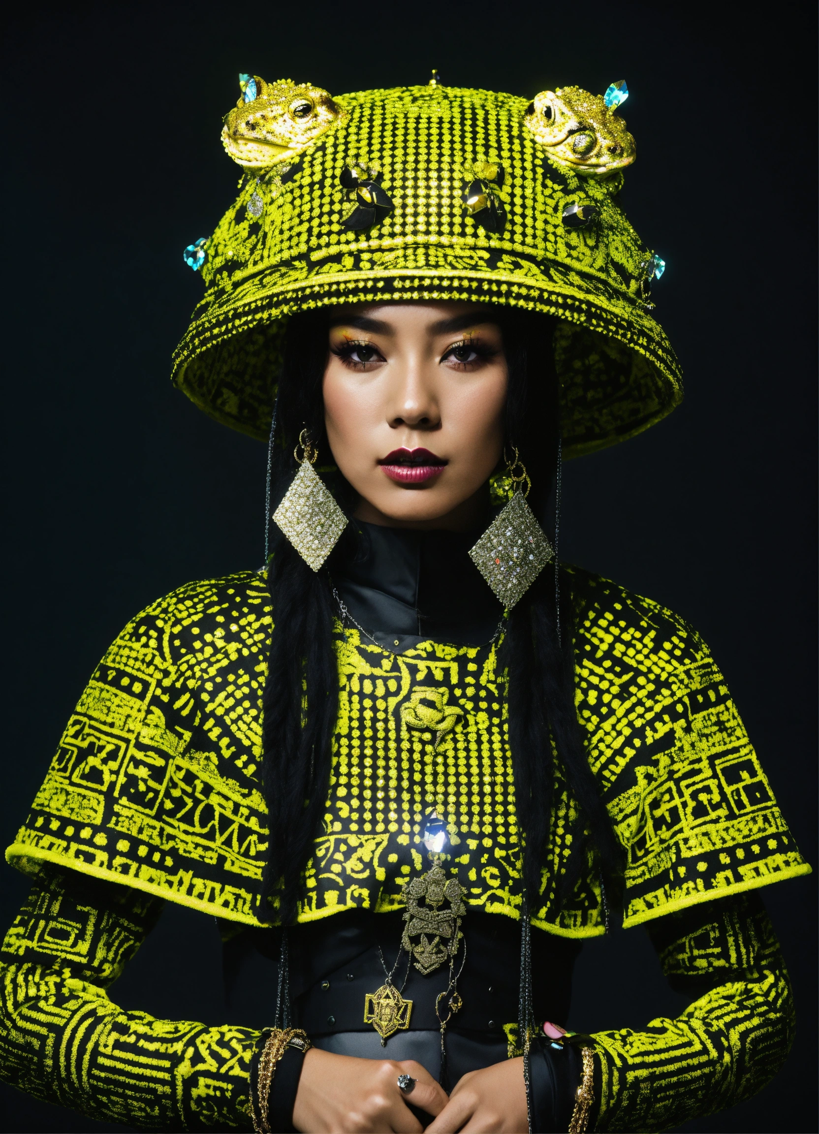 Full body portrait a toad made out of a 3d black mayan gunmetal diamond light neon optical illusion, festival raver street wear, kawaii hat with crystal hemp gold black chains, ninja qr code samurai in folk costume in a fashion magazine