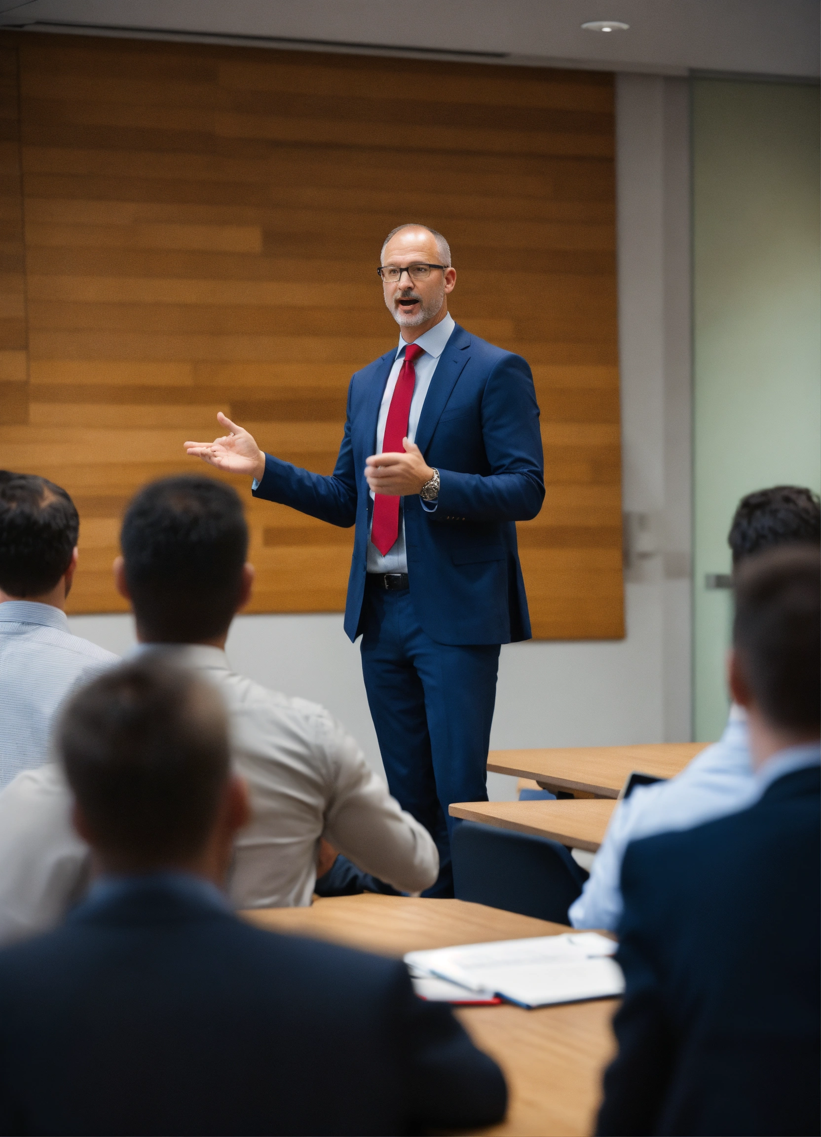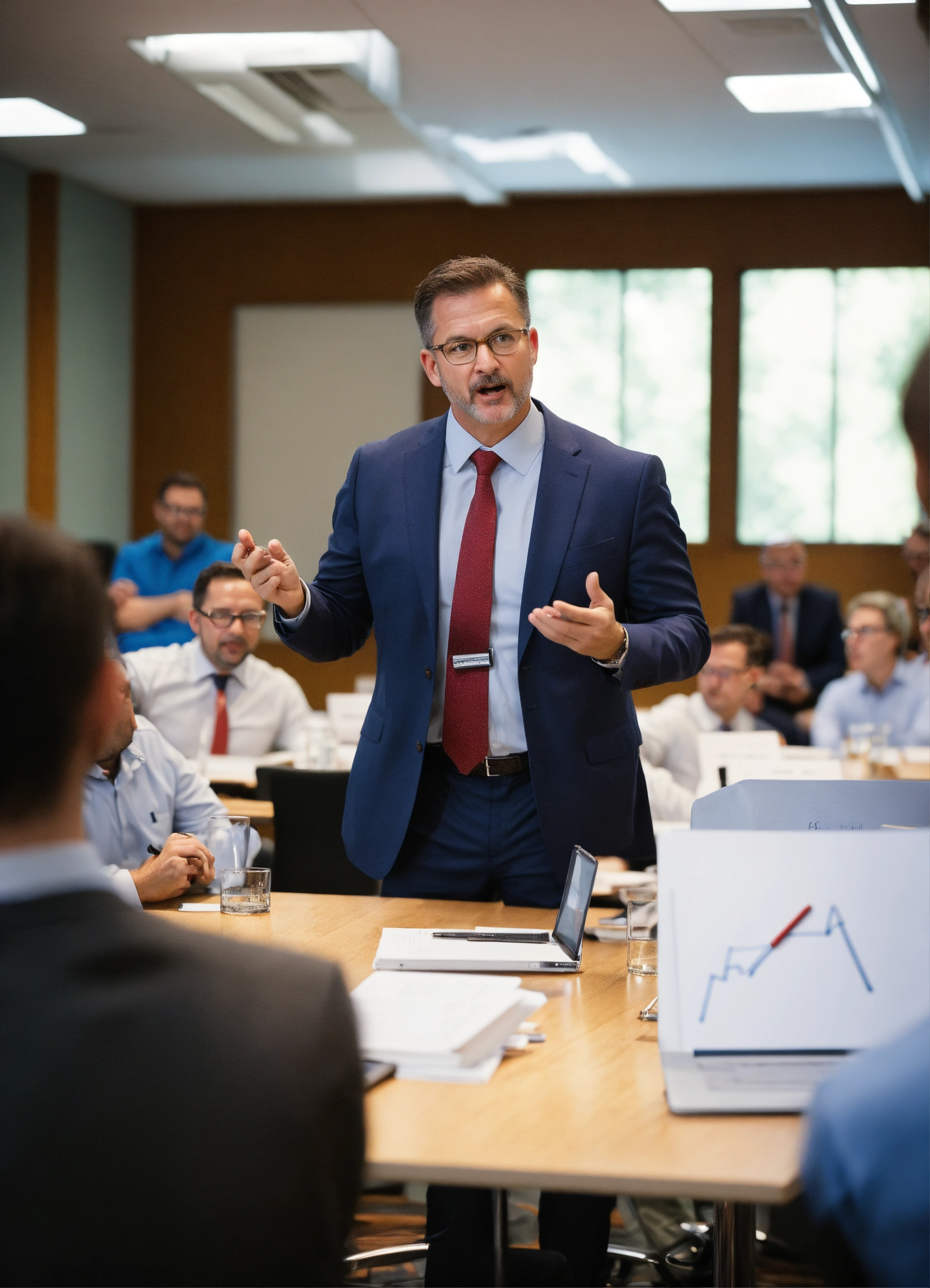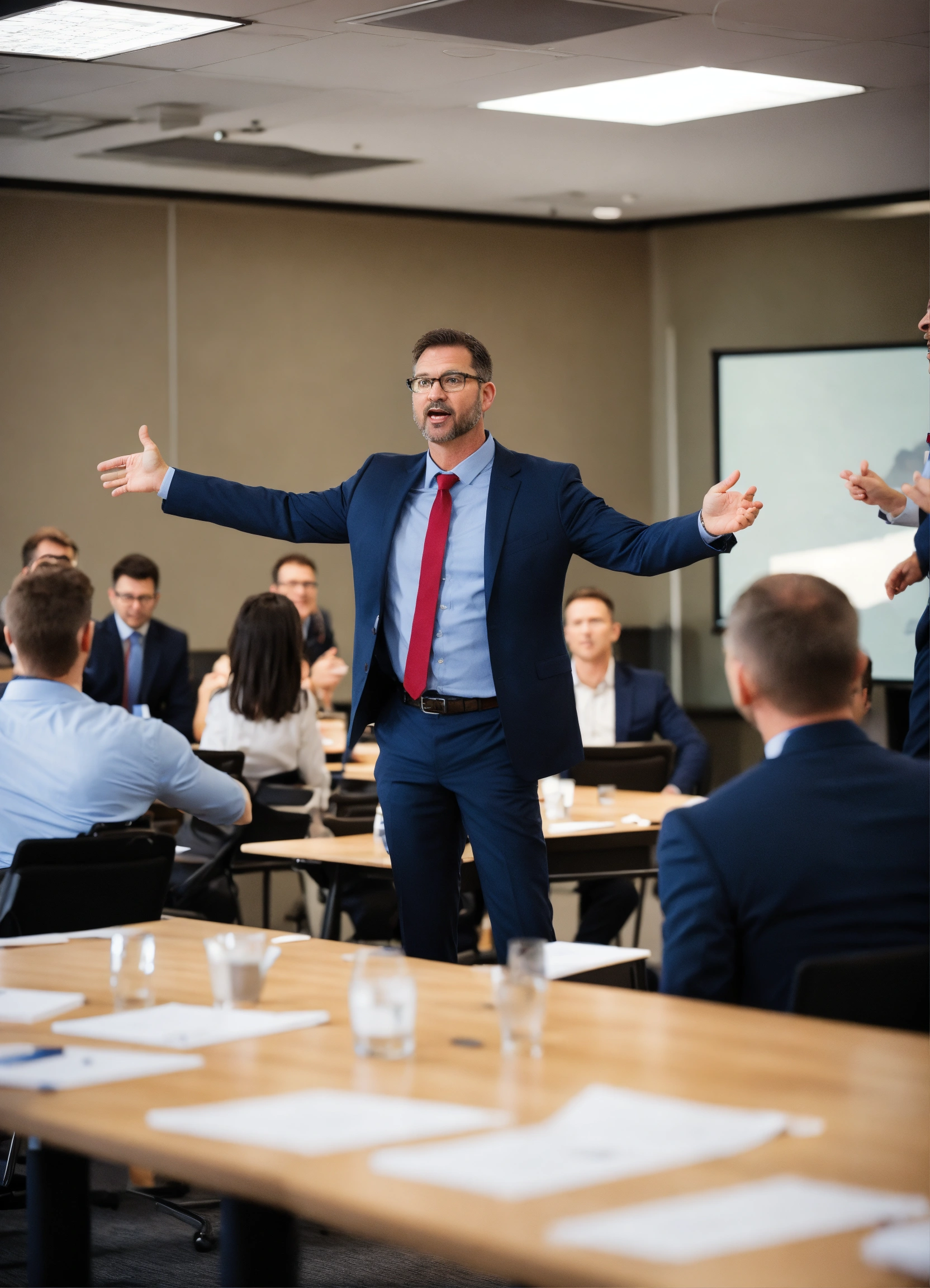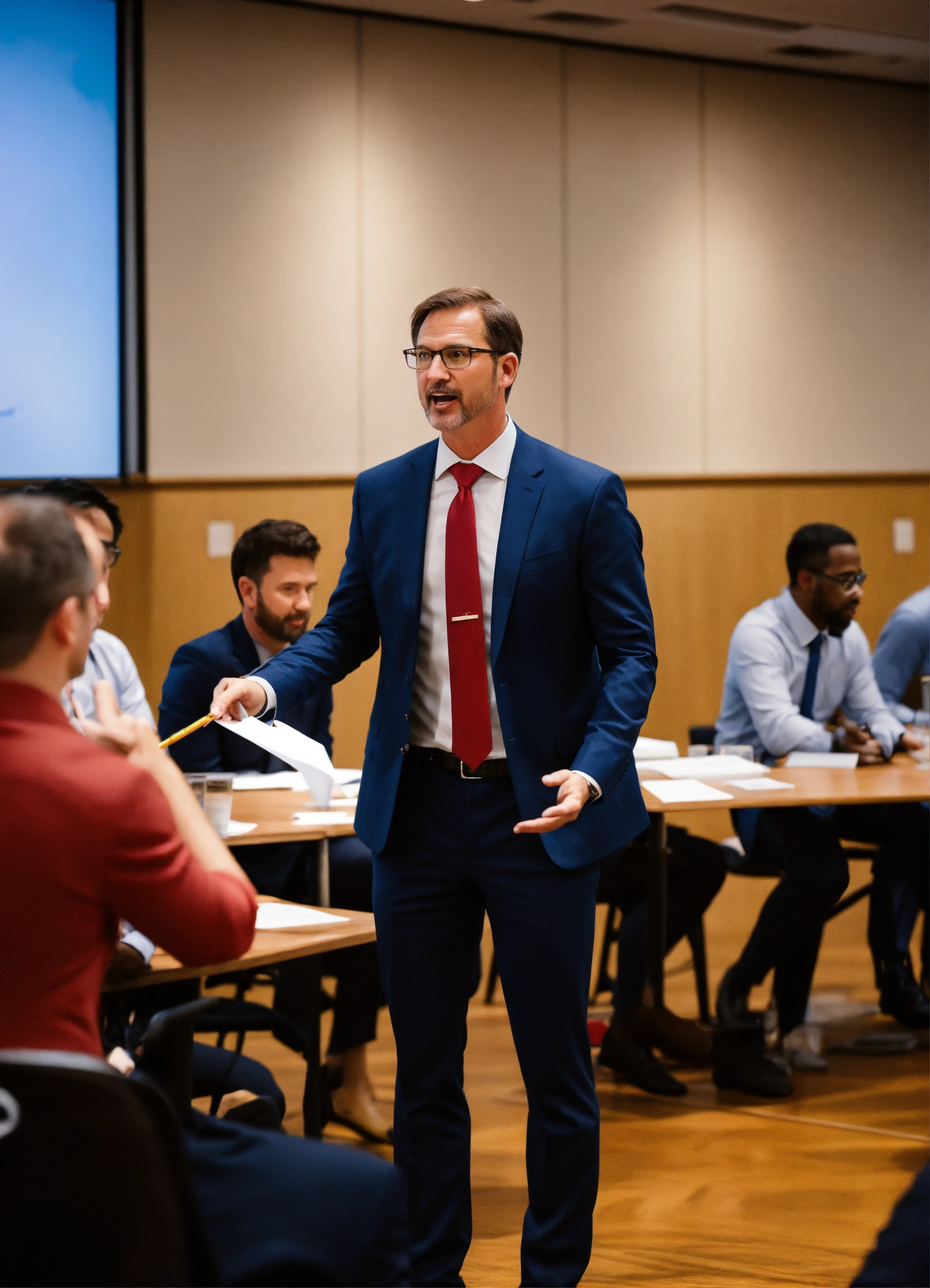 A male leadership coach stands at the front of a modern seminar room, delivering an animated presentation to a group of 10 men sitting at tables and listening attentively. the coach is in his late 40s, with short brown hair and glasses, wearing a navy suit, white shirt, and red tie. he gestures expressively with his arms outstretched as he talks about techniques to inspire, motivate and bring out the best in their teams. the audience members are dressed in business casual attire, taking notes and engaged with focused expressions. large windows flood the room with natural light. the image captures the energy and wisdom the coach is sharing to develop leadership excellence in the male professionals.