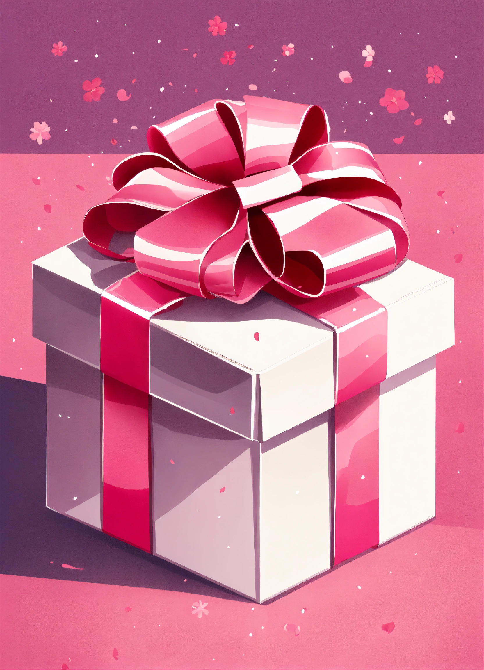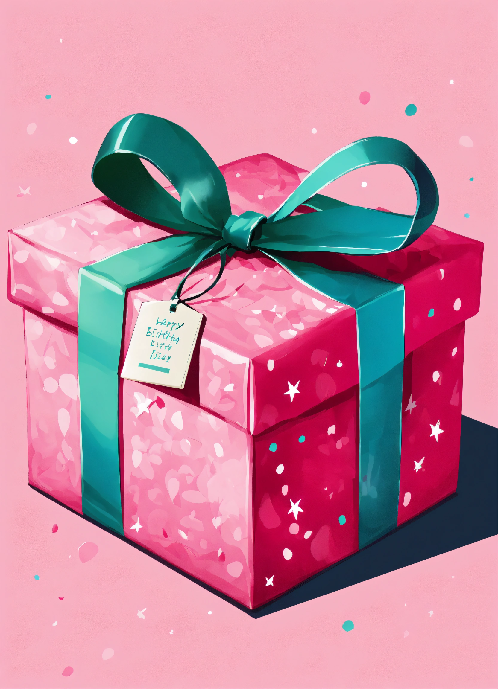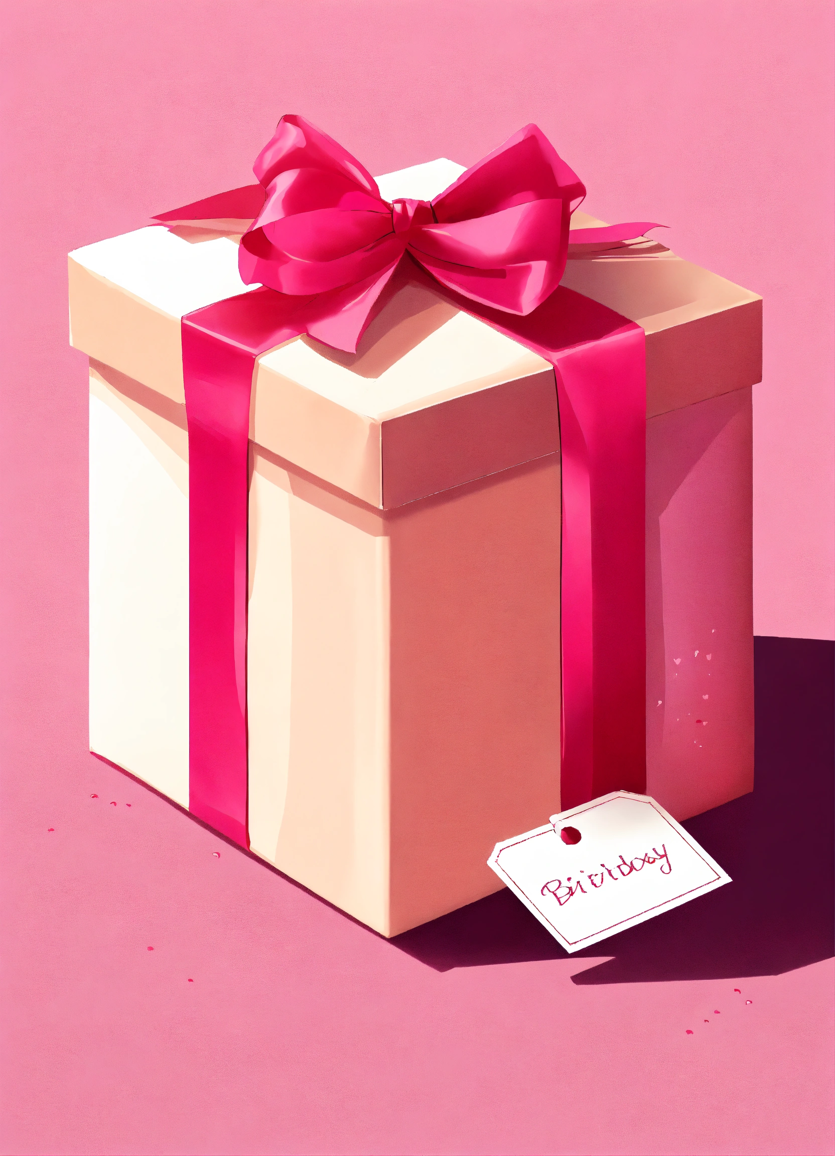 Illustration of a beautifully wrapped pink birthday present with ribbon a big bow and a tag