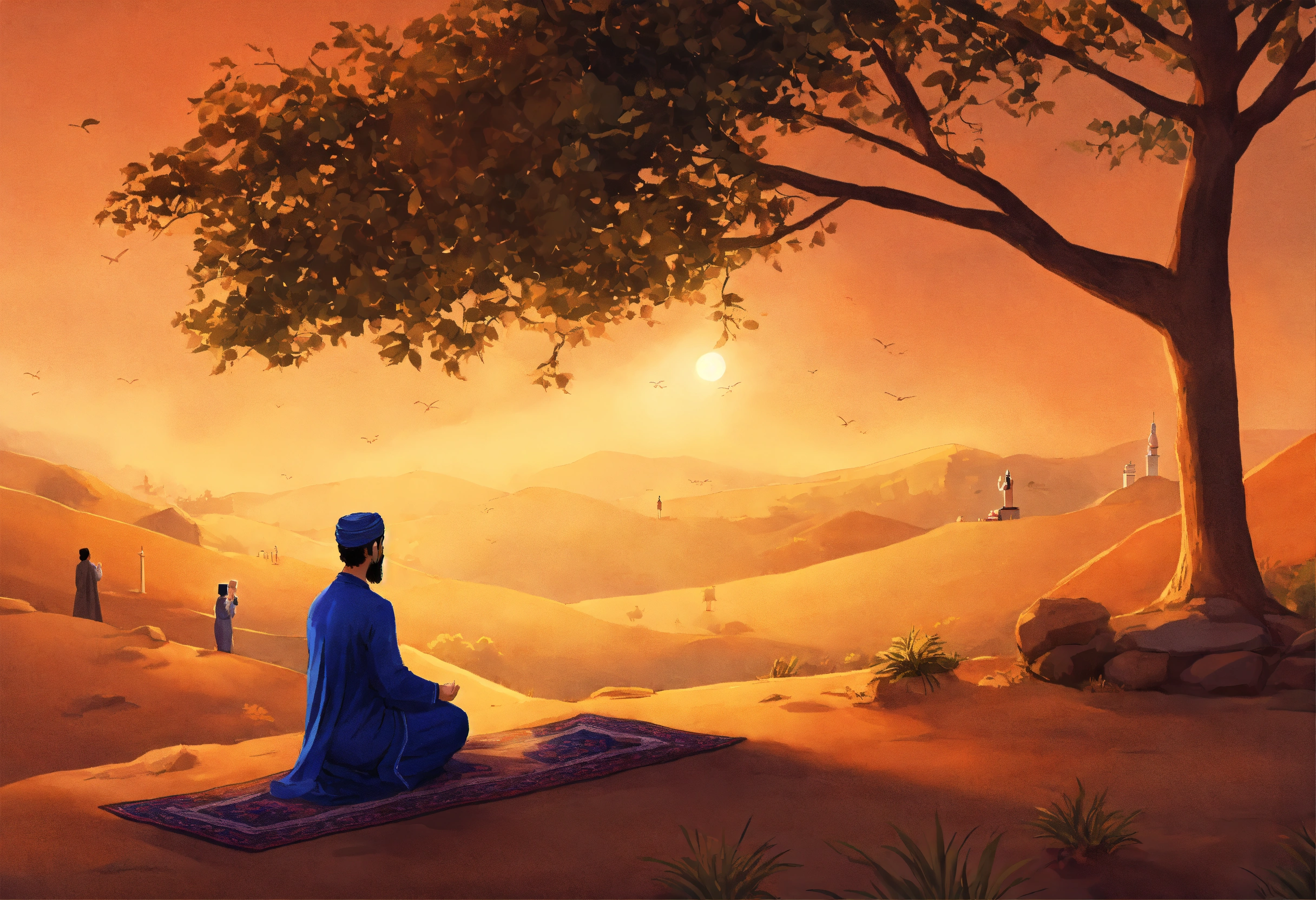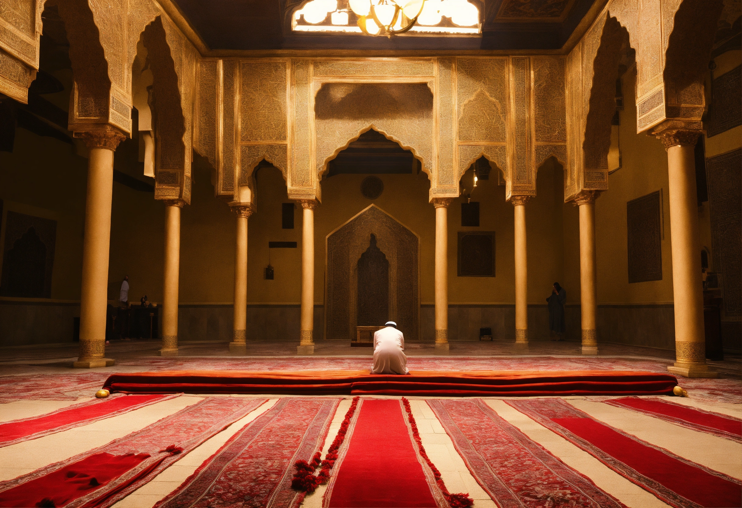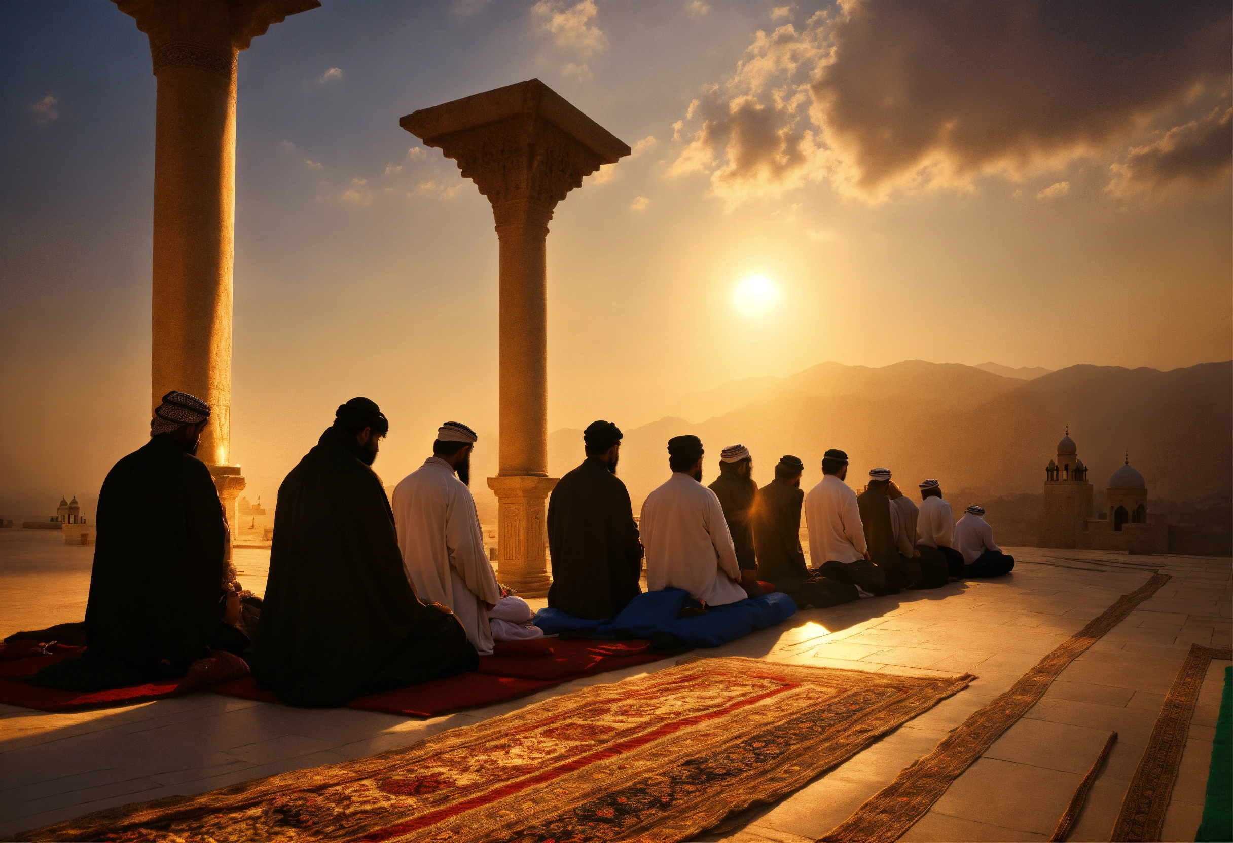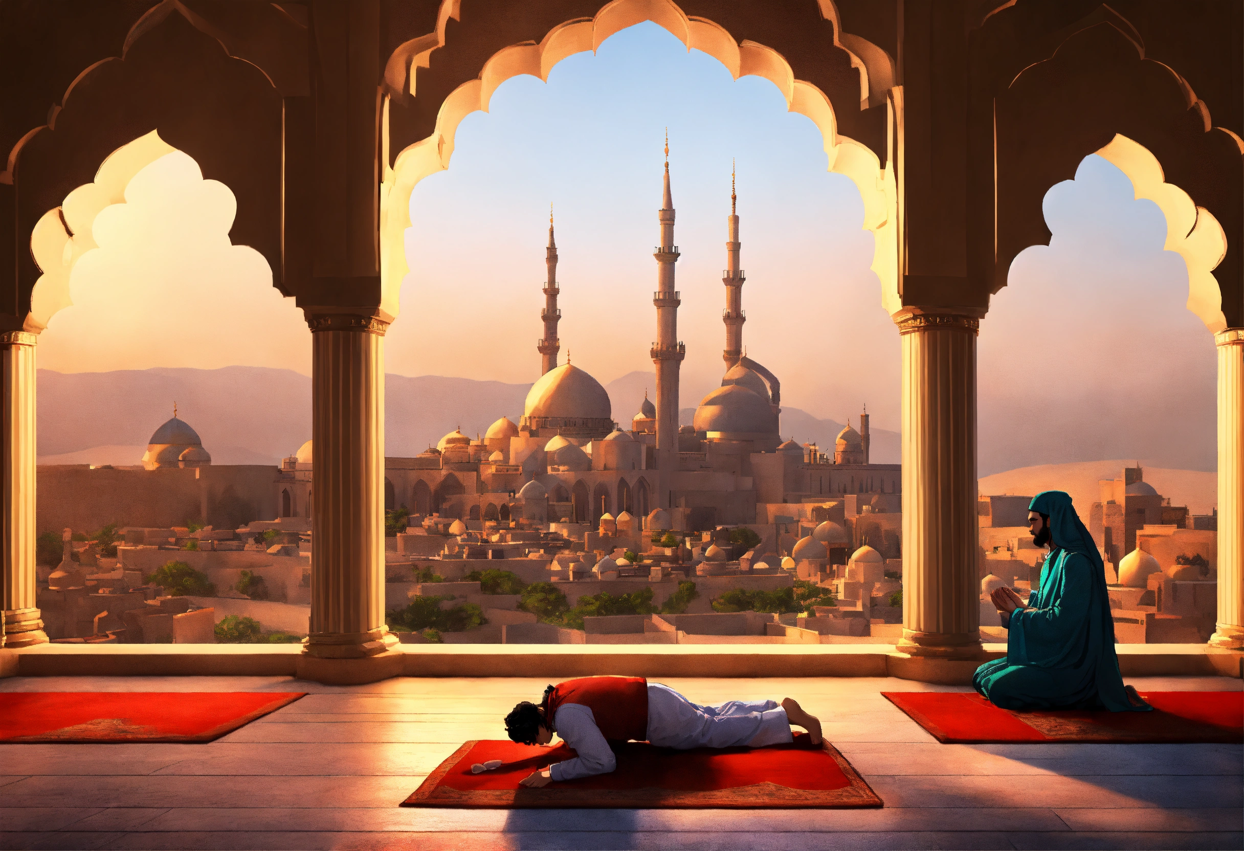 Prompt for "shahada" (faith) prompt for "salah" (prayer) generate visuals for "صلوٰۃ" (salah), representing the act of performing prayers. show a person or a group of people praying in a peaceful setting.