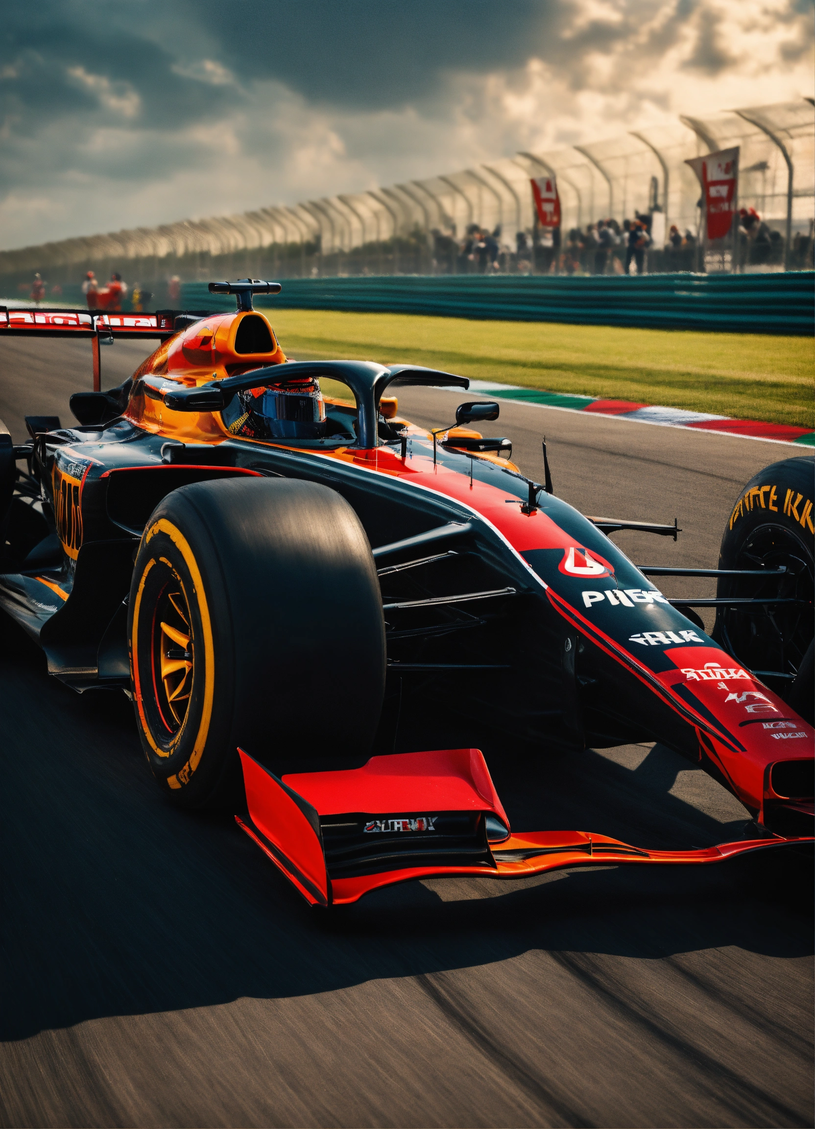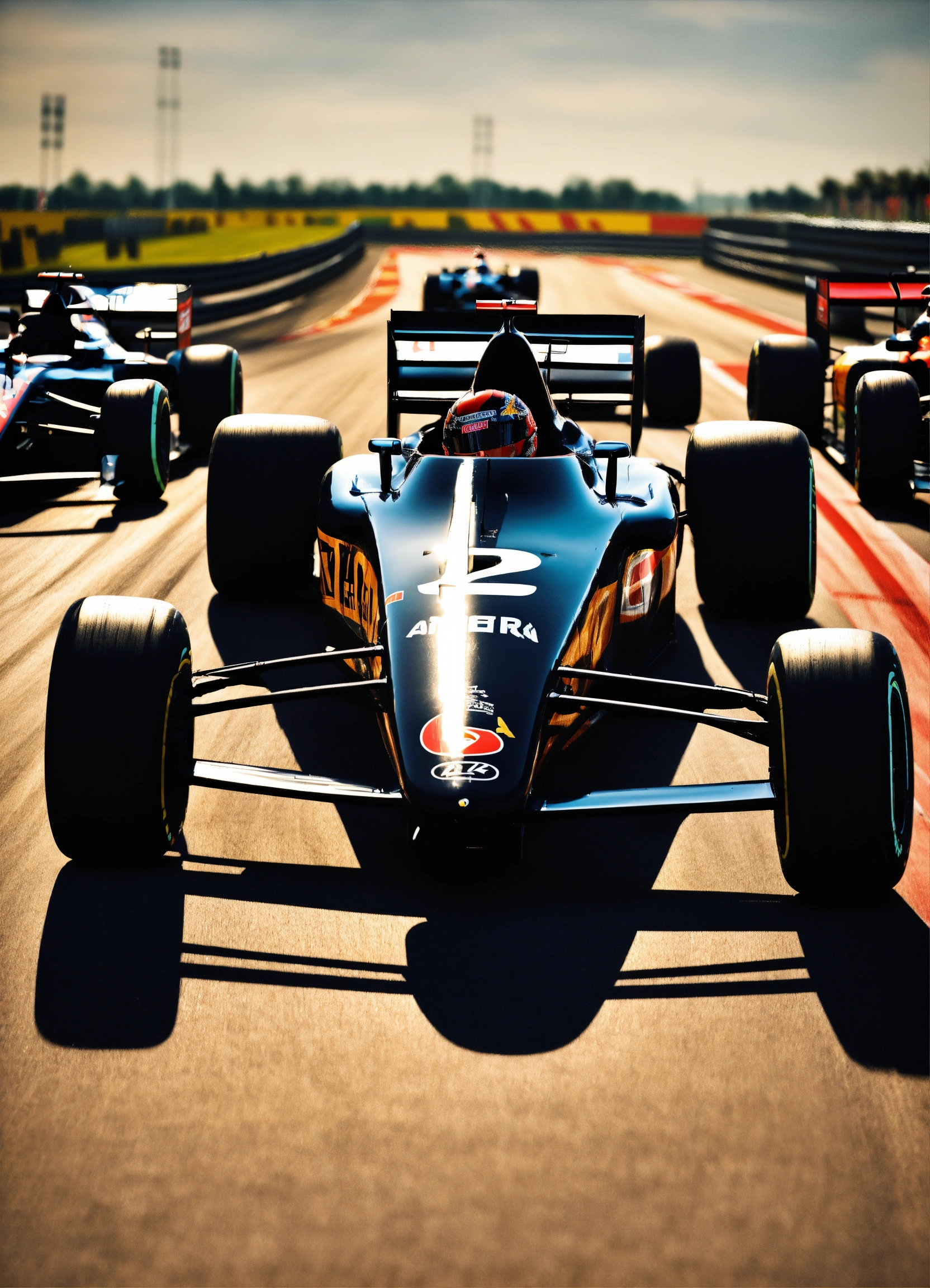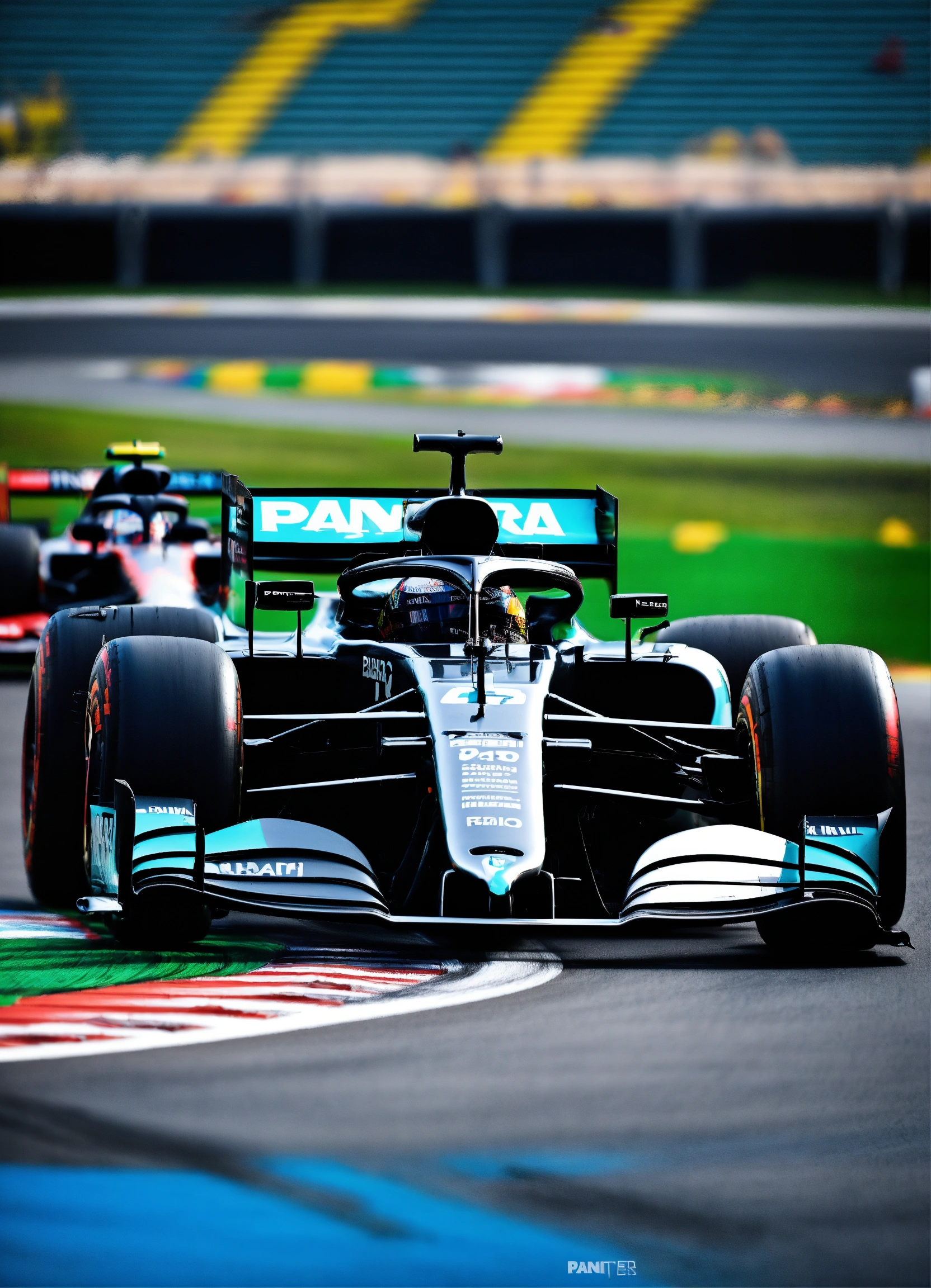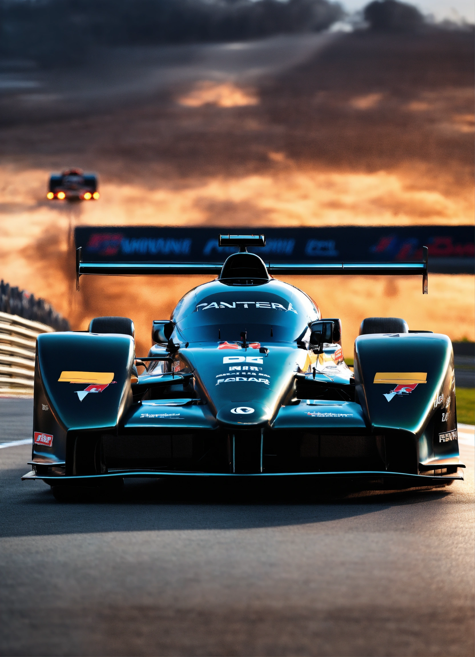 Pantera negra, posando para foto ao lado de um carro de corrida, em uma pista de formula 1 desenho realista 8k
