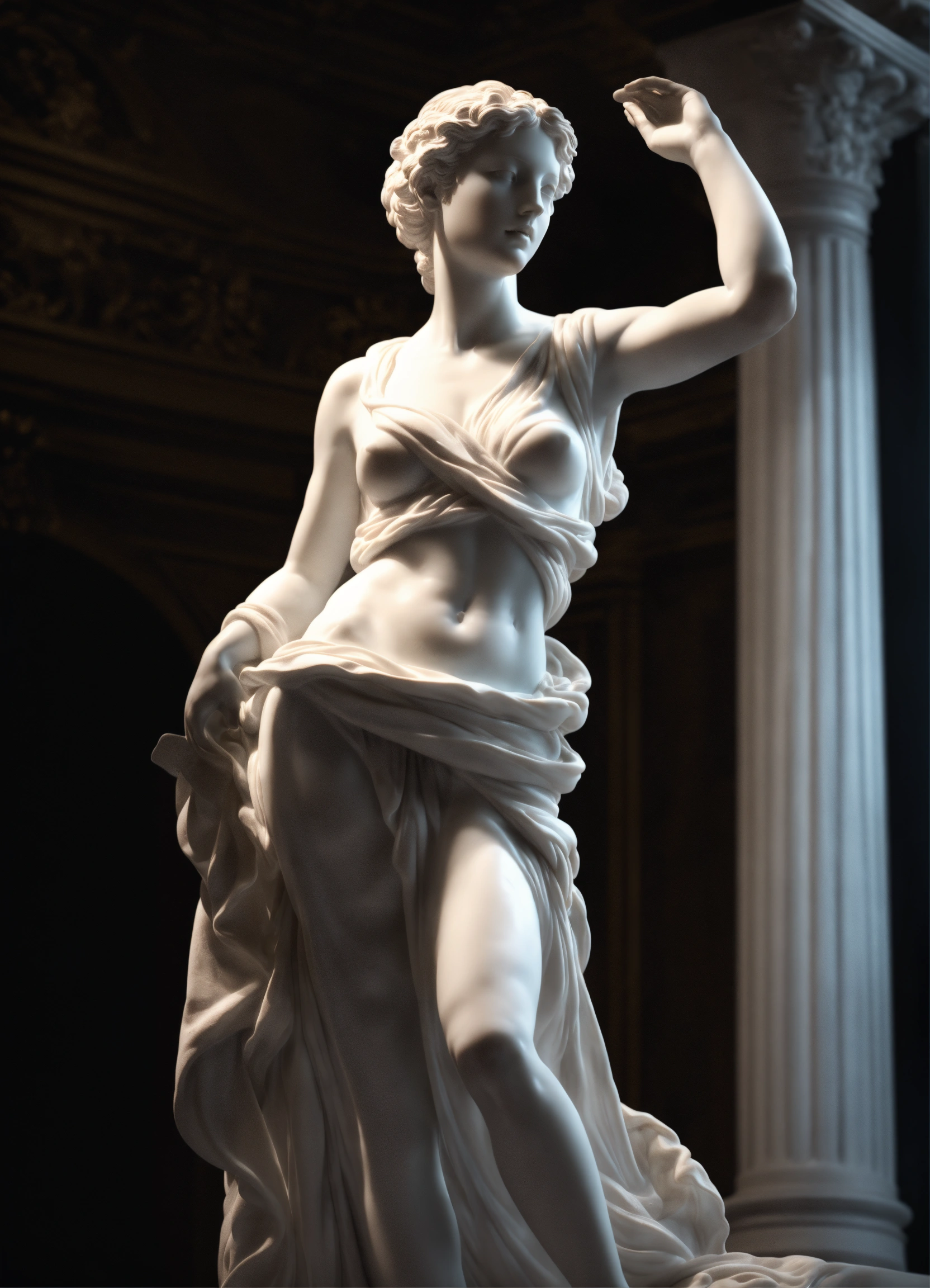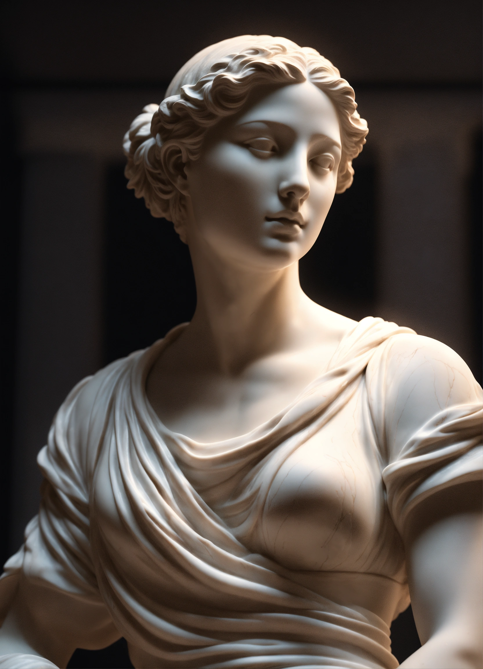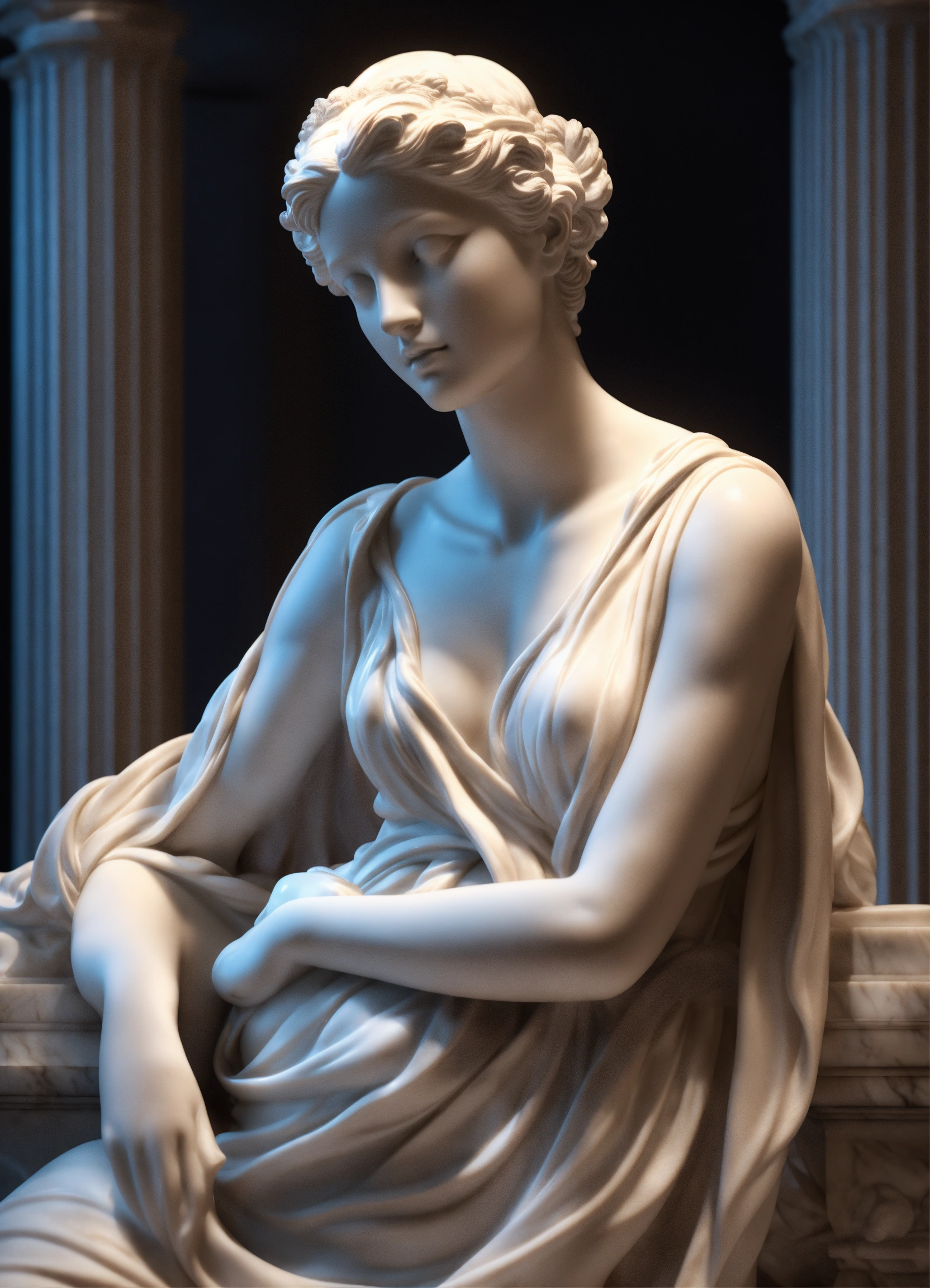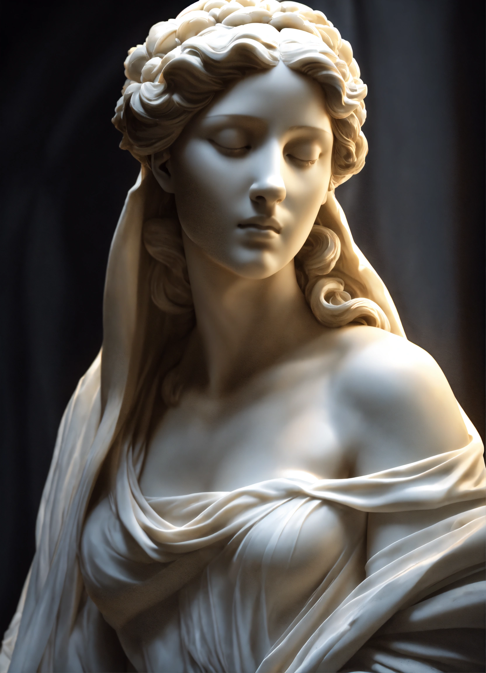 Canova michelangelo sculpture of woman in white marble, full character art in blender 3d using low and soft lights, loop renderer in ethereal mystical atmosphere, 4k, soft details, wlop, vray, absolute black background.