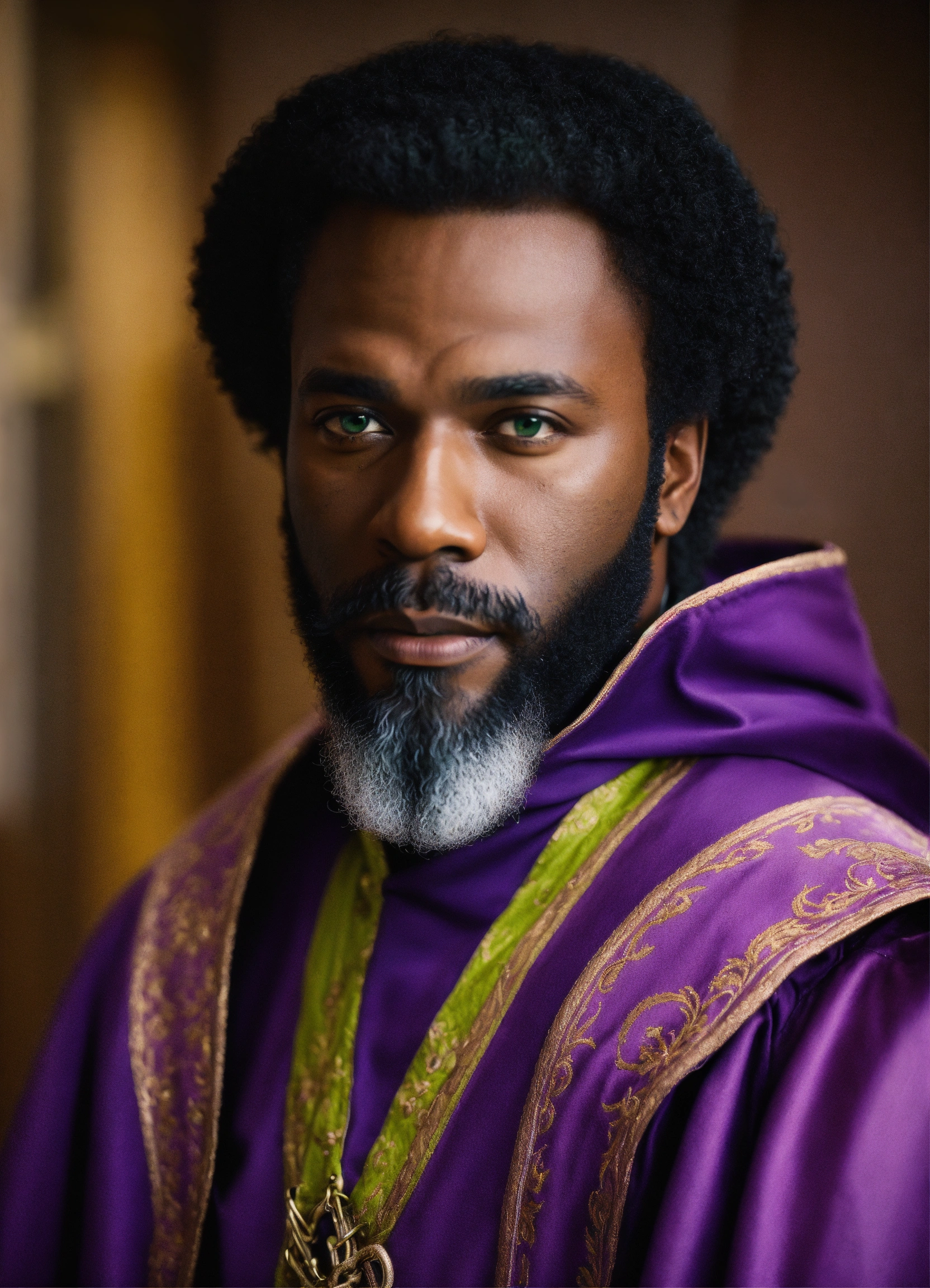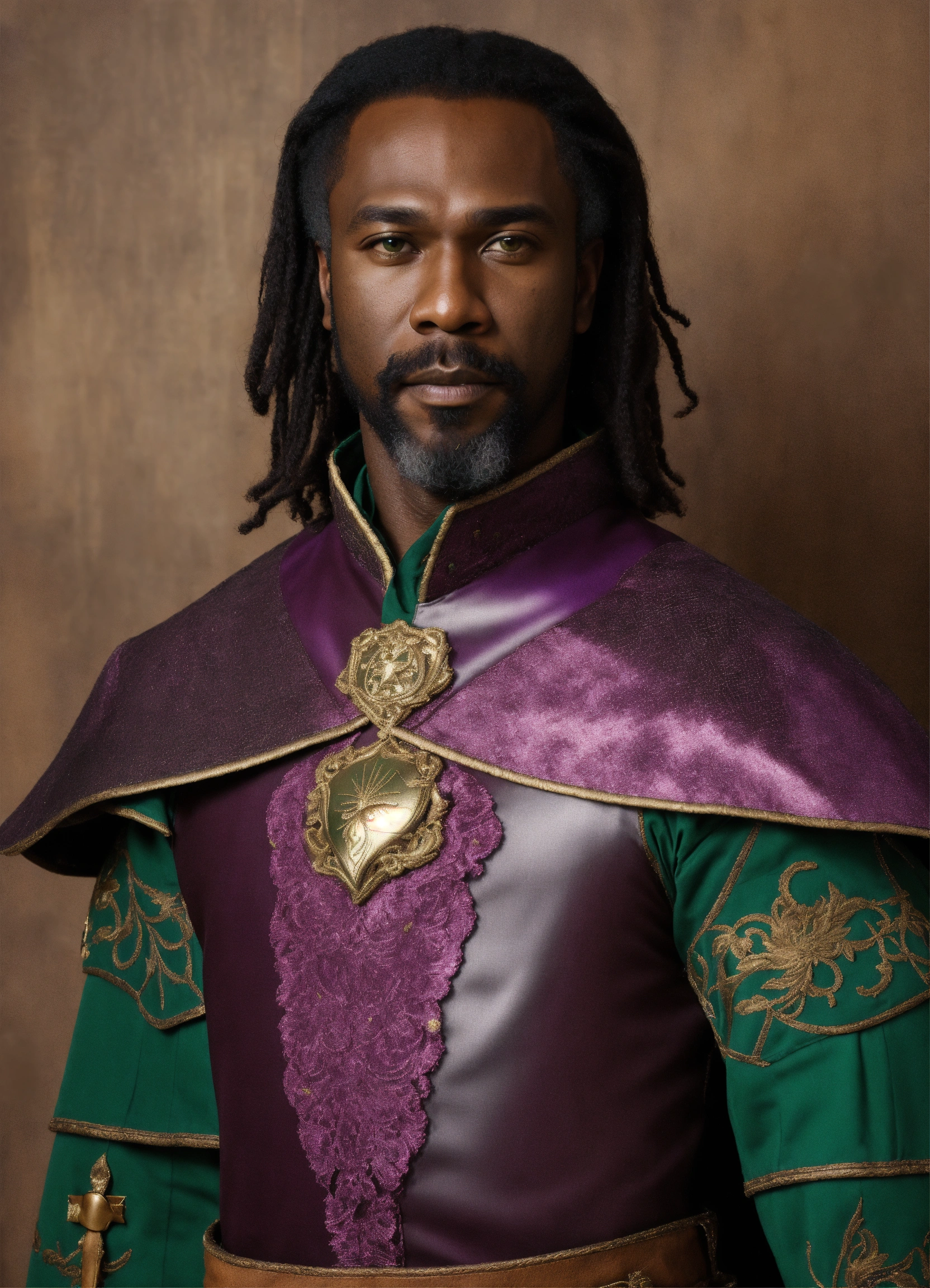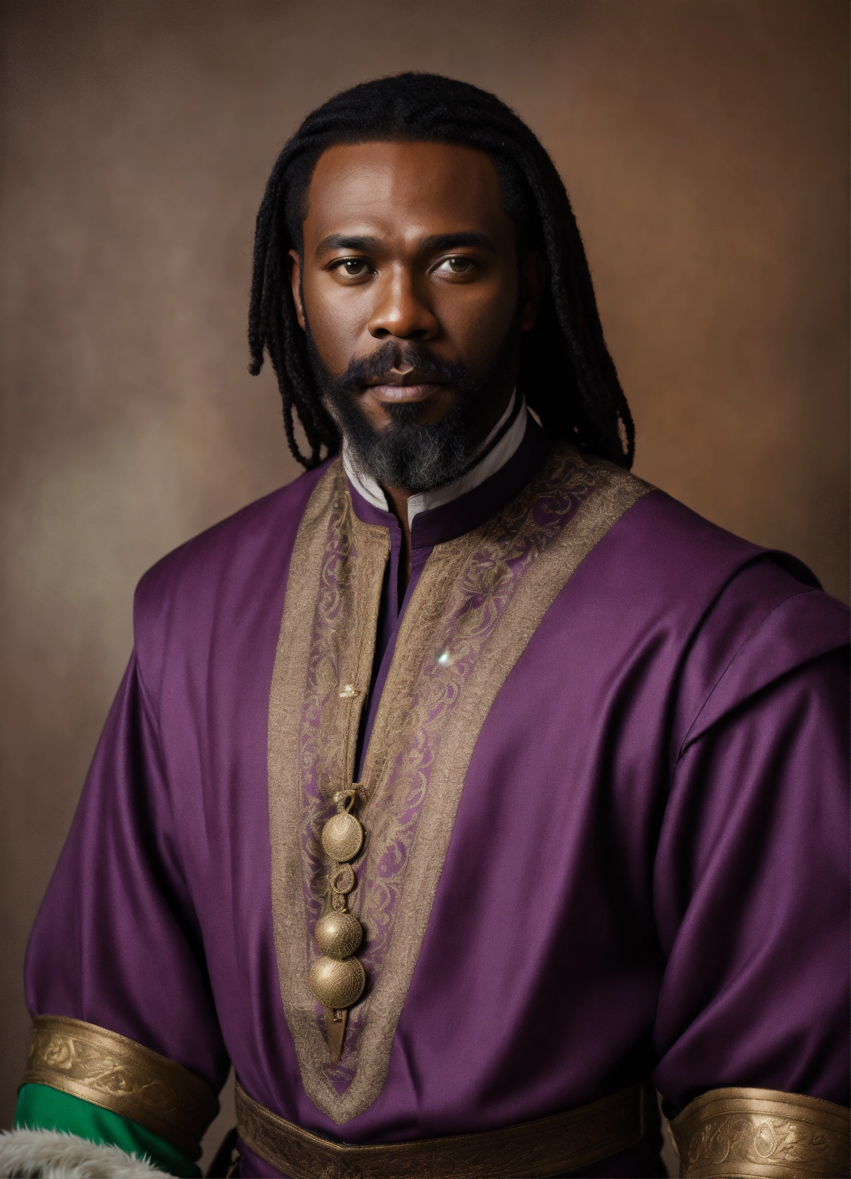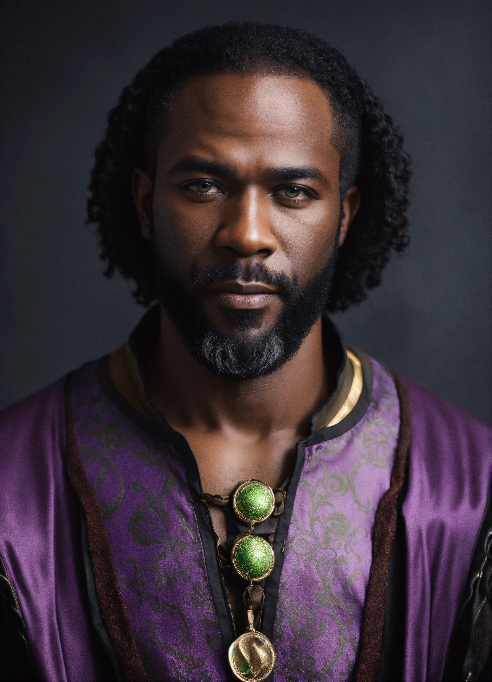 A portrait photo of a deep black man with brown green eyes, straight half-long black hair, 51 years old, wearing a purple medieval tunic, white pants, futuristic boots, and wearing a medium beard