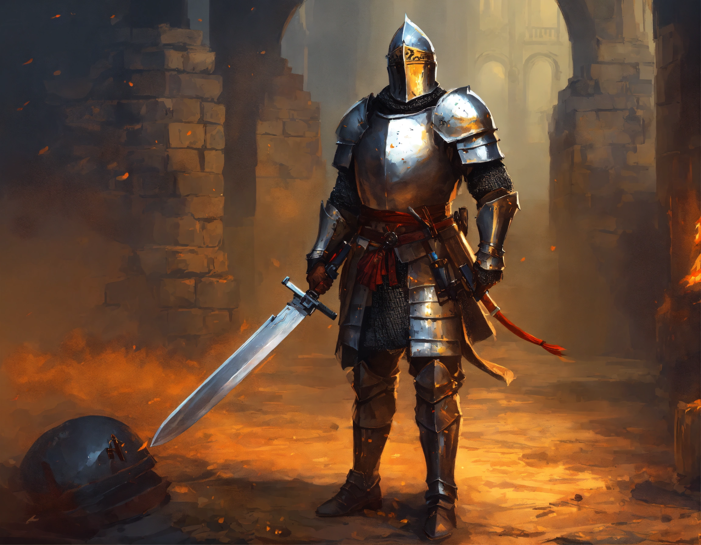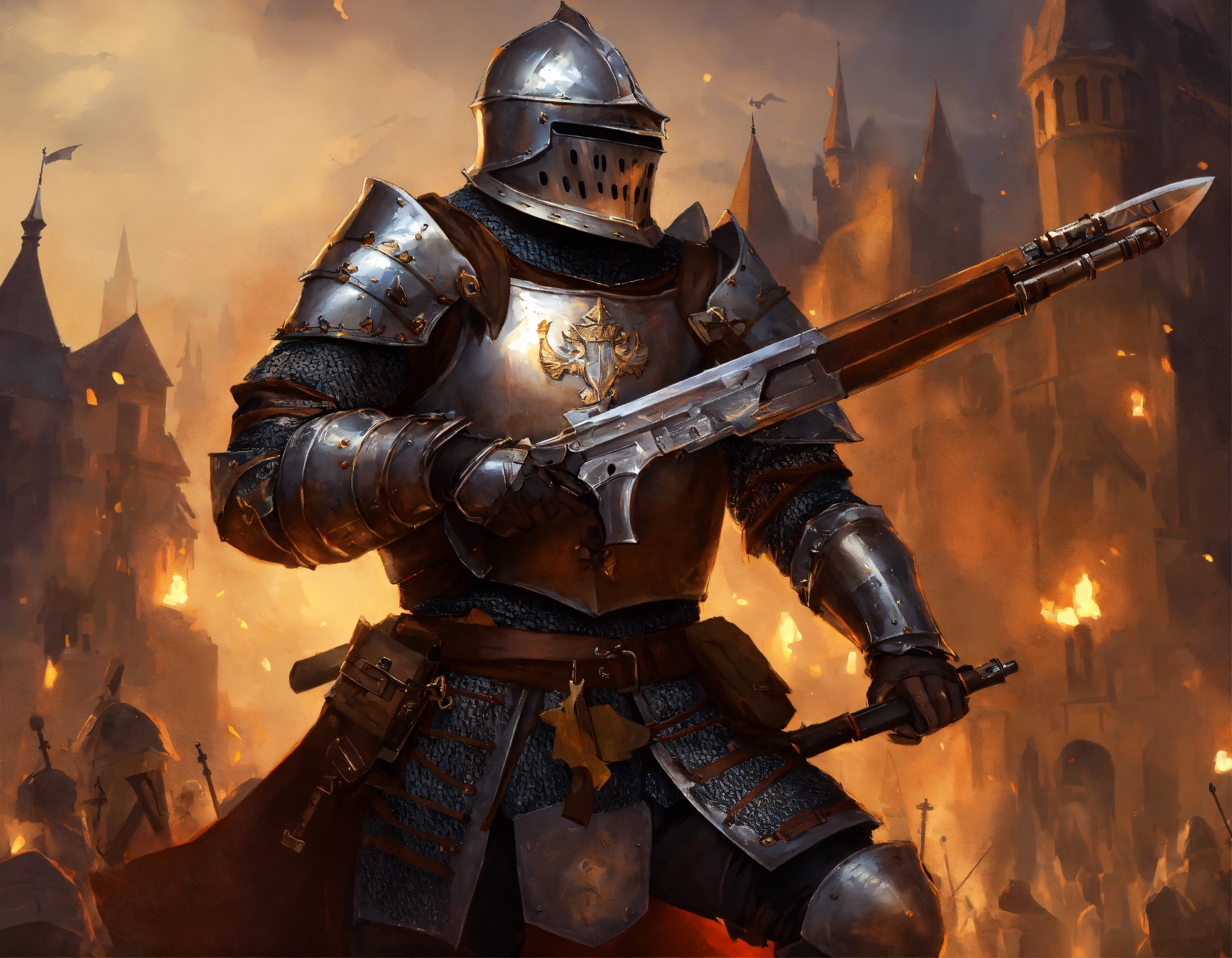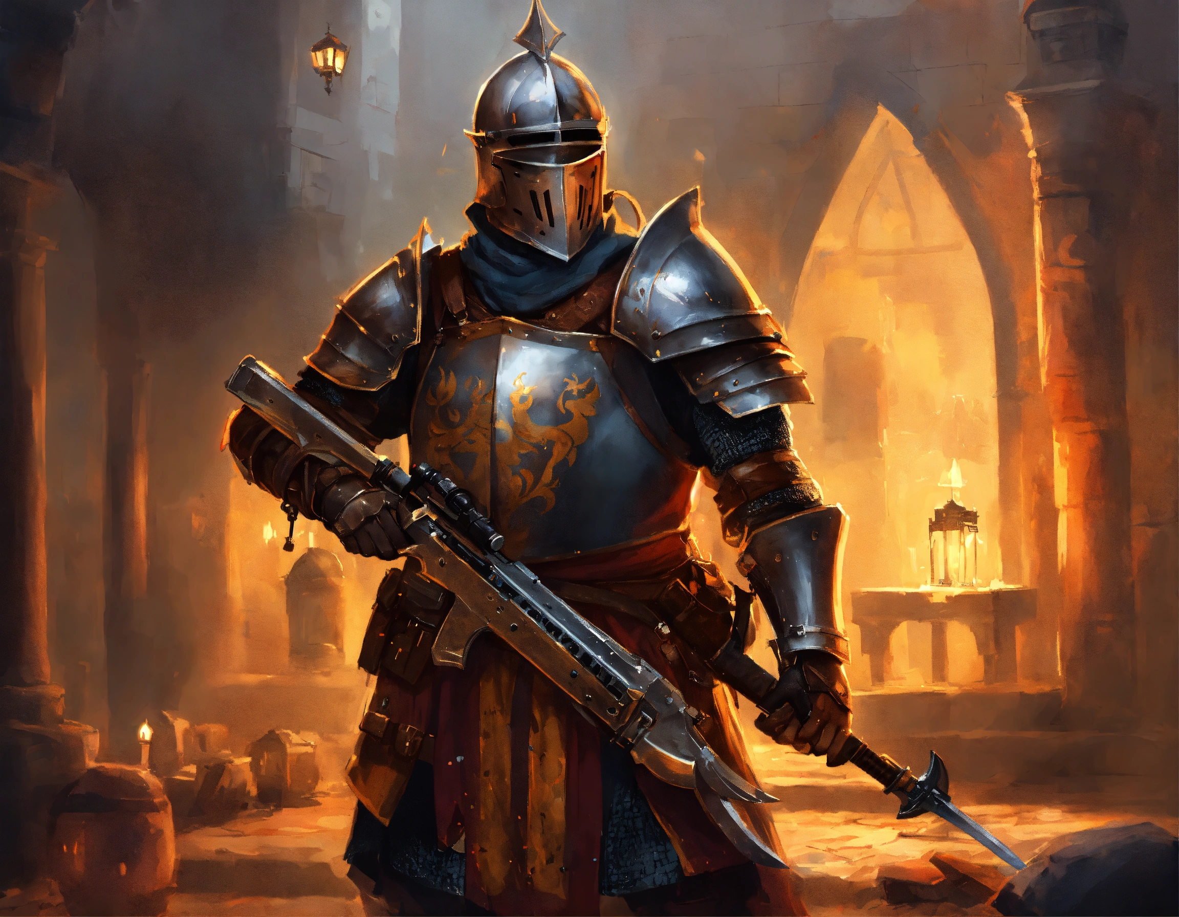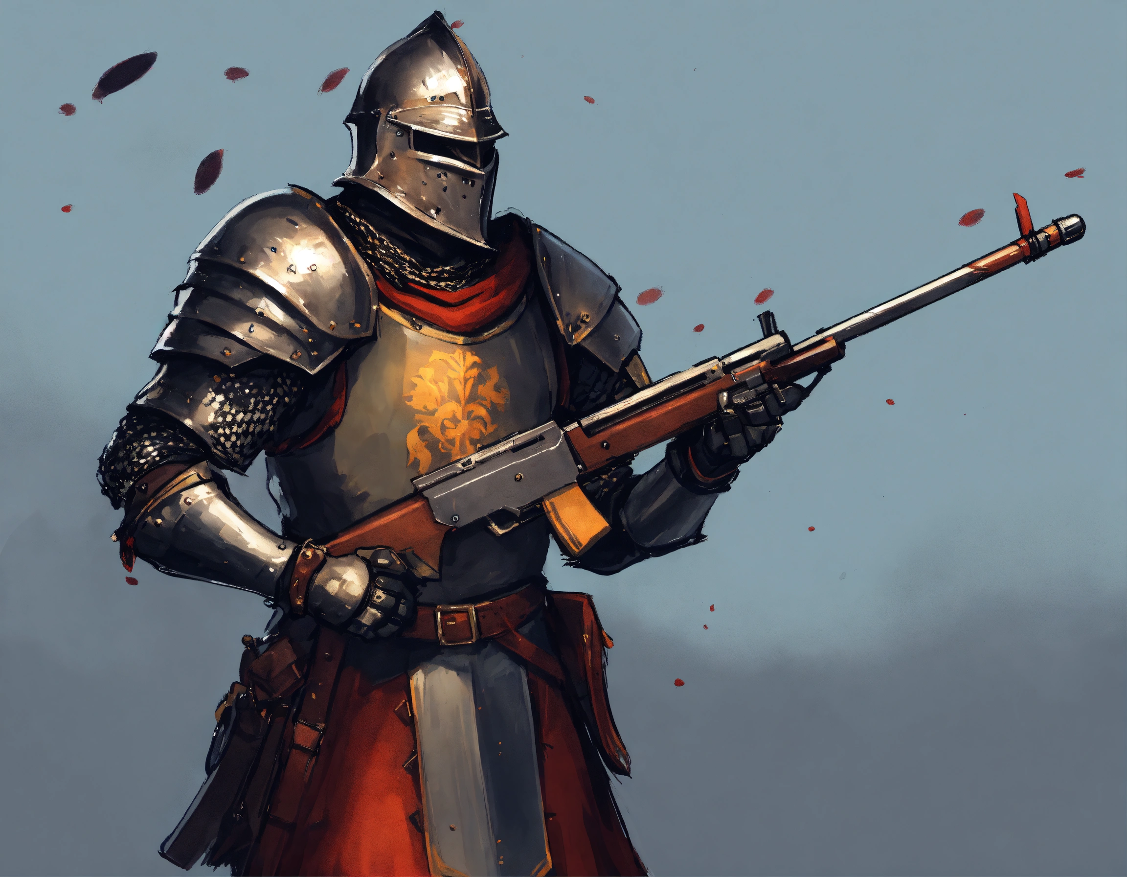 Concept art of a medieval knight with small knives and grenades holding an assault rifle