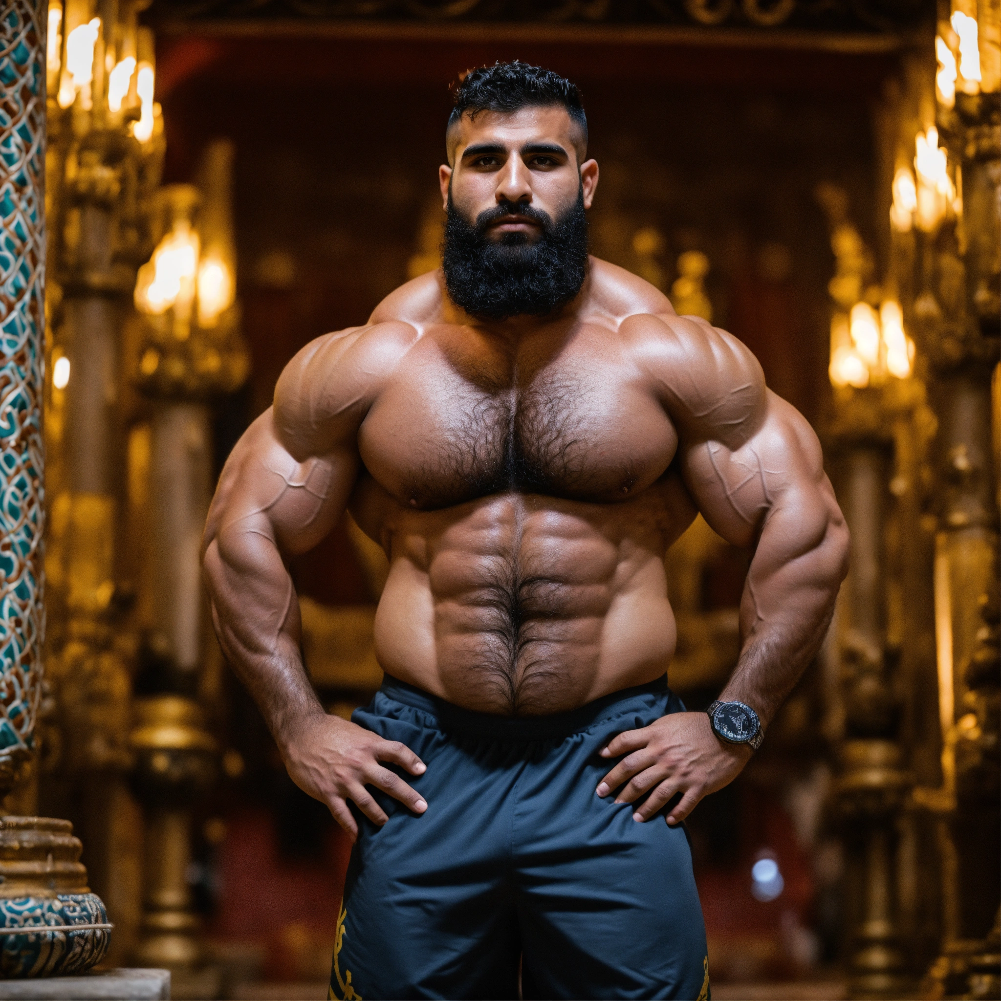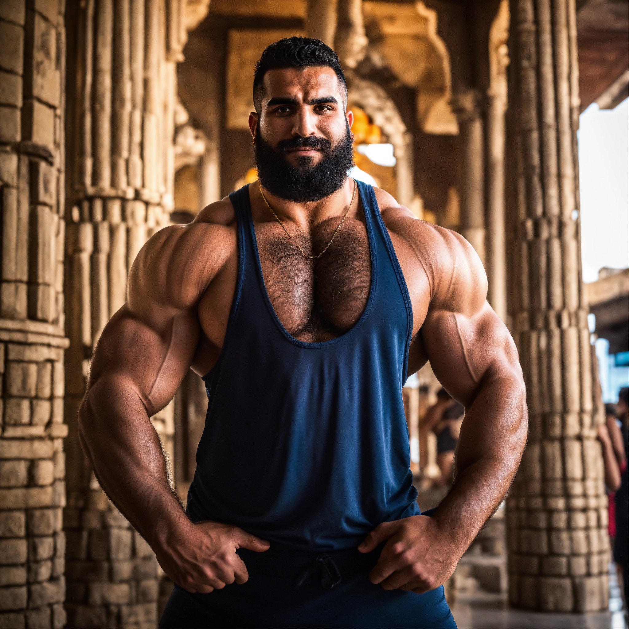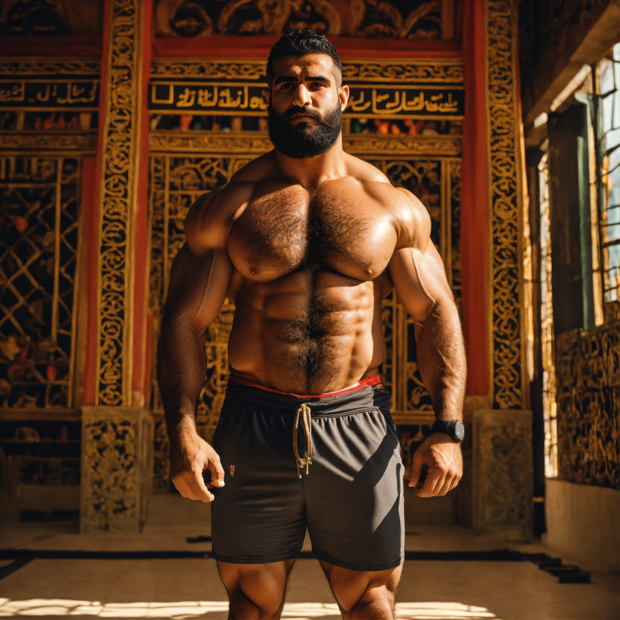 30-year-old hairy palestinian man with big muscles, big bodybuilder, body like a wrestler, in a temple