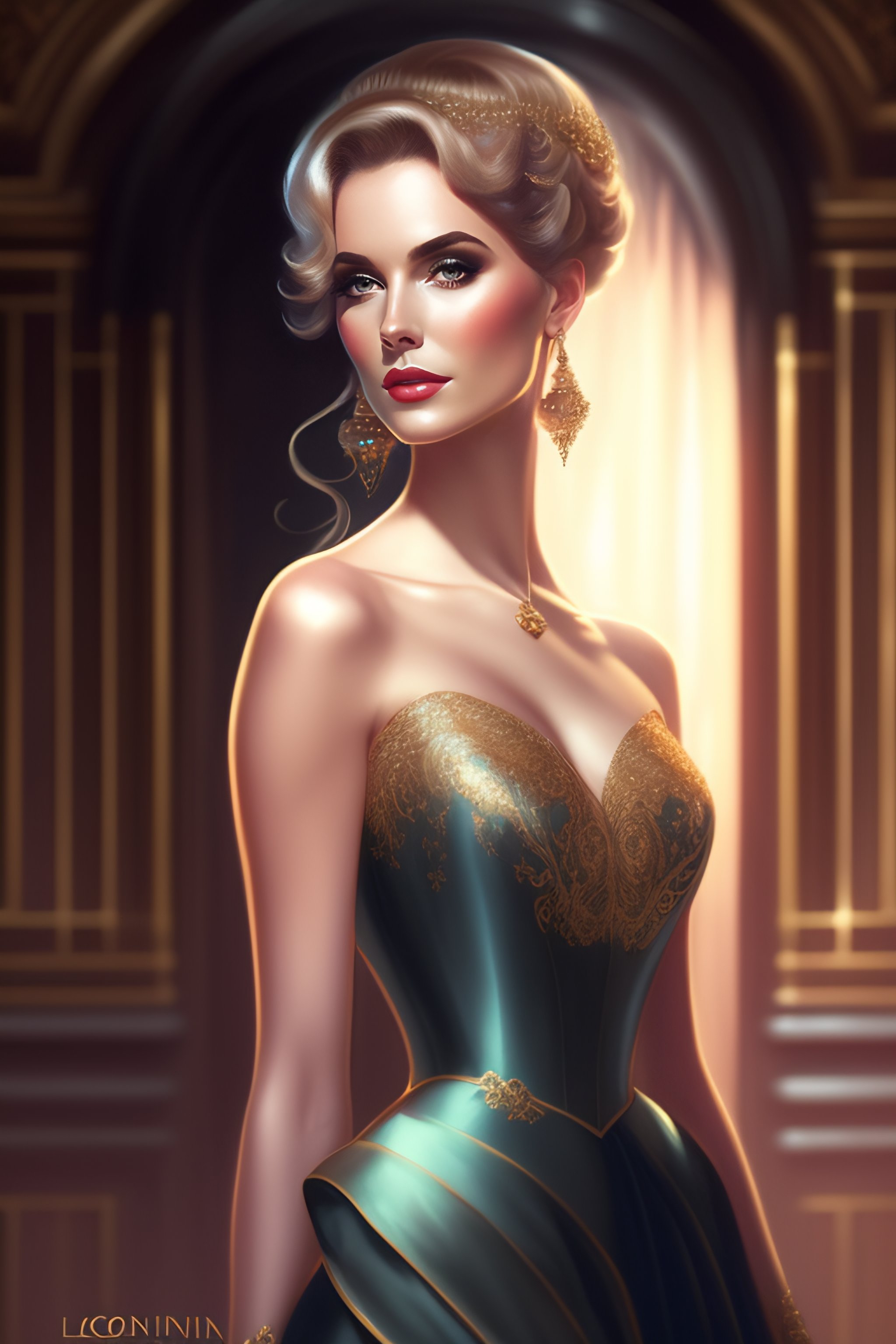 Geeze louise, wearing low cut gown, holding a champaign glass, standing inside a ballroom, character portrait, 1 9 6 0 s, long hair, intricate, elegant, highly detailed, digital painting, artstation, concept art, smooth, sharp focus, illustration, art by wlop, charlie bowater and alexandra fomina