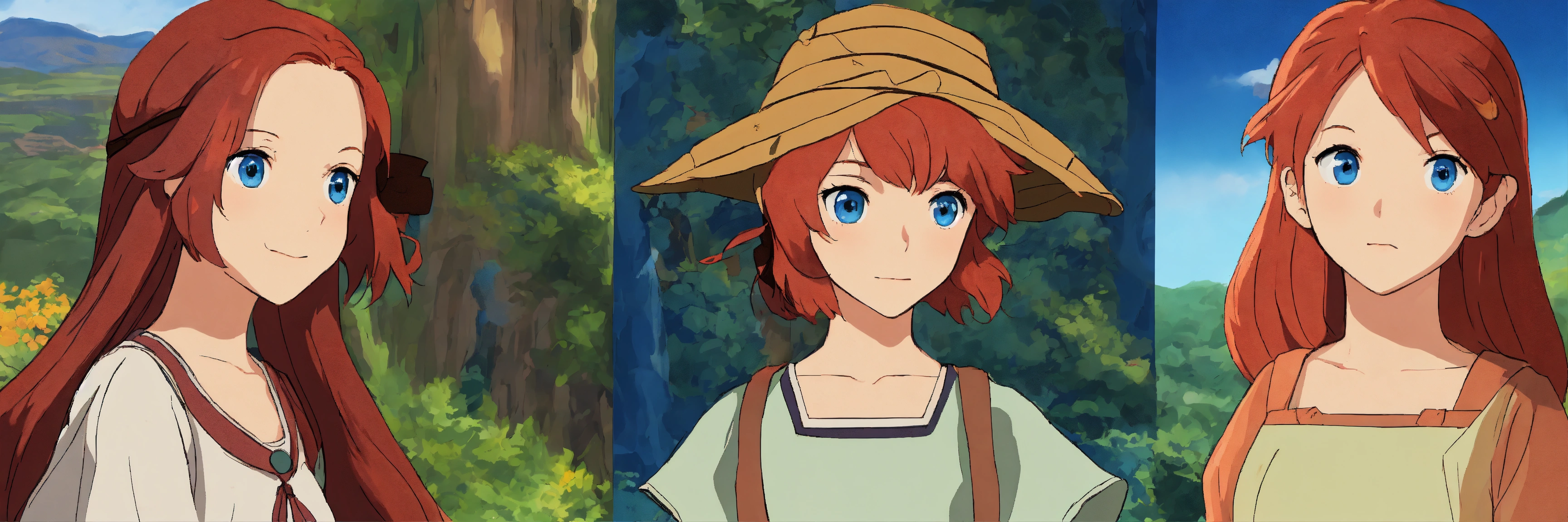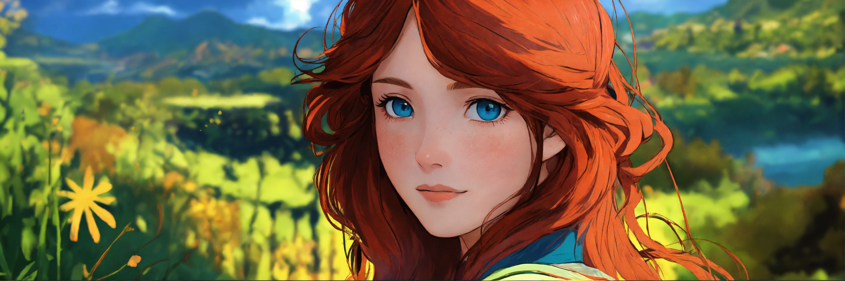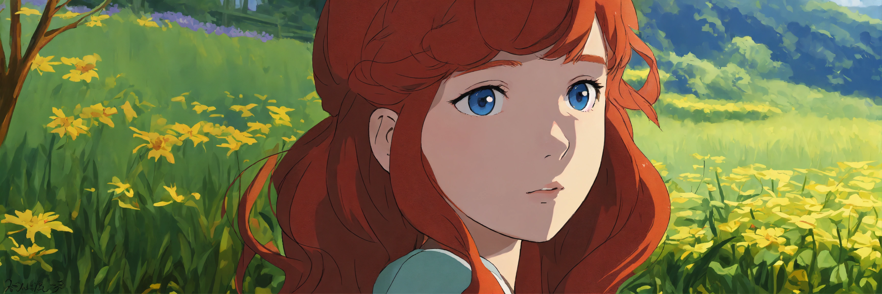 A 15 year old princess, red hair, blue eyes, brown hair. simple art inspired by the visual style of studio ghibli.