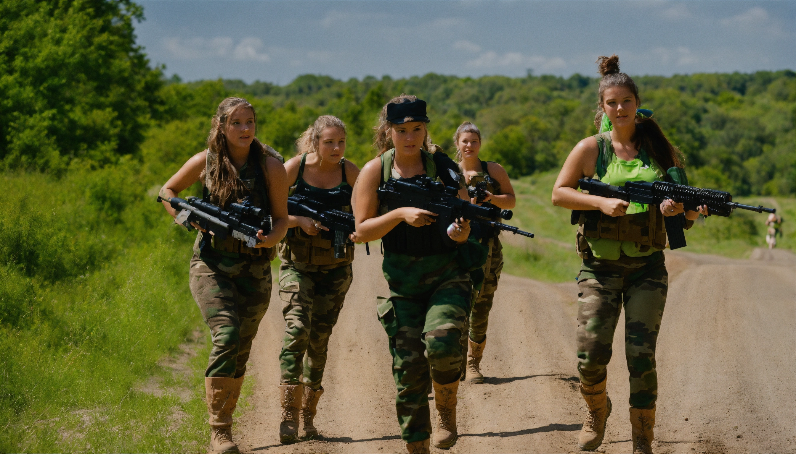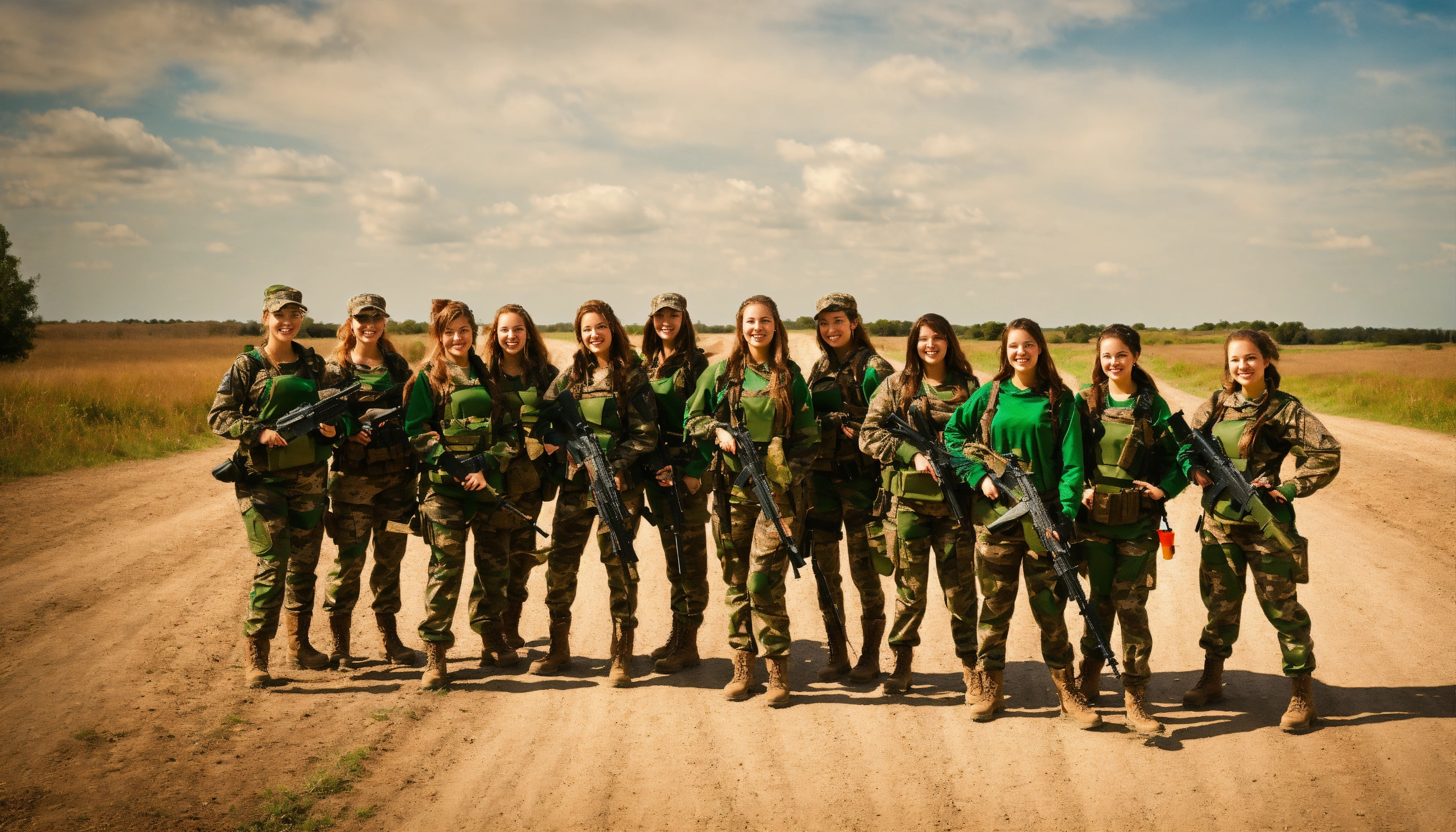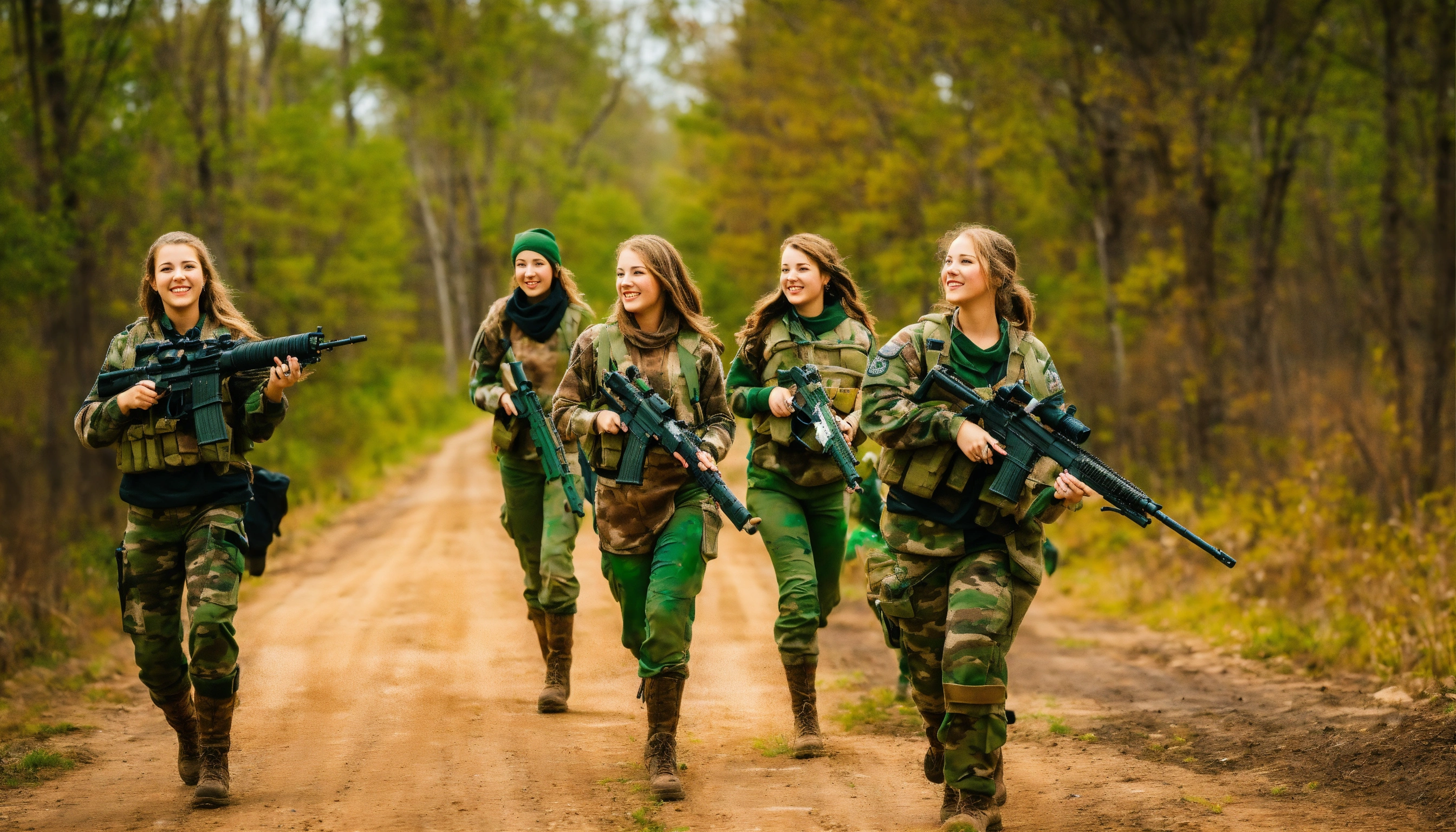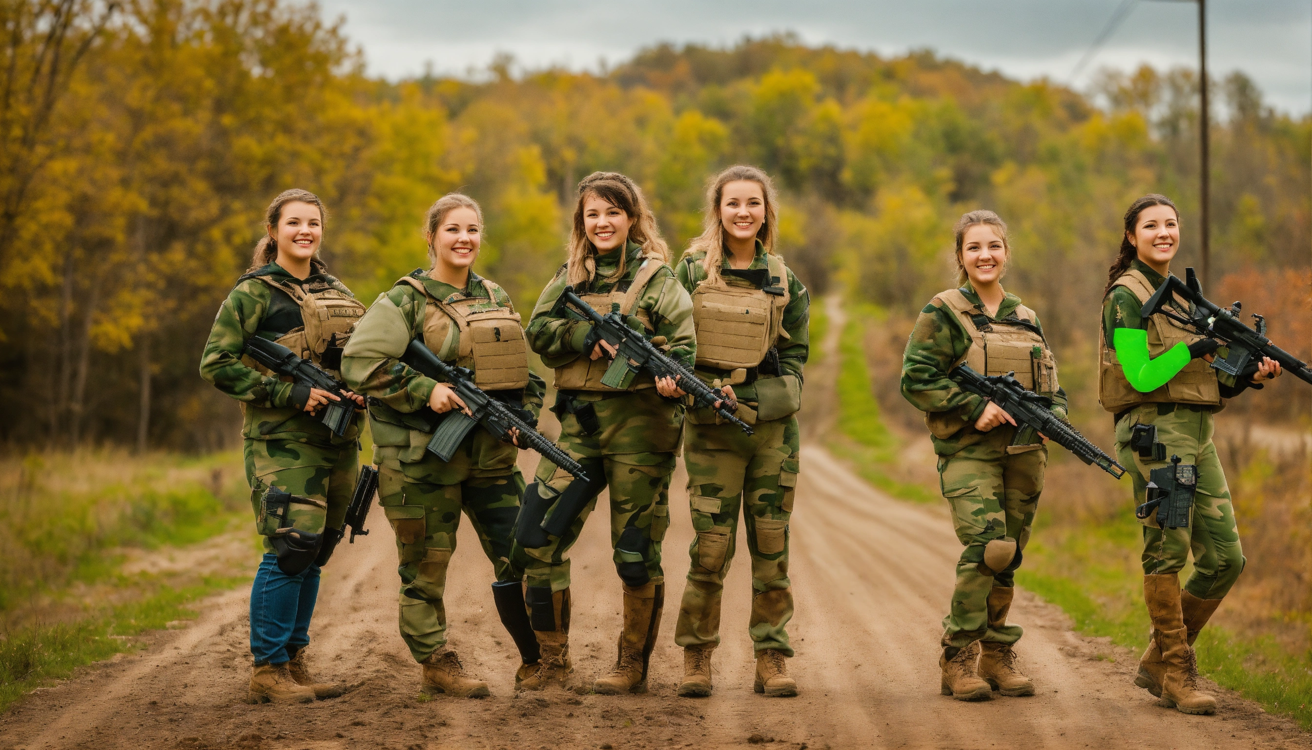 Group of college age women, wearing green and brown camouflage gear, paint ball guns, country dirt road