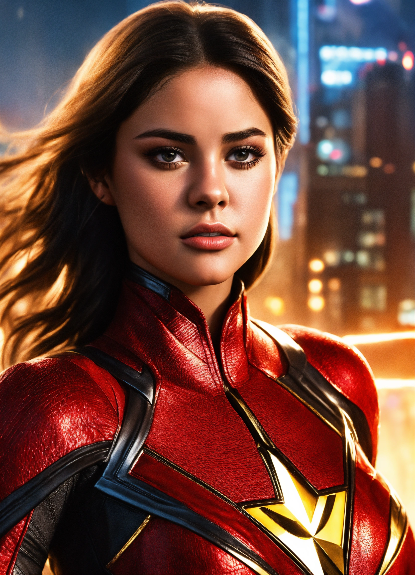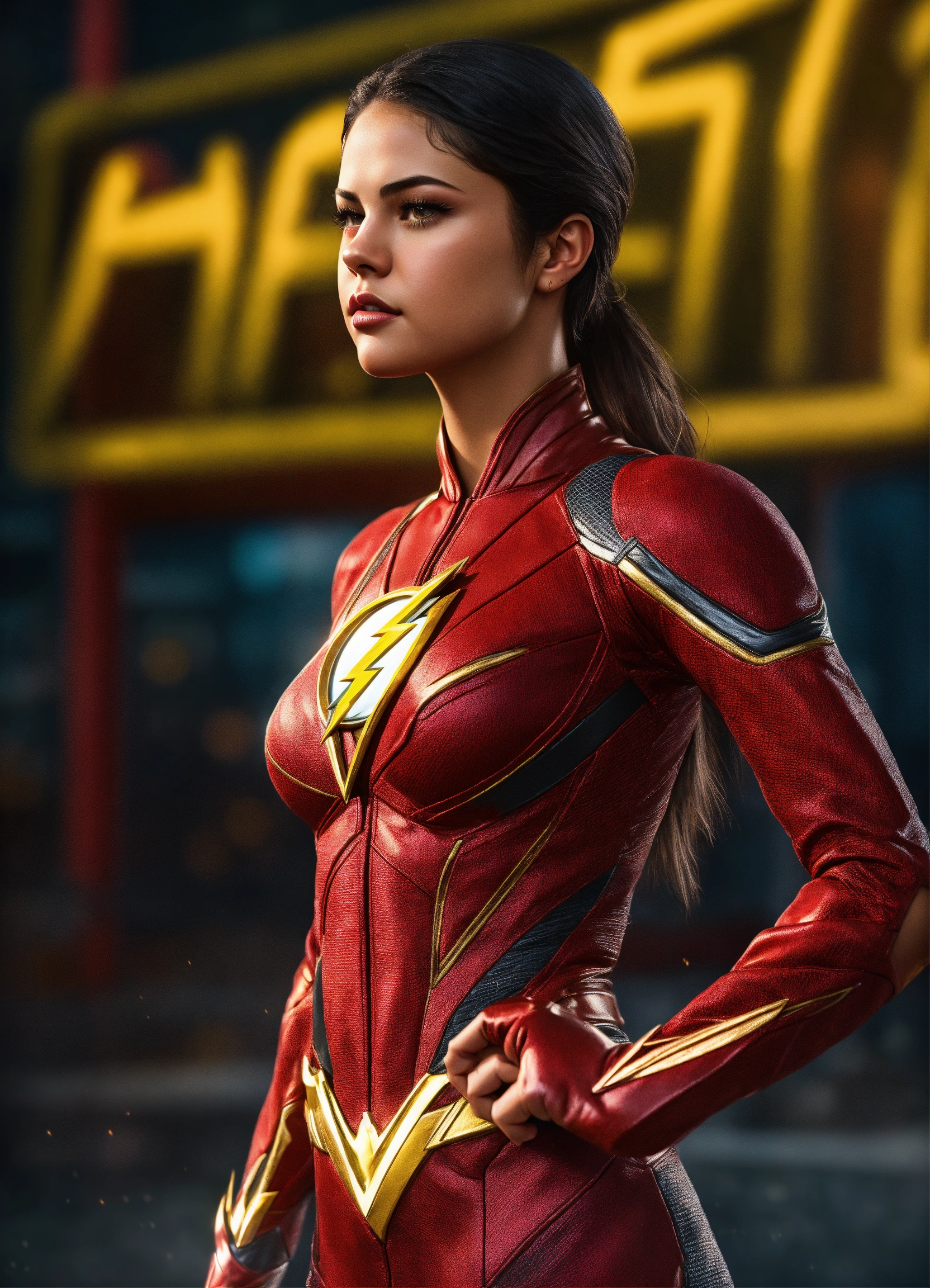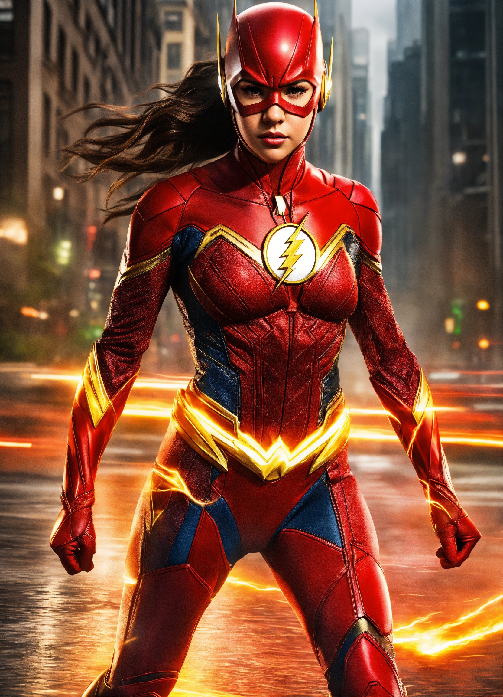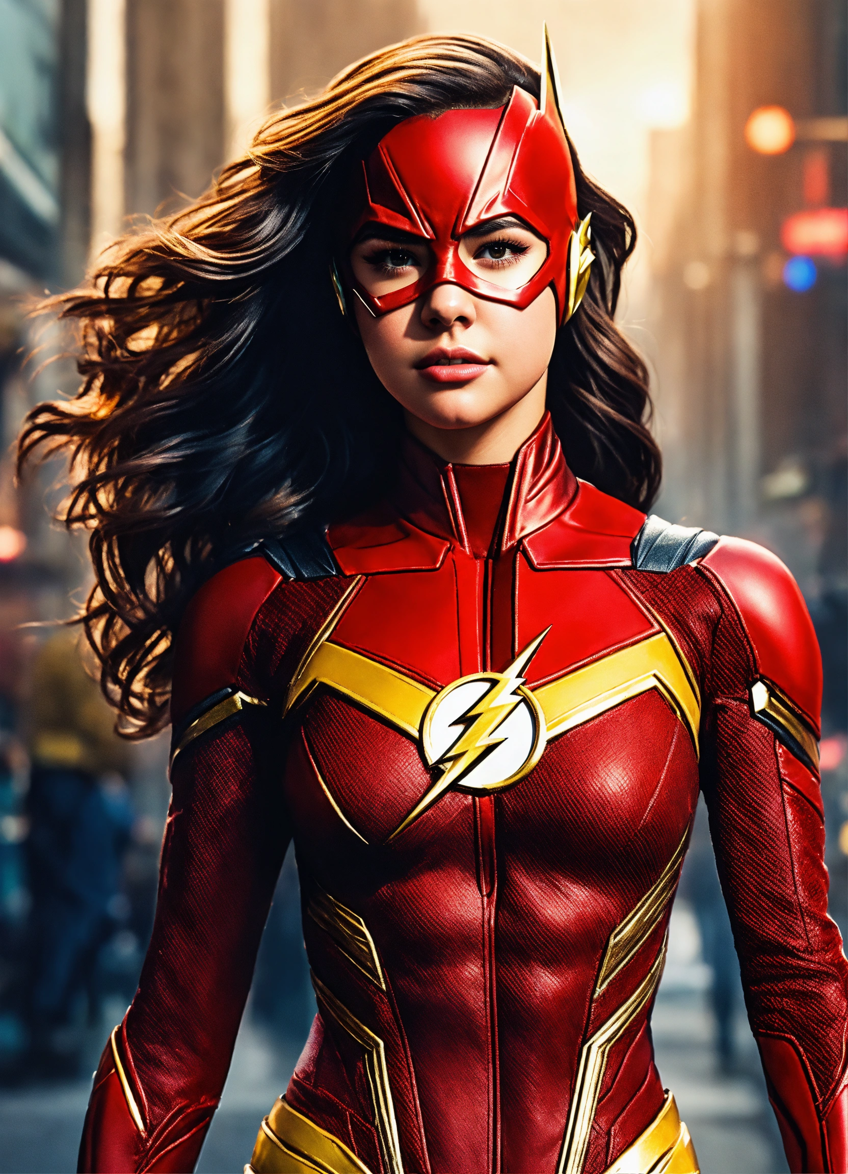 Full body portrait, {{{movie}}} {{{zack snyder's justice league}}} {{{the year 2021}}}, selena gomez {{{female}}} cosplaying the cast role of character the flash, 8k resolution concept art by greg rutkowski, hyperdetailed, intricately detailed, unreal engine, hyperrealism, depth of field, photorealism, digital art, photorealistic