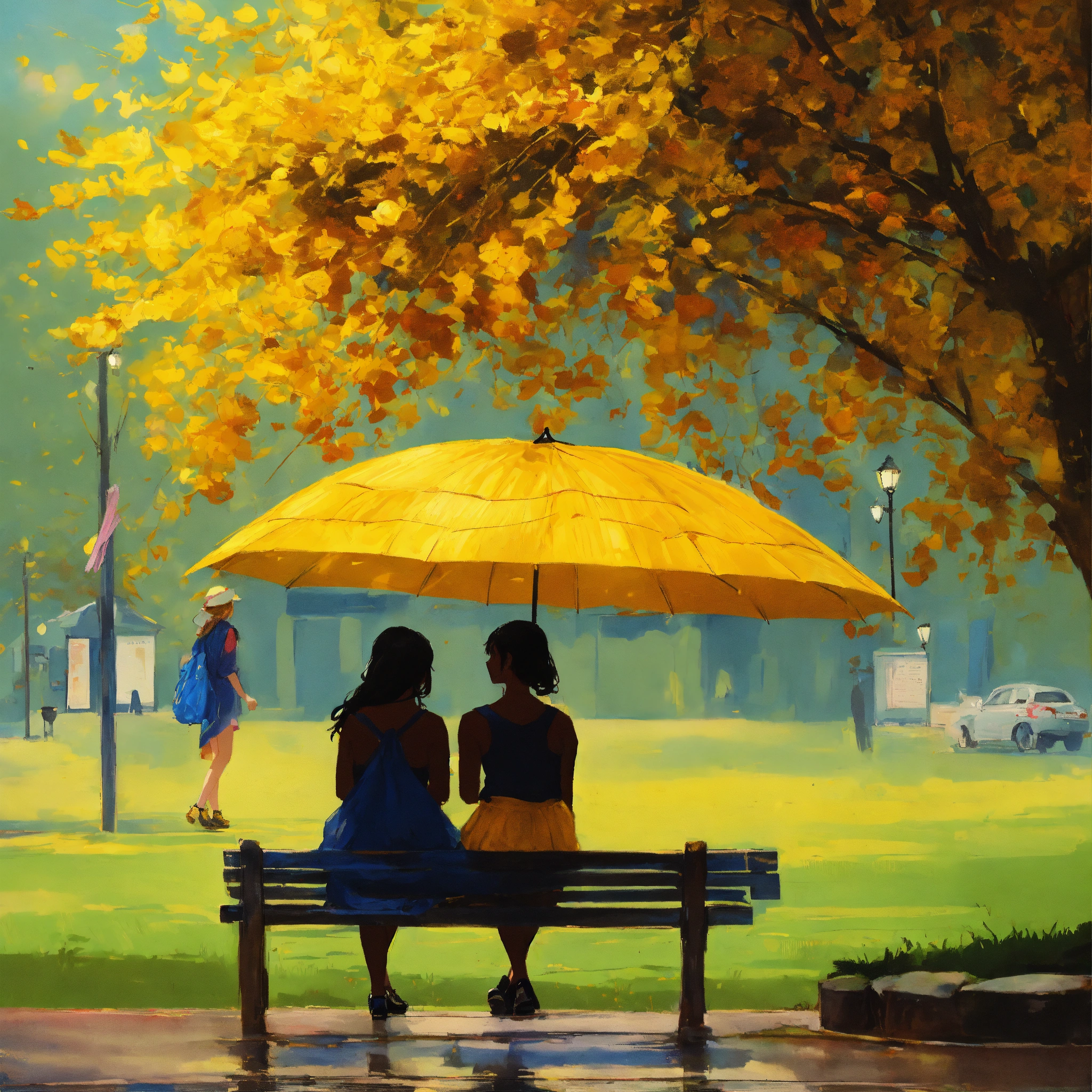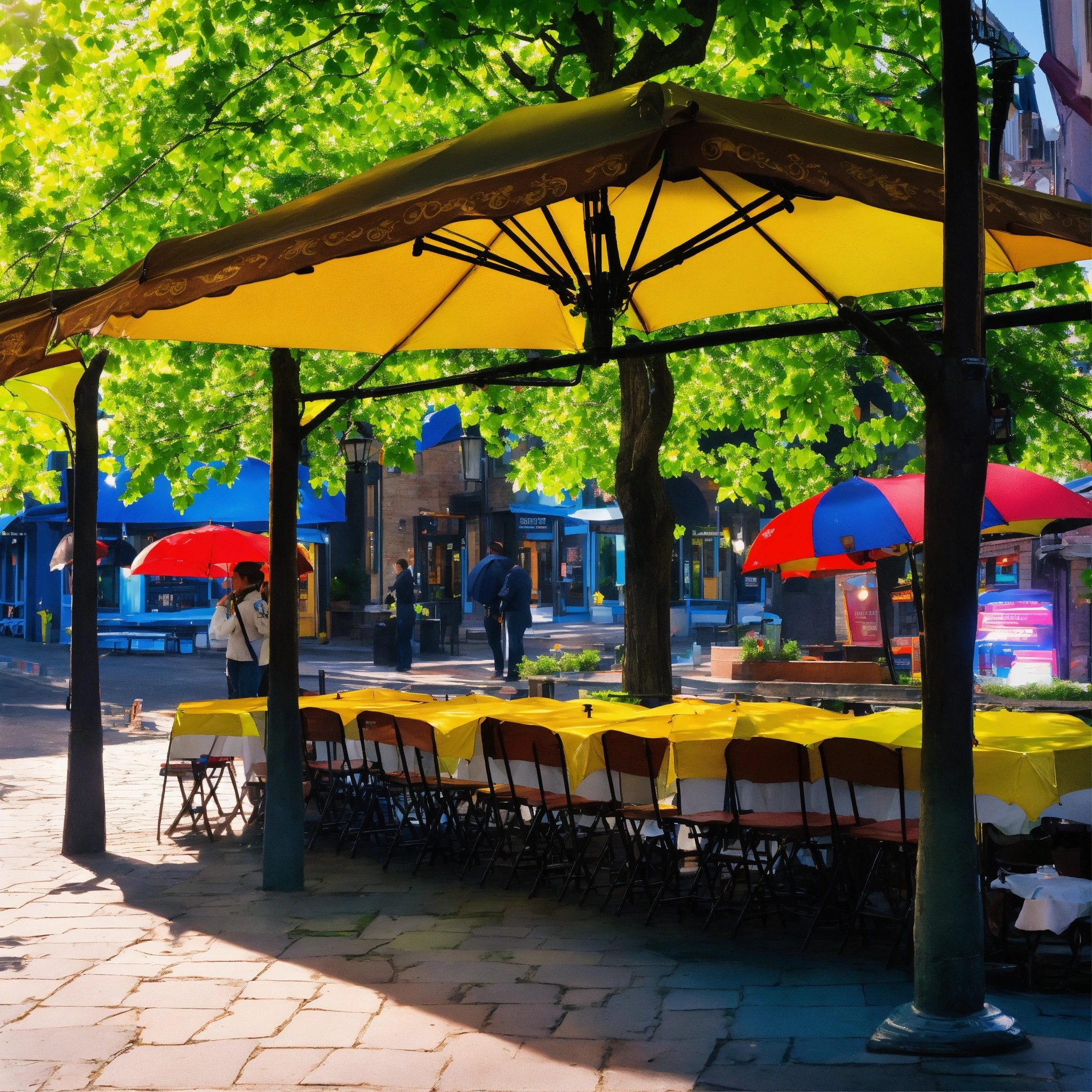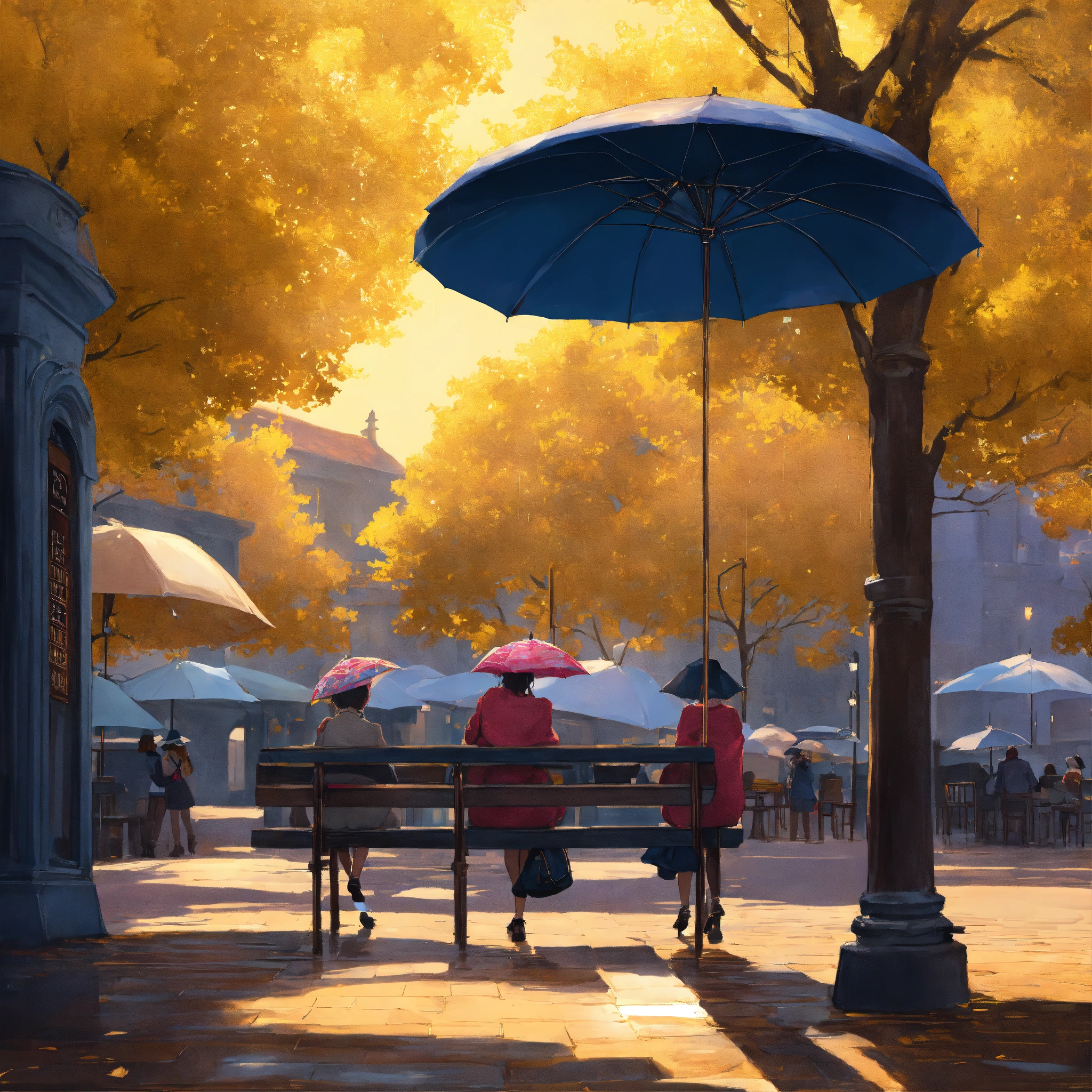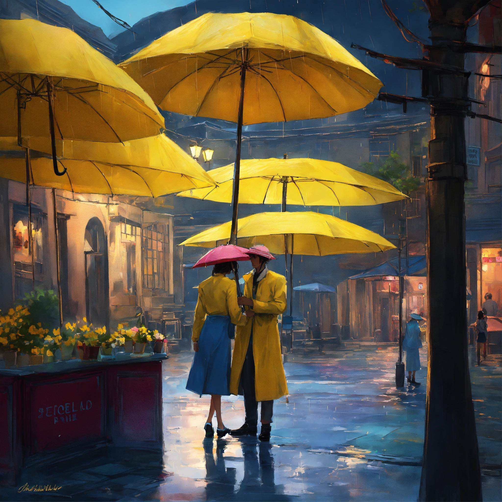 These umbrellas of drizzlewood were no ordinary rain protectors. they whispered tales of the day, chatted about the weather, and sometimes even hummed a tune or two. the town square often echoed with their soft conversations, as they stood together in umbrella stands or hung side by side at the local cafe. among these chattering umbrellas were two special ones lulu, with her vibrant yellow canopy that shone like the summer sun, and blu, whose deep blue hue mirrored the vast evening sky. little did the town know that these two umbrellas were about to embark on an adventure that drizzlewood would remember for ages.