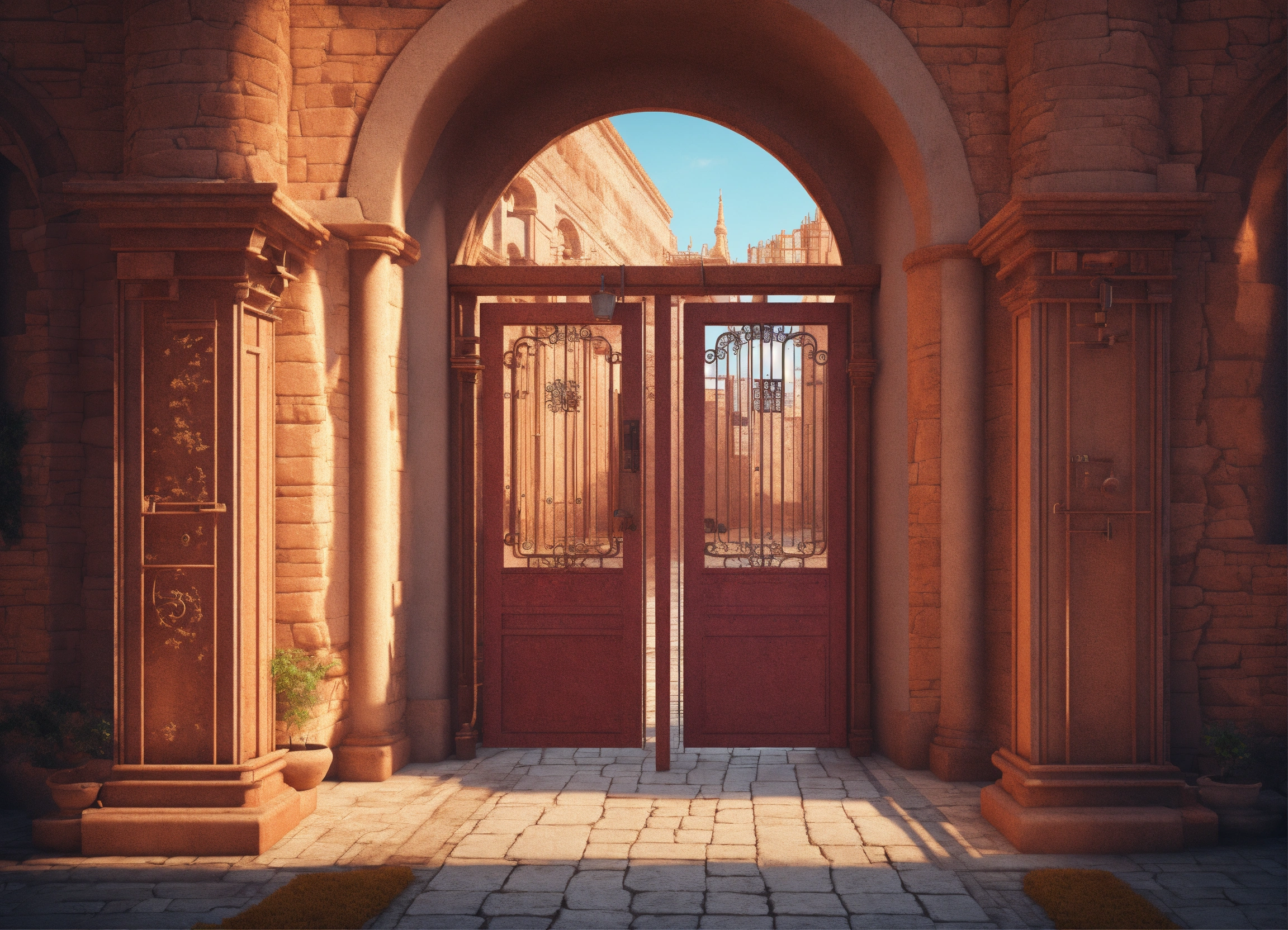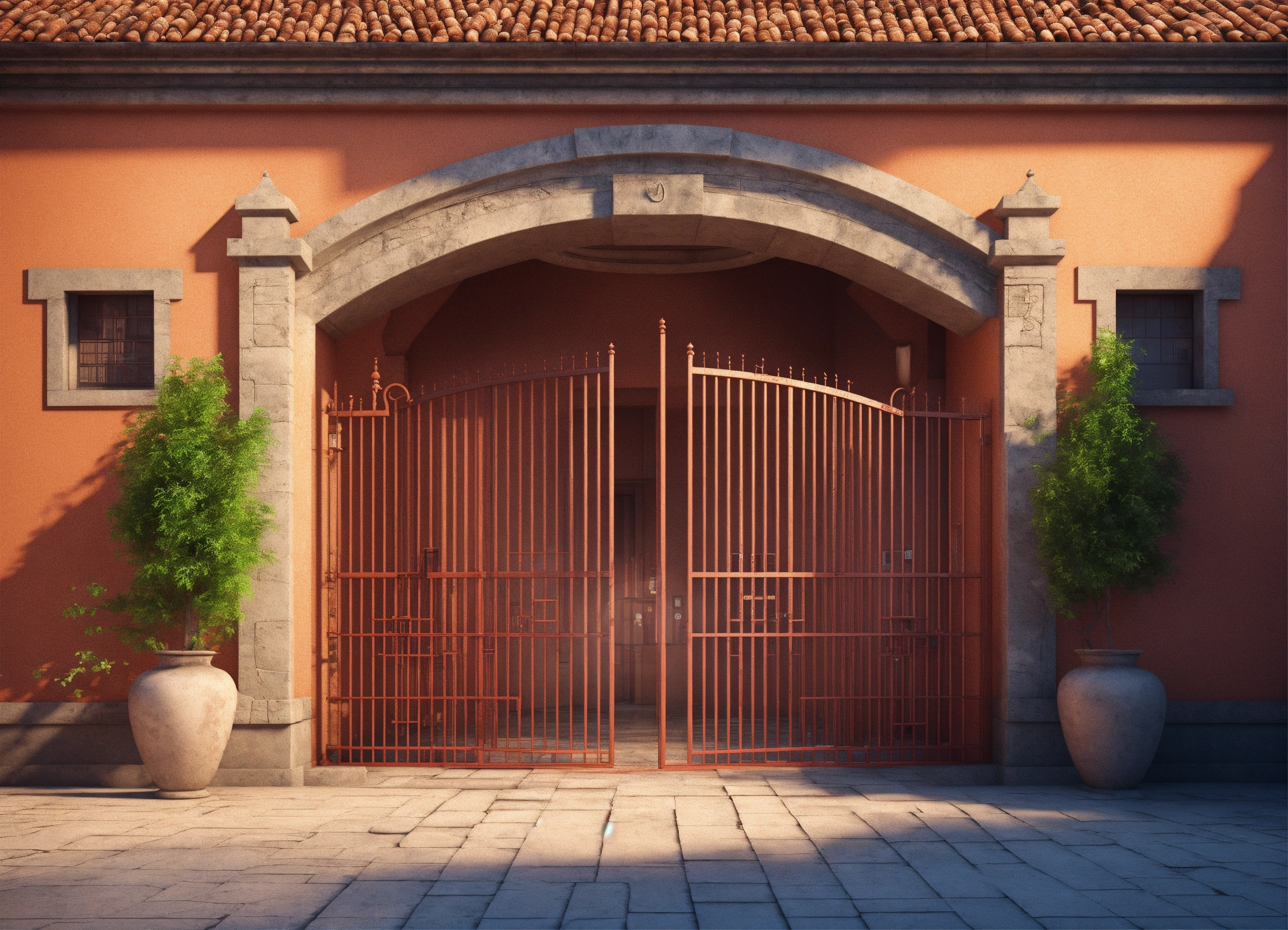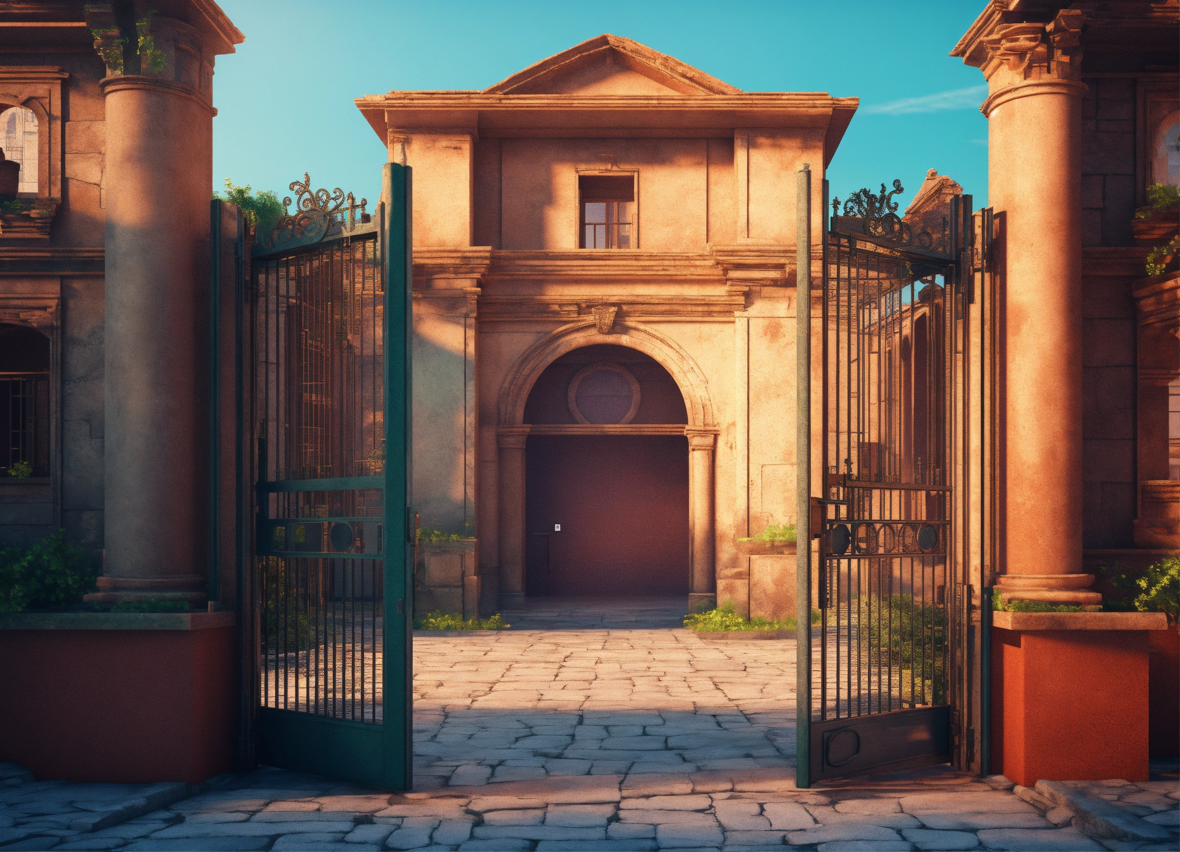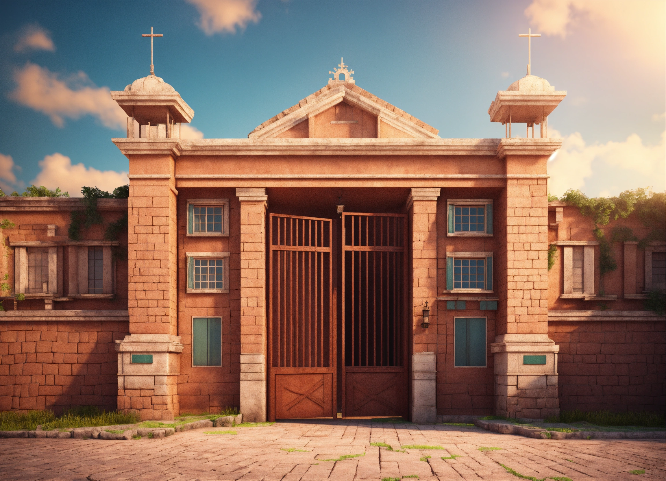 An ancient hospital from the outside with a wide open gate. realistic 3d illustration