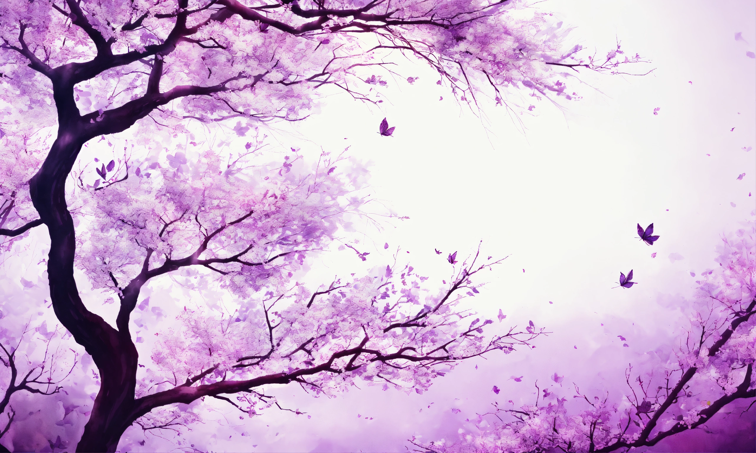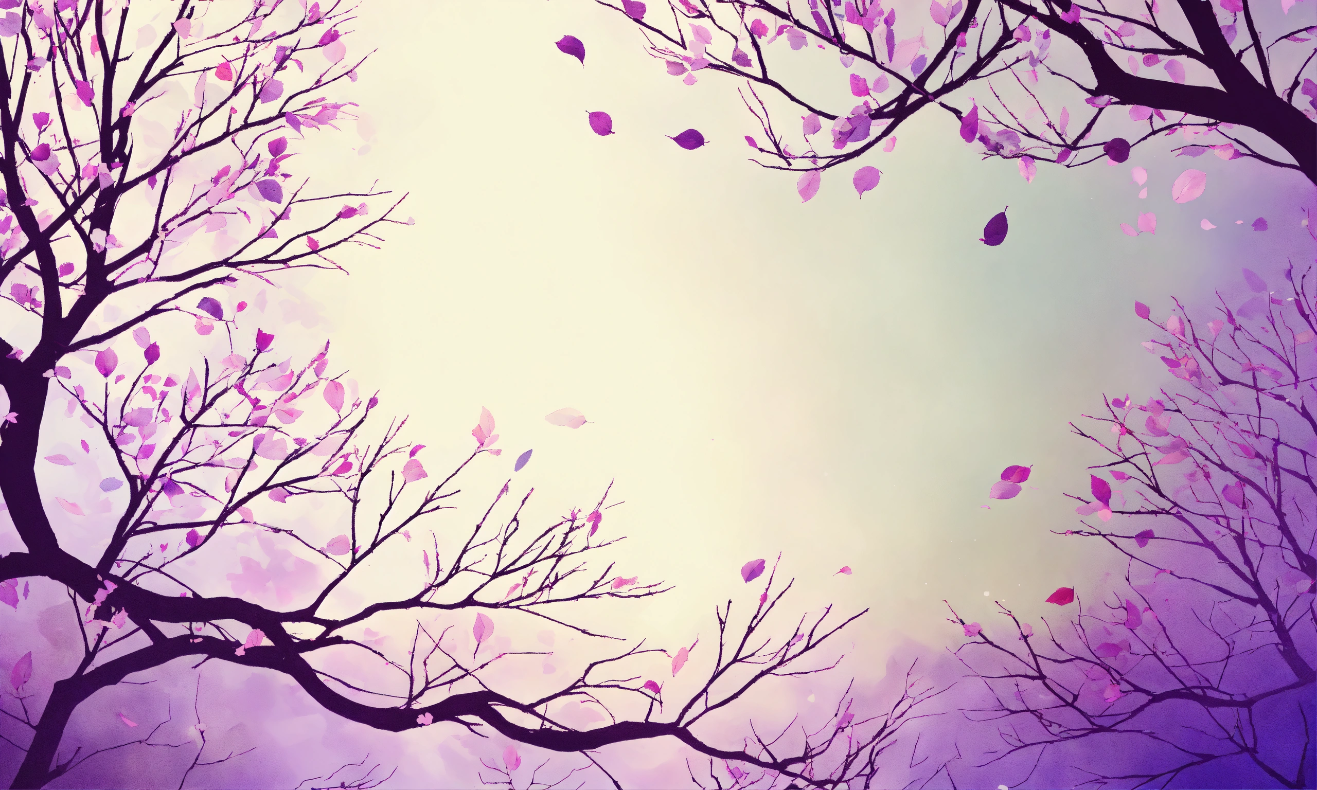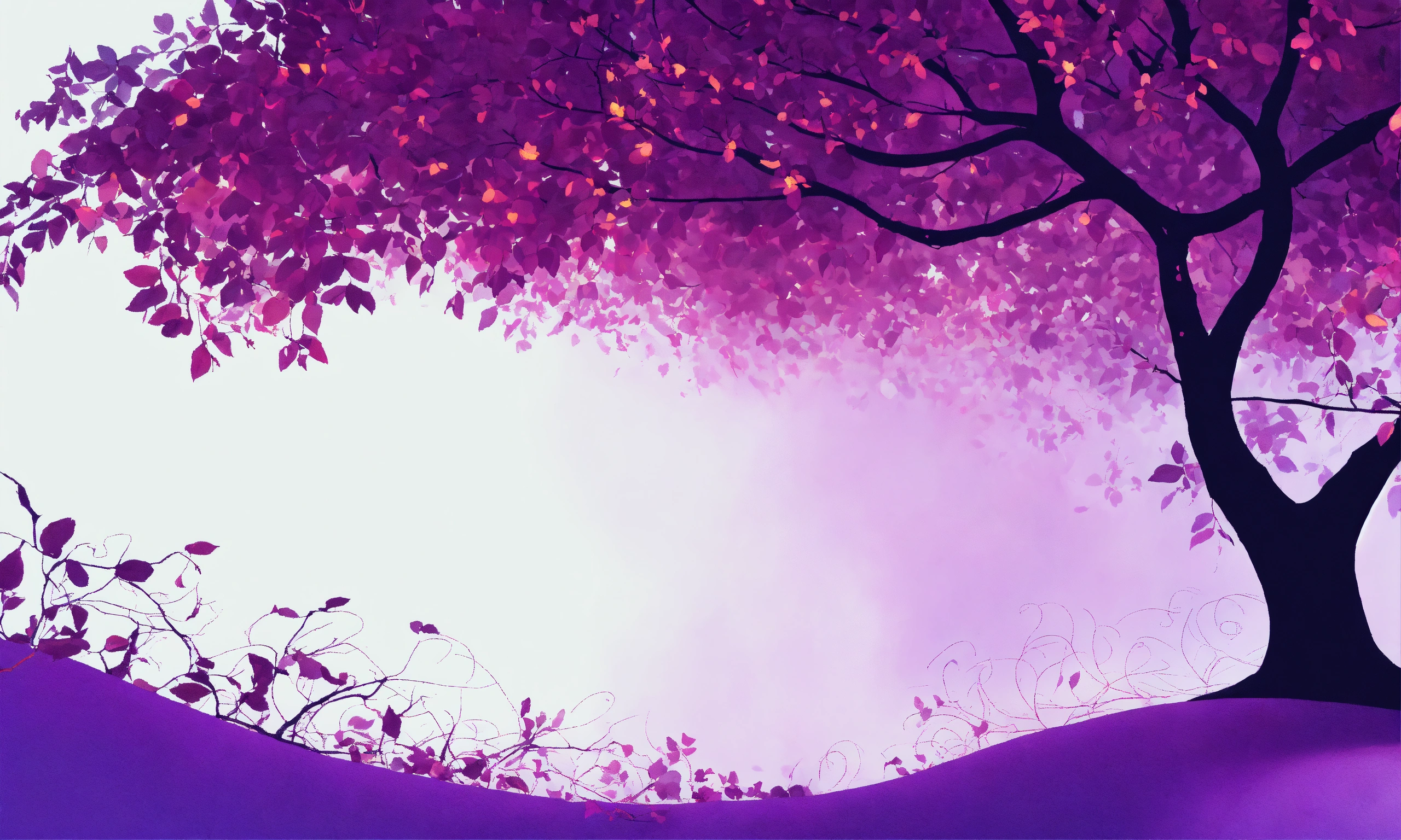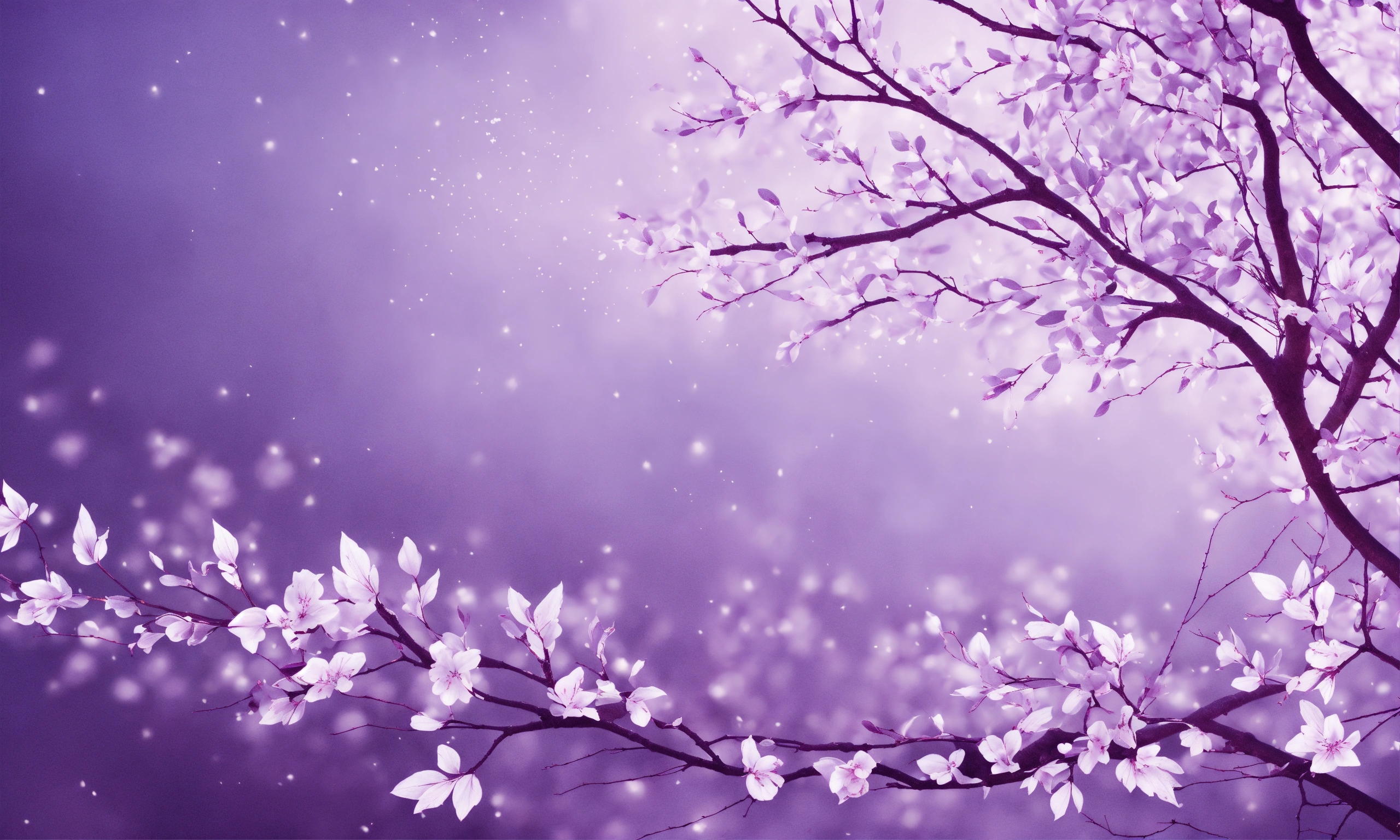 "design a web background featuring a pure white canvas. from the top and left side, introduce dark purple tree branches complete with leaves, creating an enchanting and magical ambiance. these branches should frame the design but allow for ample white space in the center and right to facilitate writing."