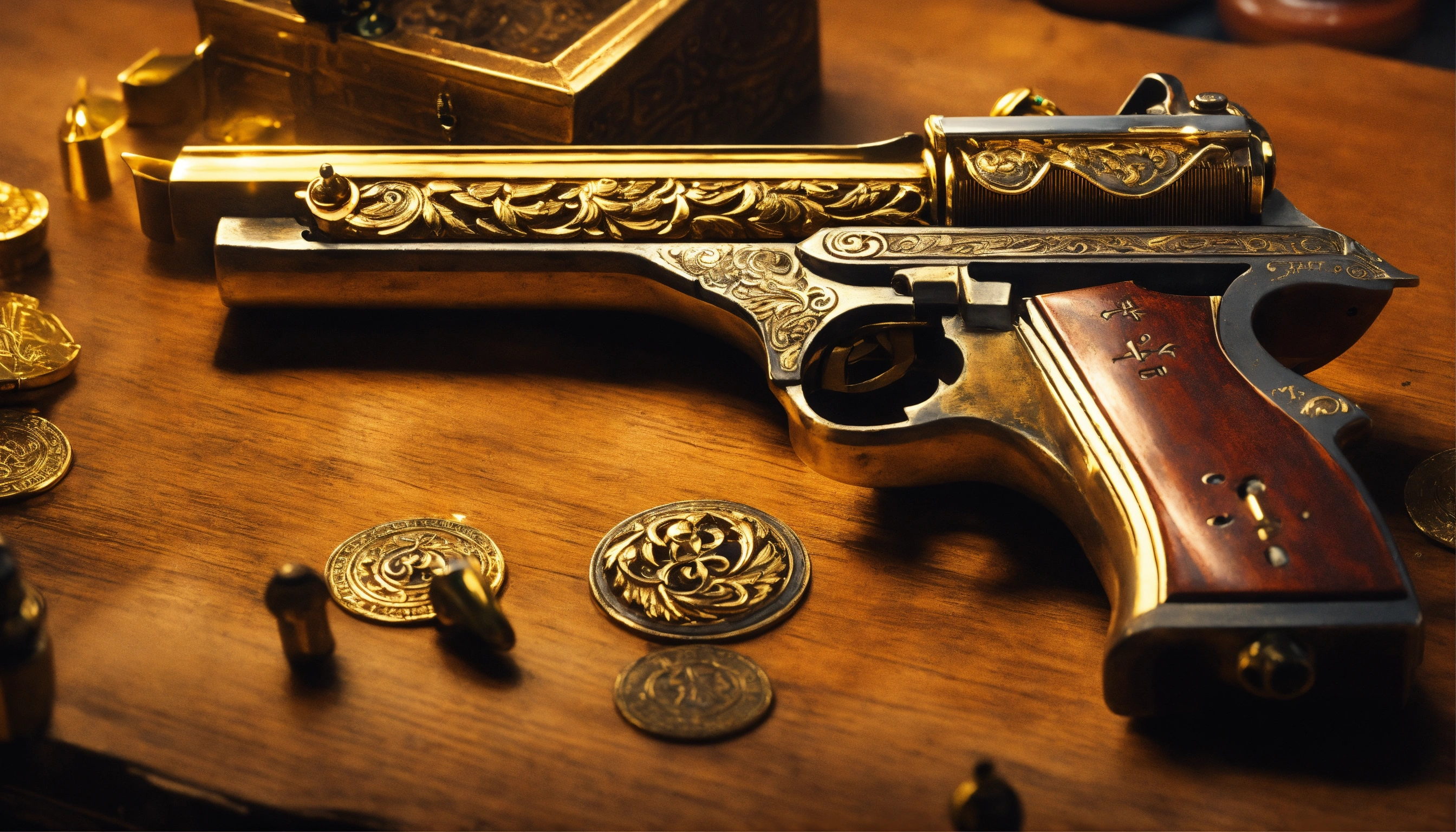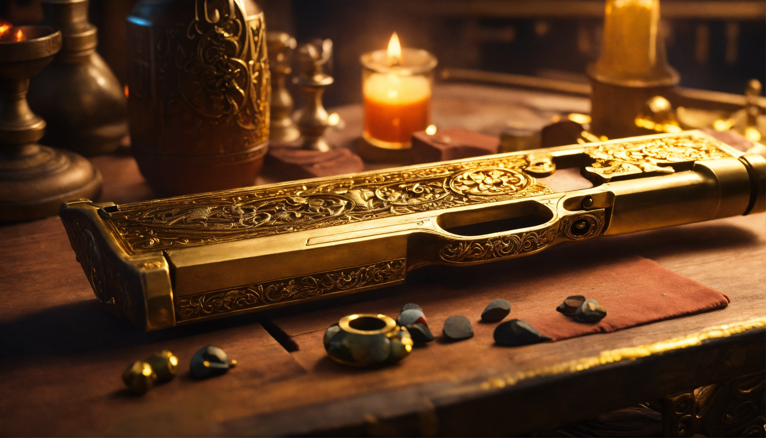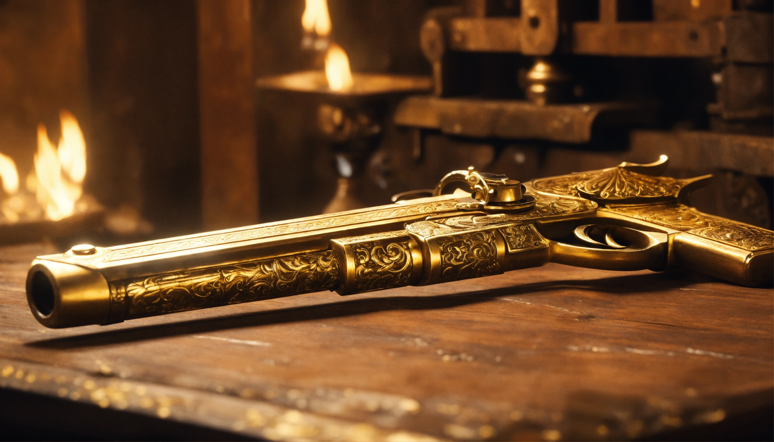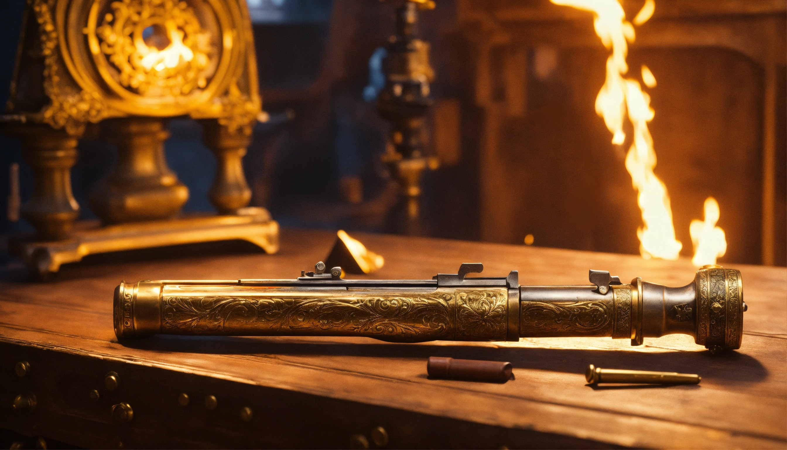 Single fire medieval pistol laying on a gold trimmed workbench with magical runework on it in the quarters of a ship
