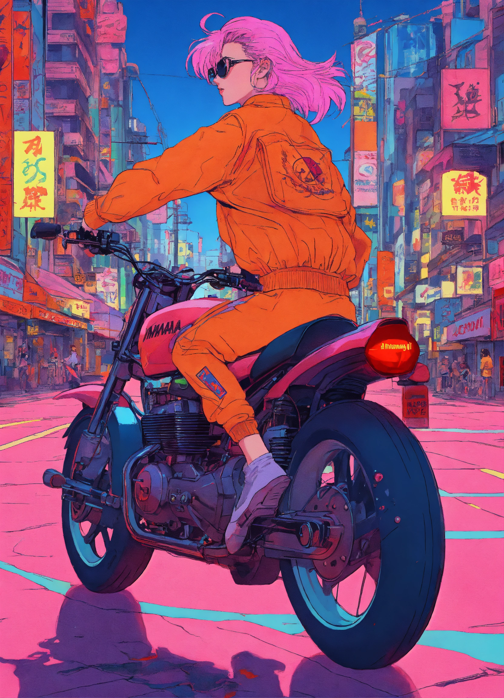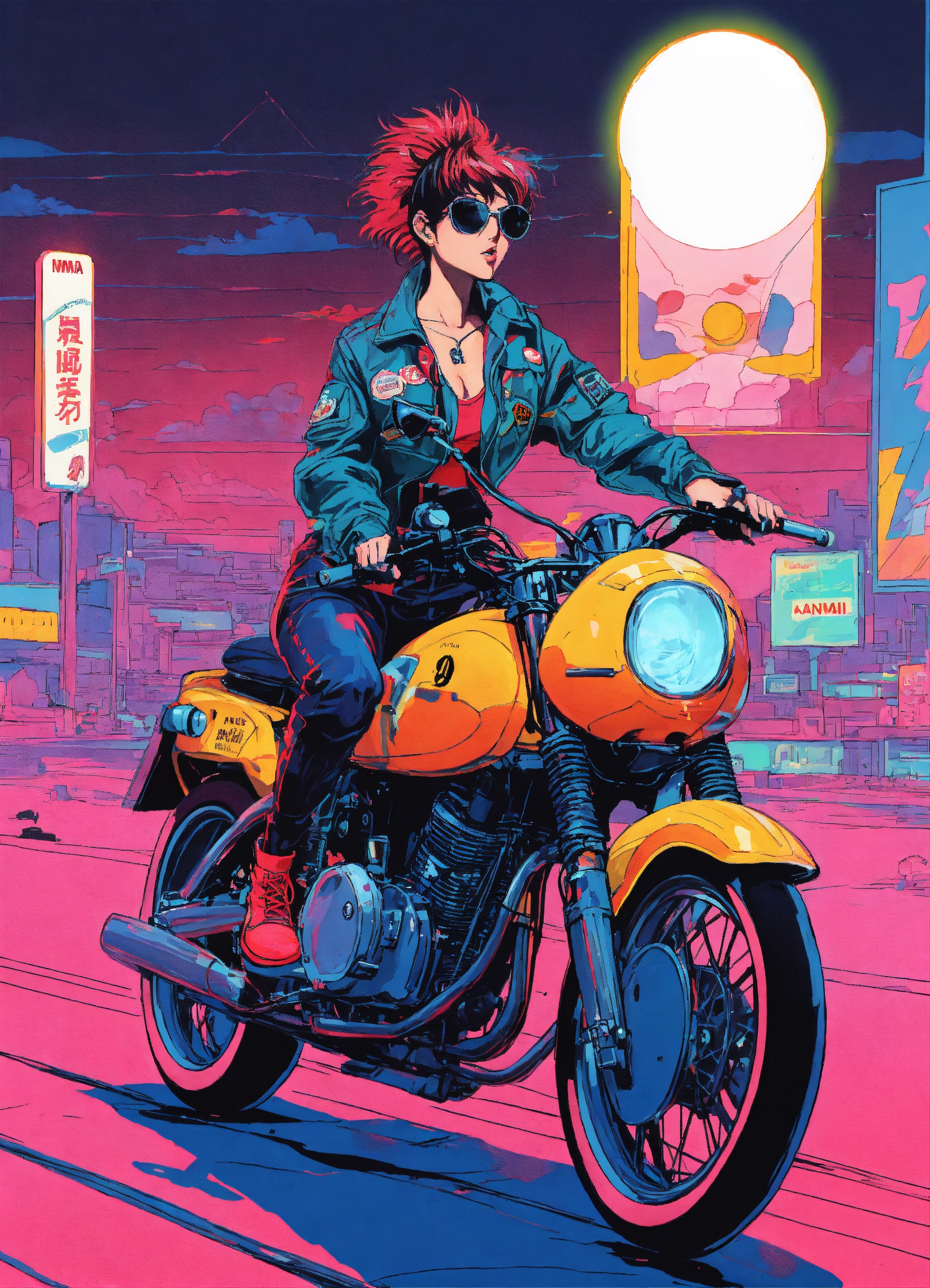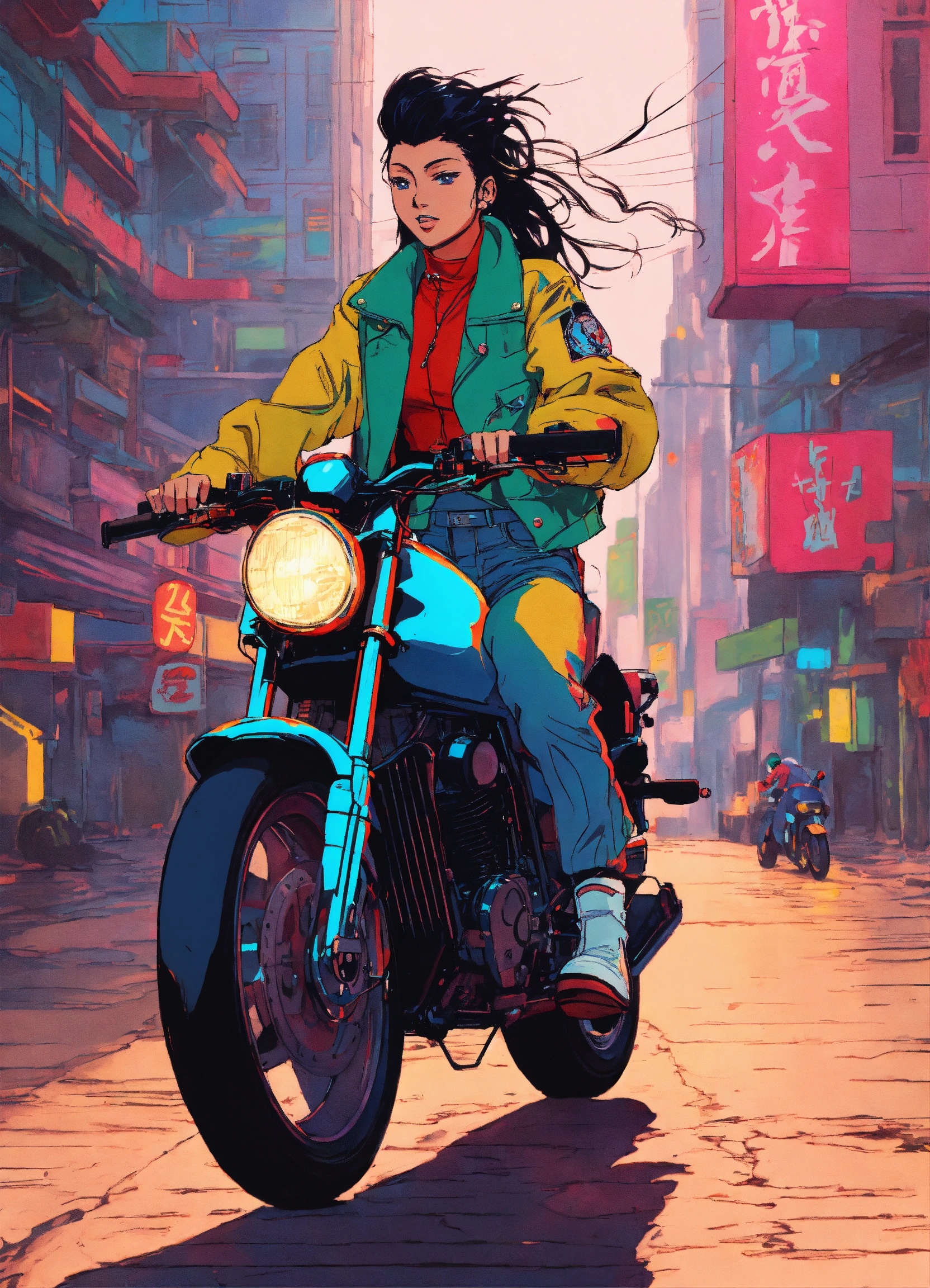 In the style of 90's vintage anime, surrealism, akira style. fine details. an fit punk woman cruising on motorbike yamaha. neon