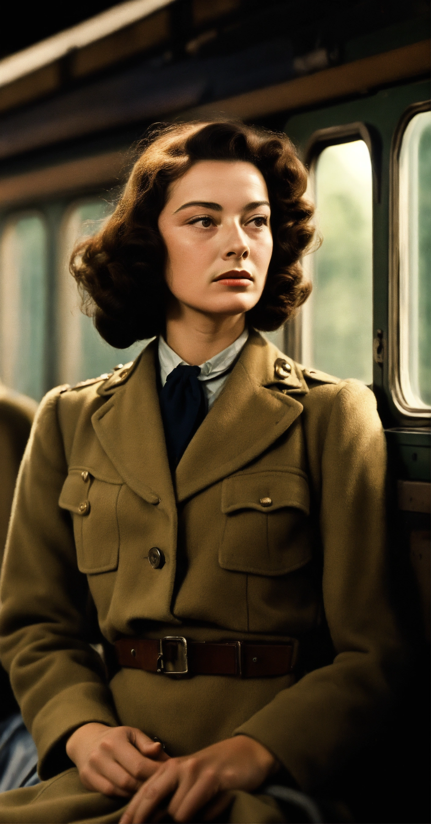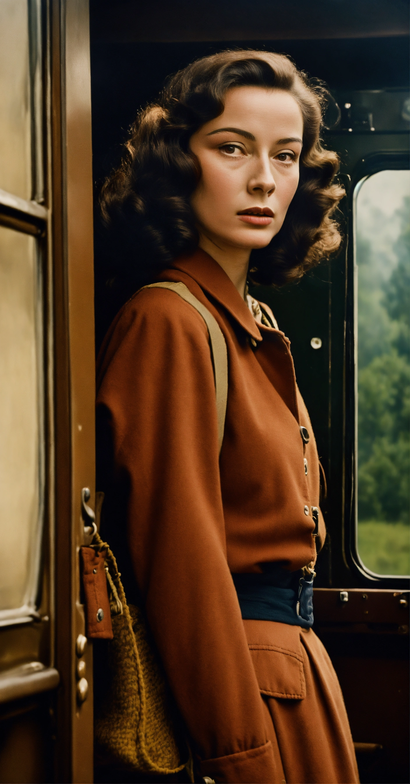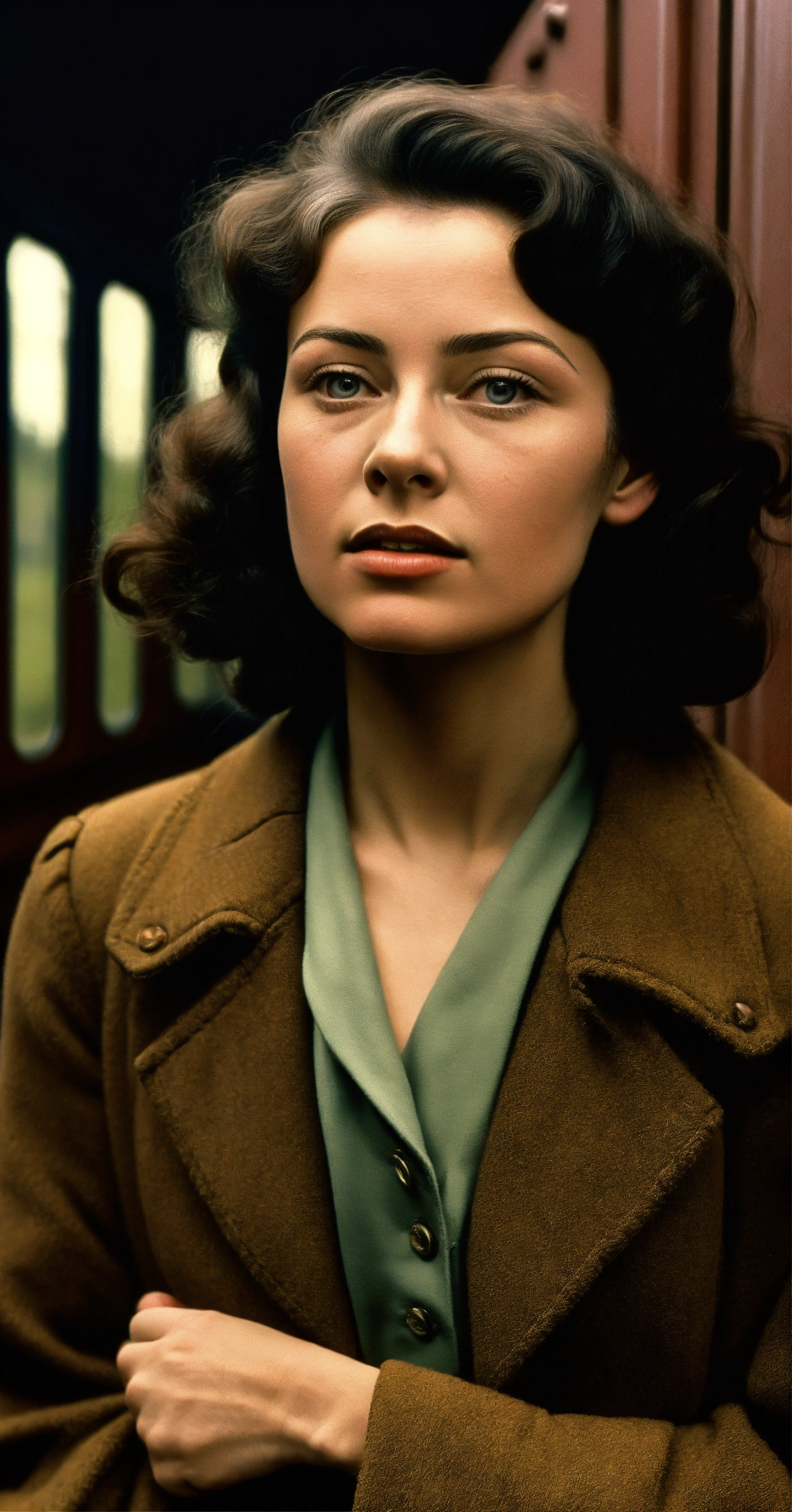 Create a hyper-realistic, cinematographic and captivating intense scene of a young violette szabo being captured capture and transportated by train to ravensbrück concentration camp, capturing the gravity of the situation and the determination in her eyes.