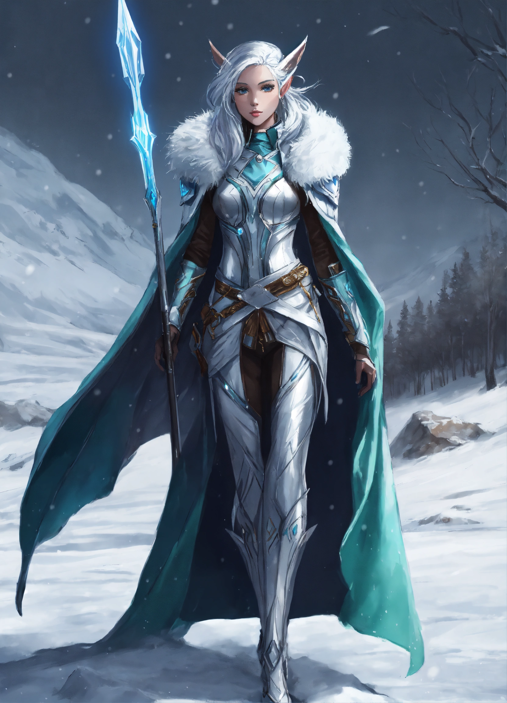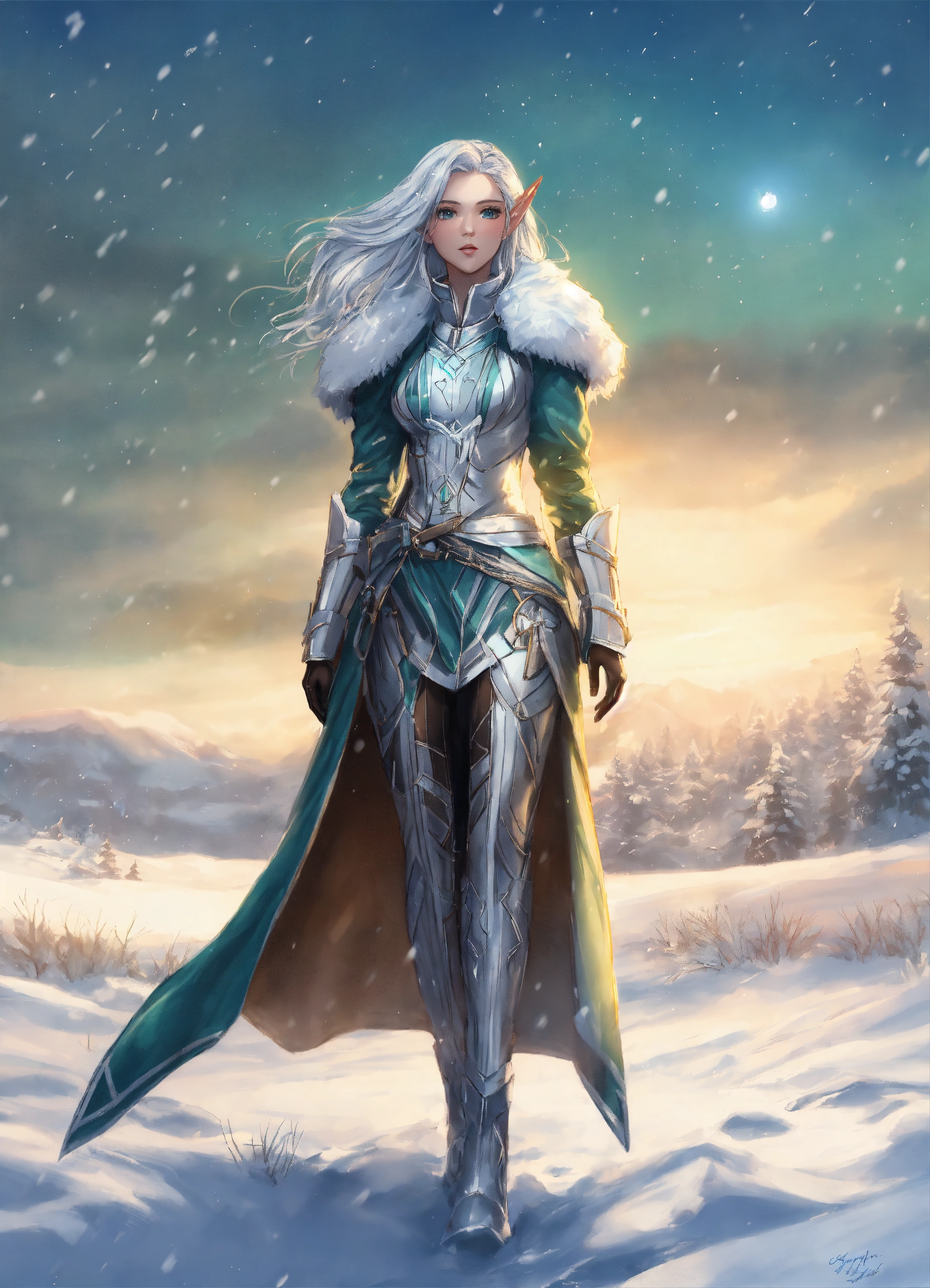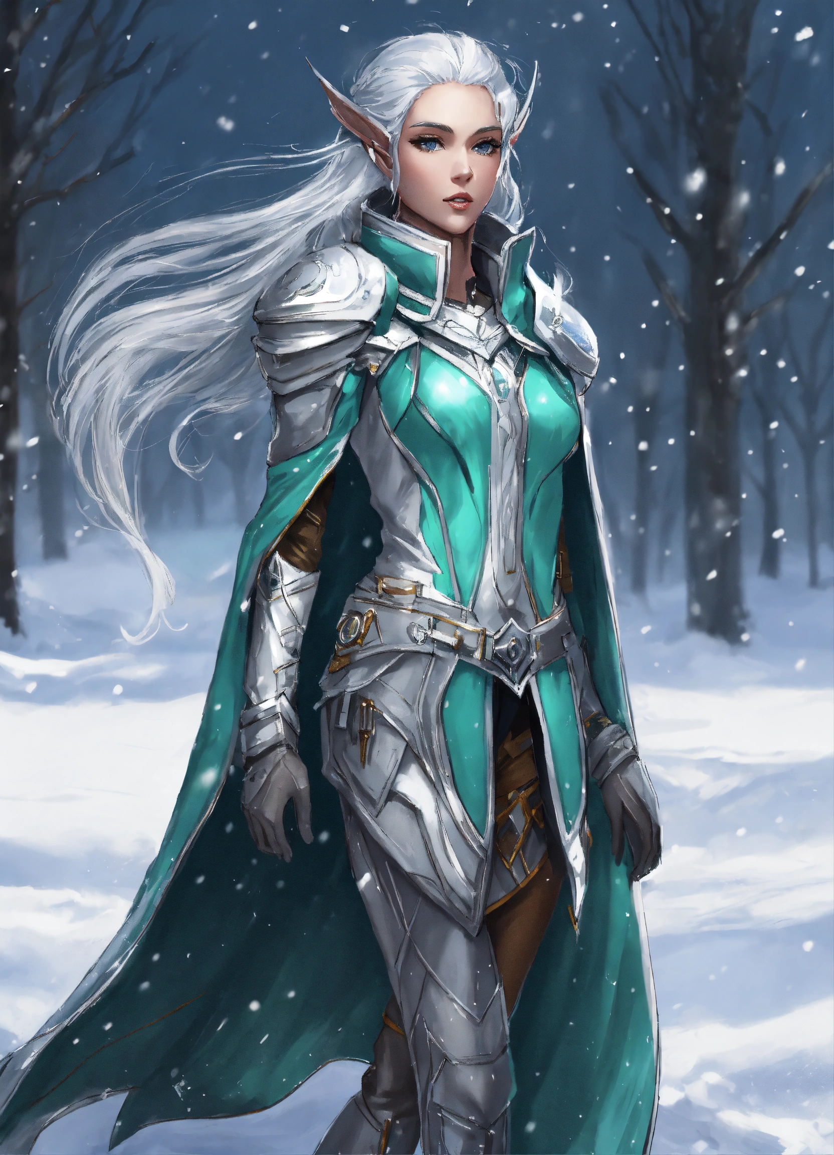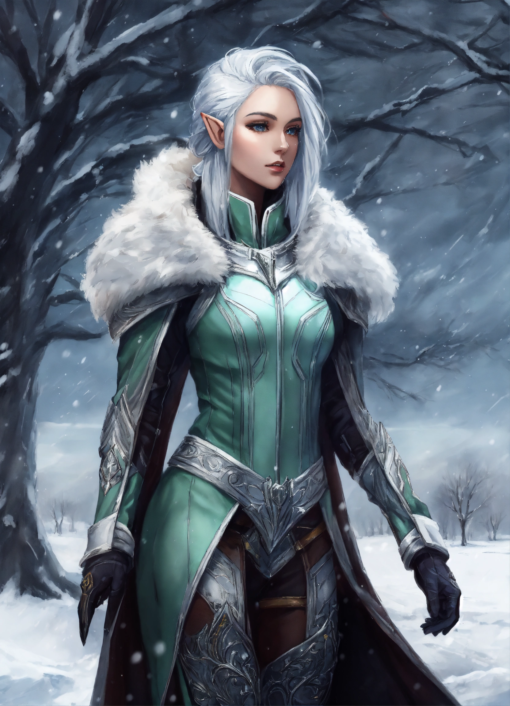 Full body drawing of a sci fi high elf, royalty, futuristic, mint sci fi royal winter coat, elf, female, beautiful, silver hair, 25 years old, standing in snow covered field in winter