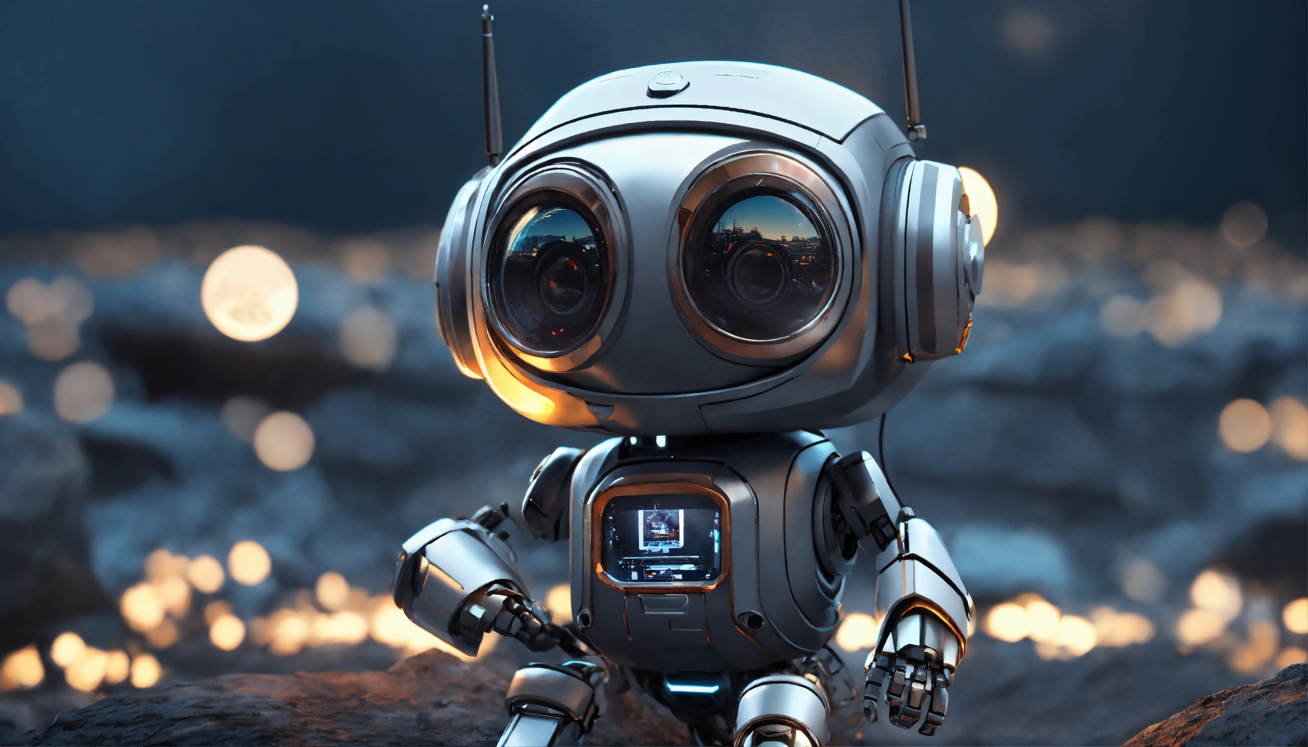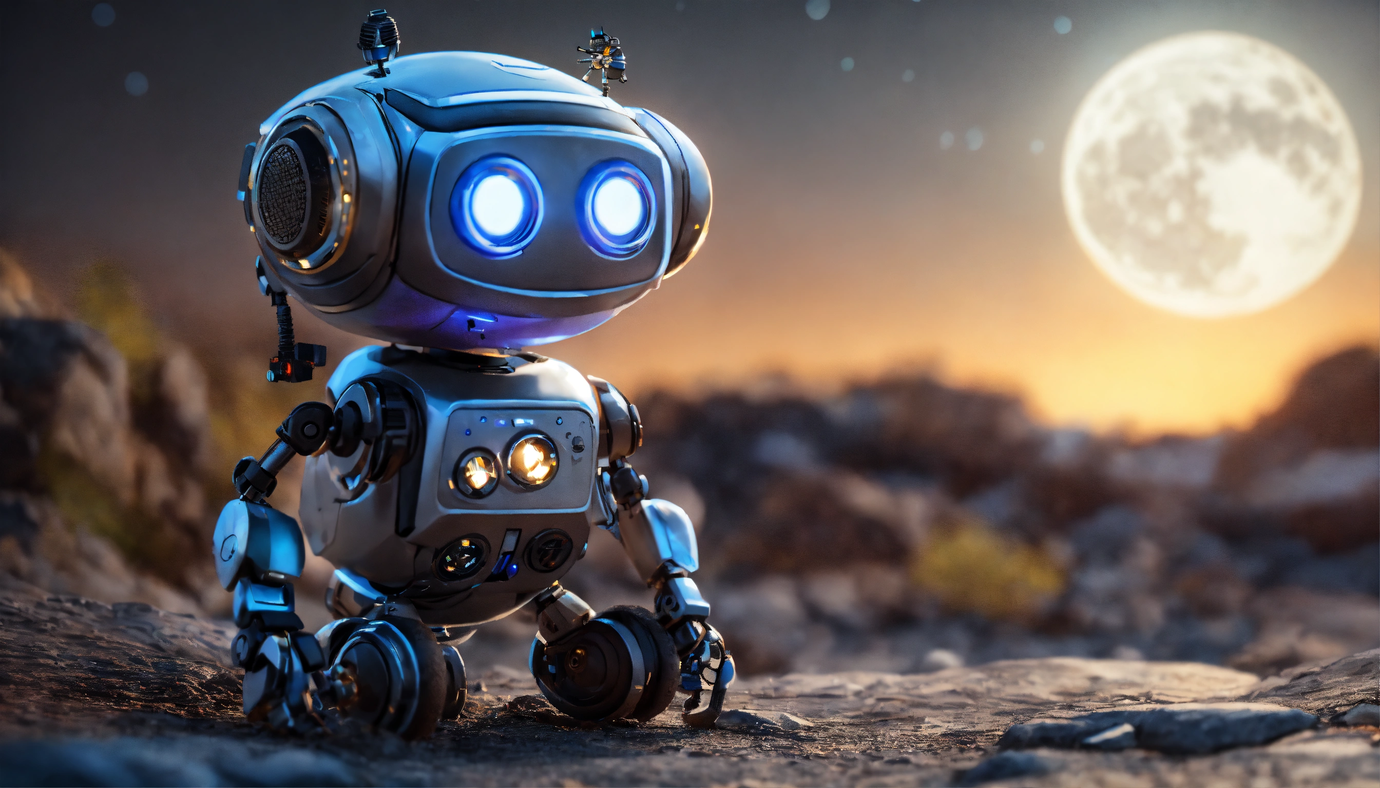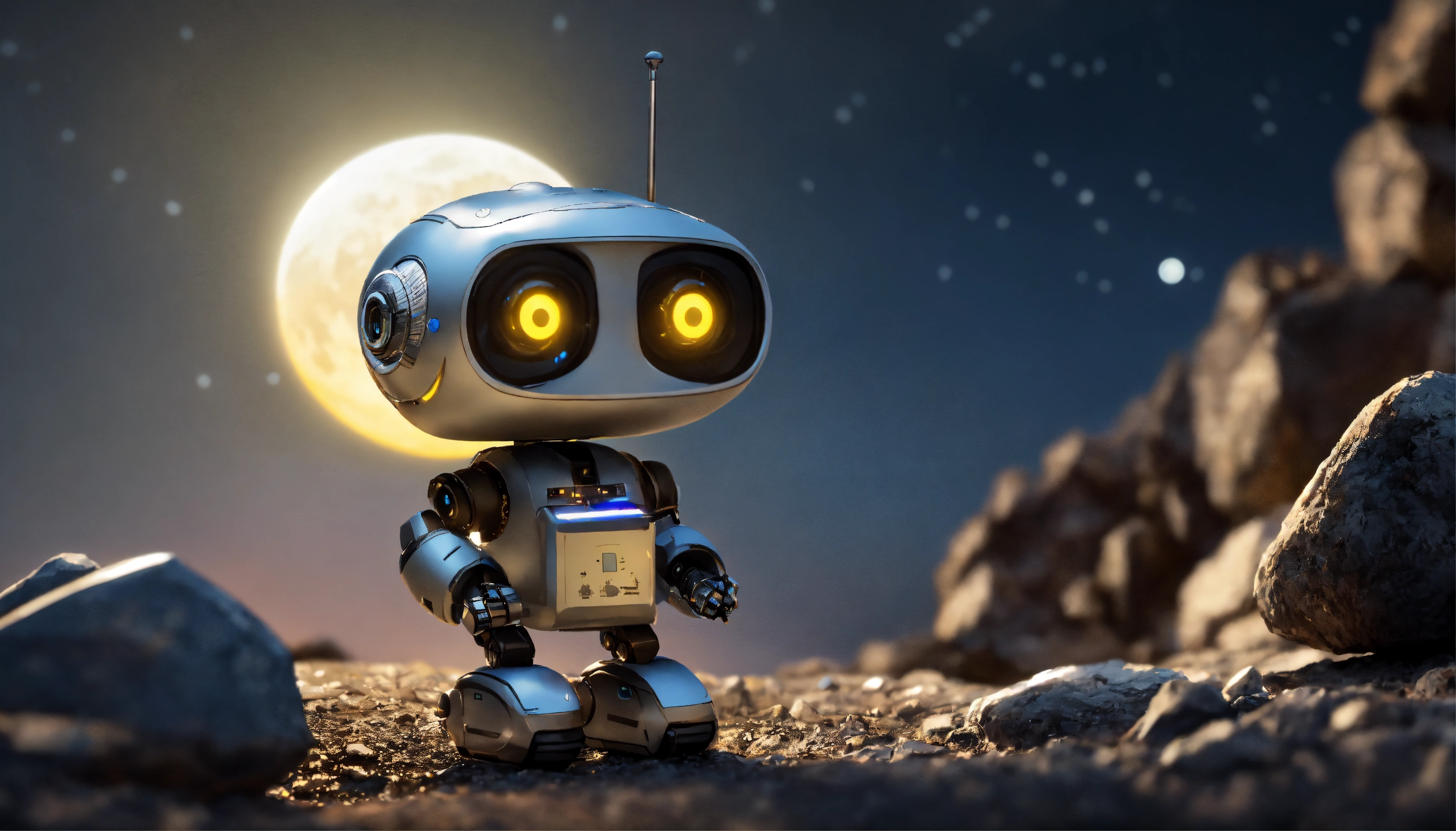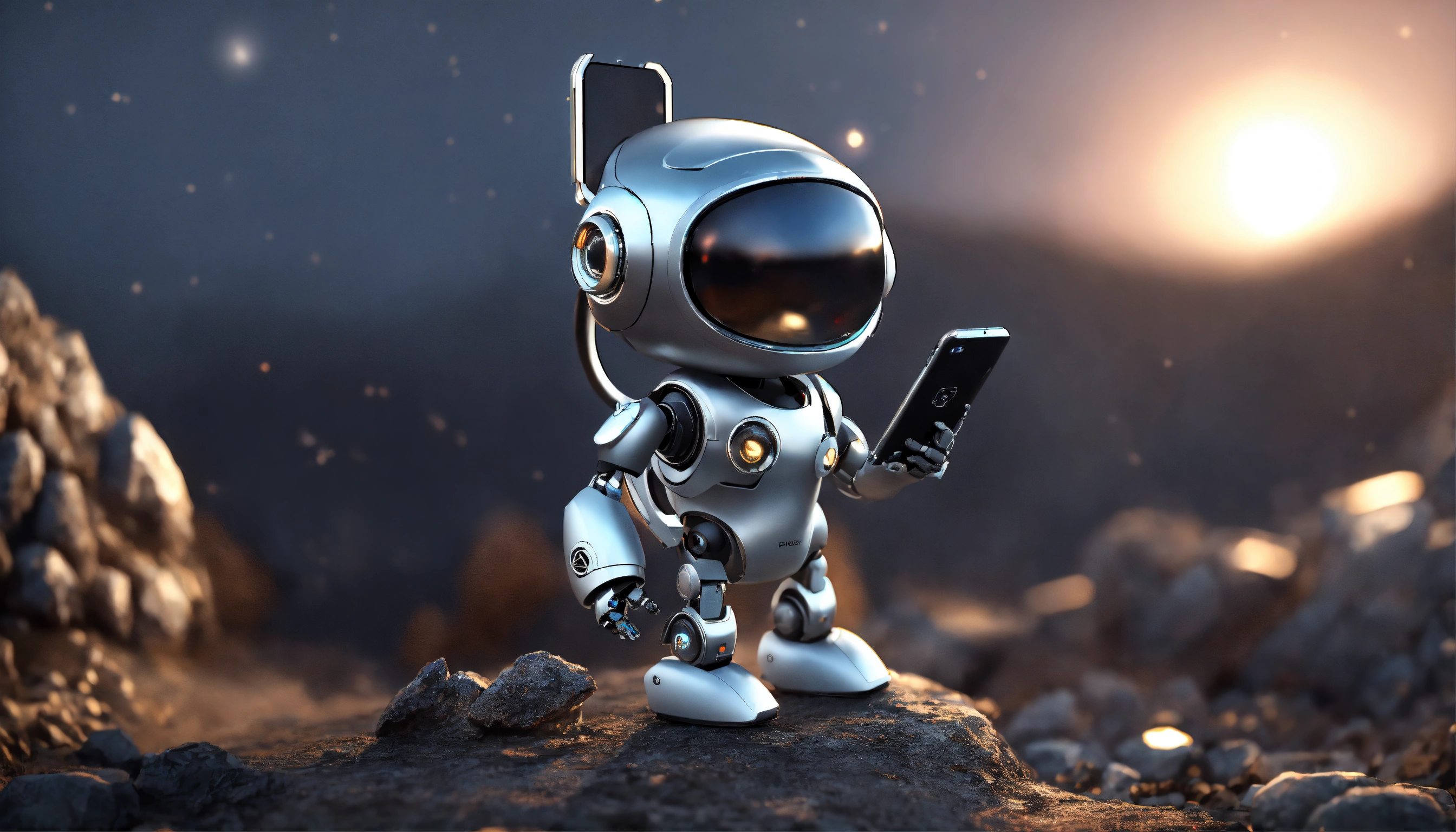 Cute tiny robot with cute eyes, holding smartphone in hands, rendered in unreal engine. hdr, realistic, cinematic light, fine details. moon background with rocks, all picture in gray and black colors