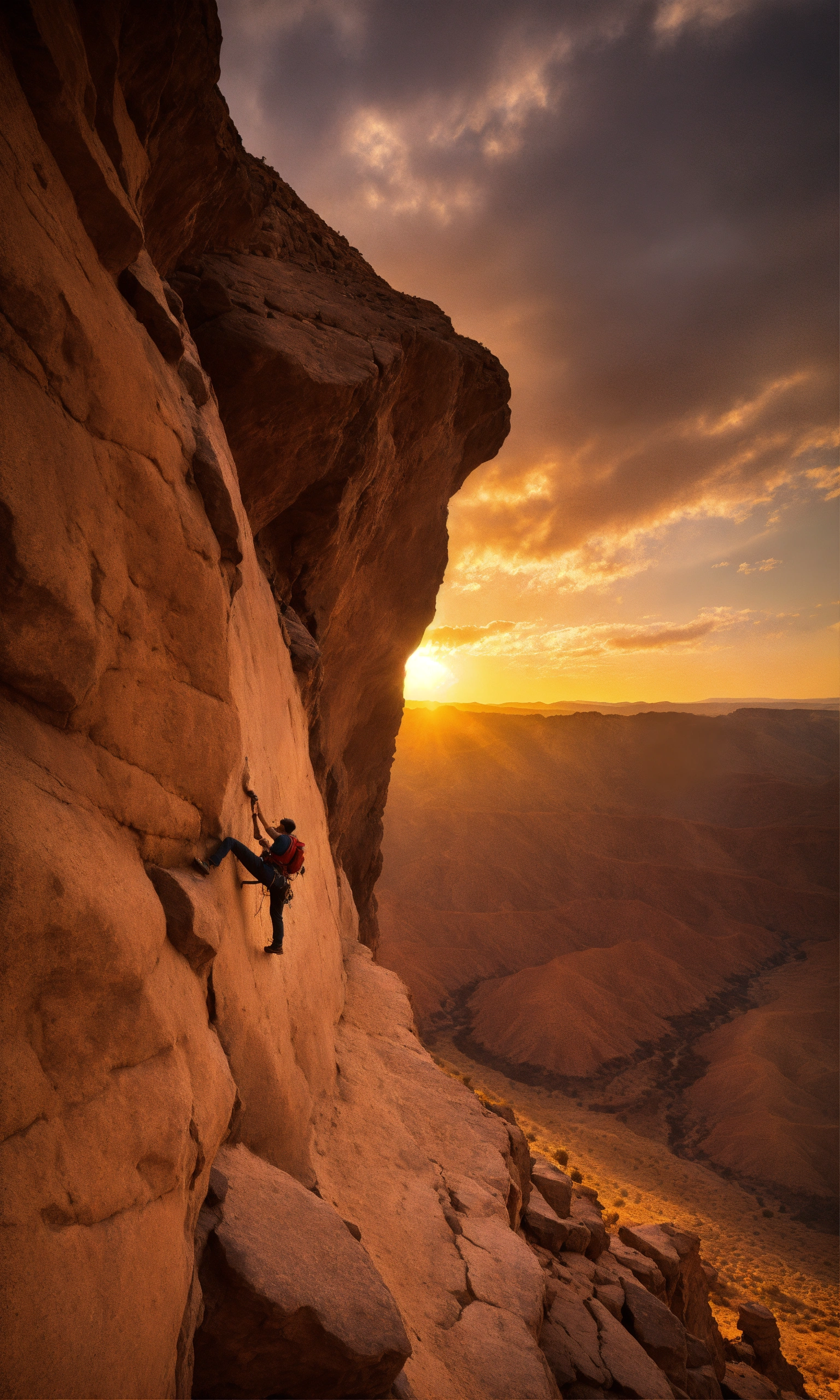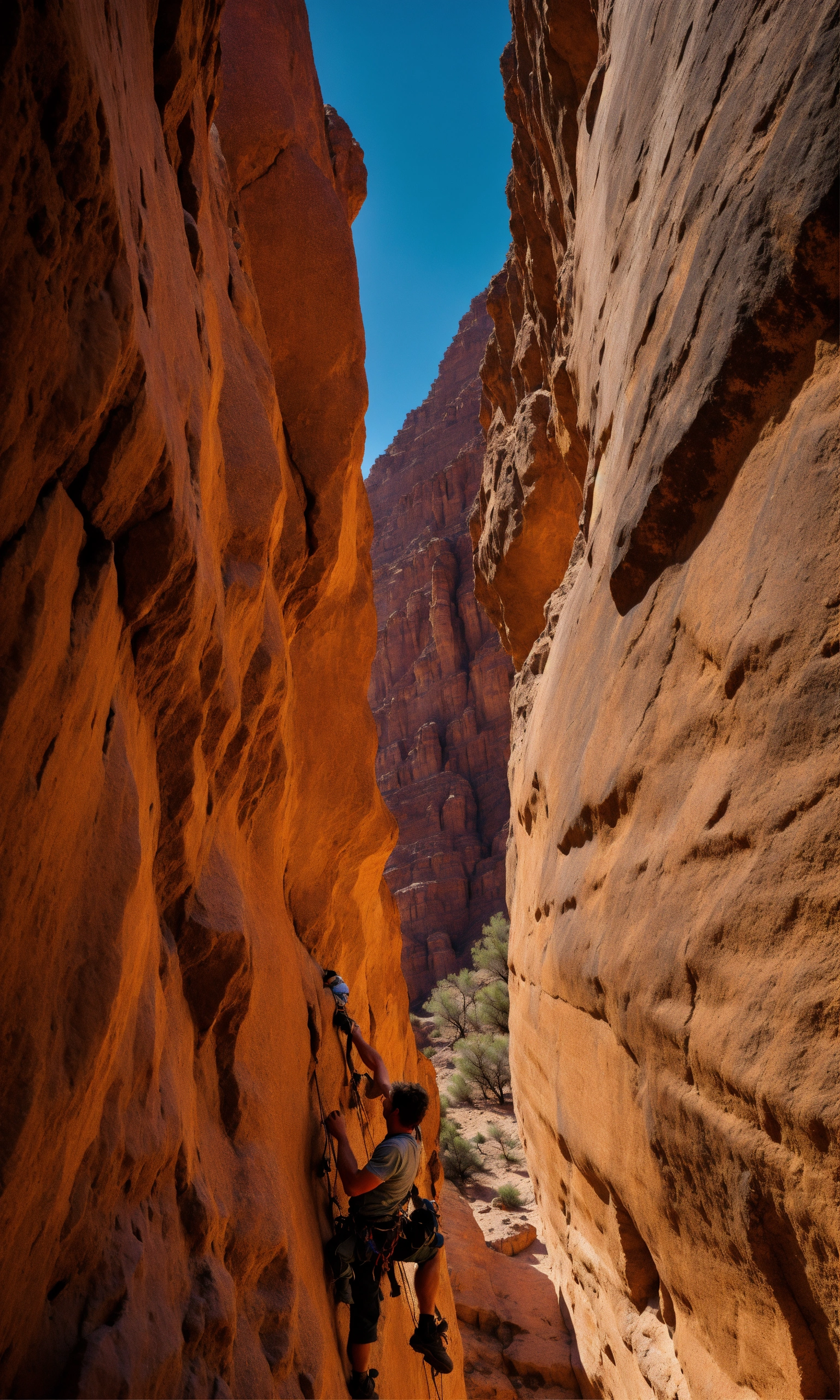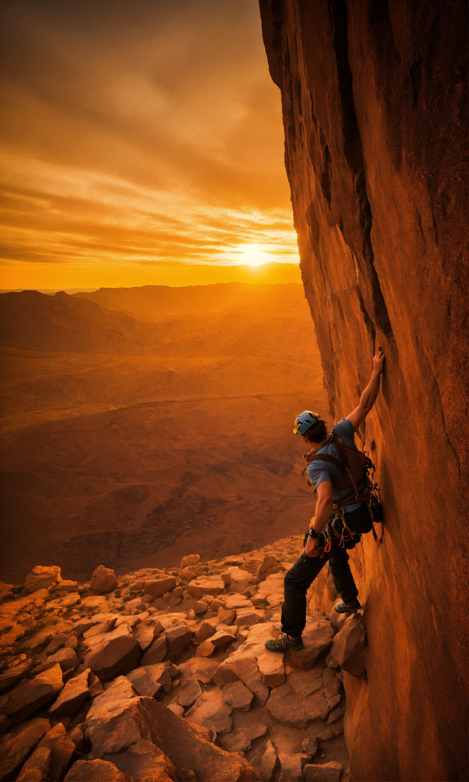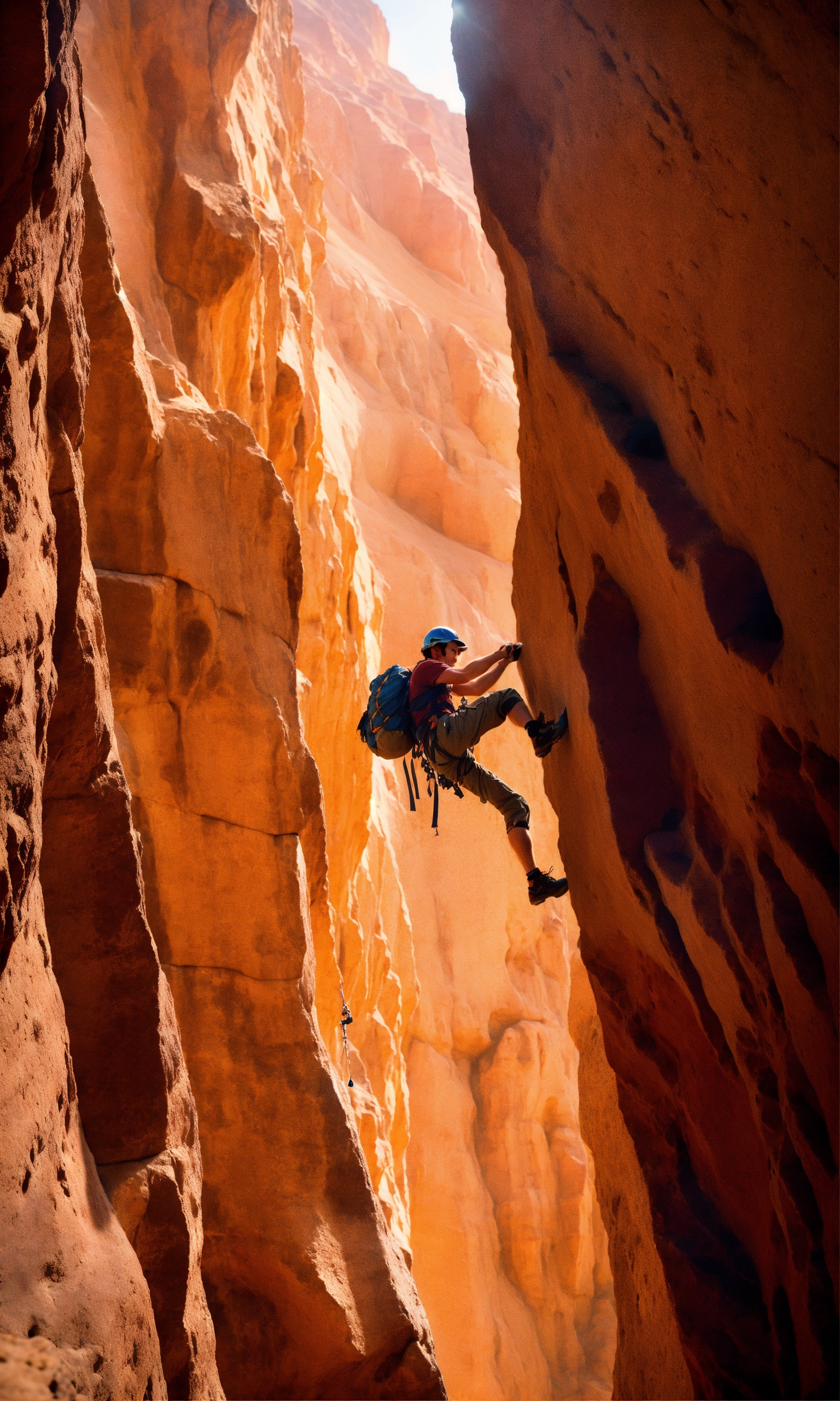 In the center of this gripping image stands aron ralston, a symbol of unbreakable human spirit. he's captured mid-climb on a rugged canyon wall, one hand firmly gripping the rock face while the other extends outward, reaching for a precarious handhold. the harsh desert landscape looms behind him, with the scorching sun casting deep shadows. a determined glint in his eyes reflects his unwavering resolve. this image encapsulates aron's incredible journey of survival and the indomitable willpower that defined it
