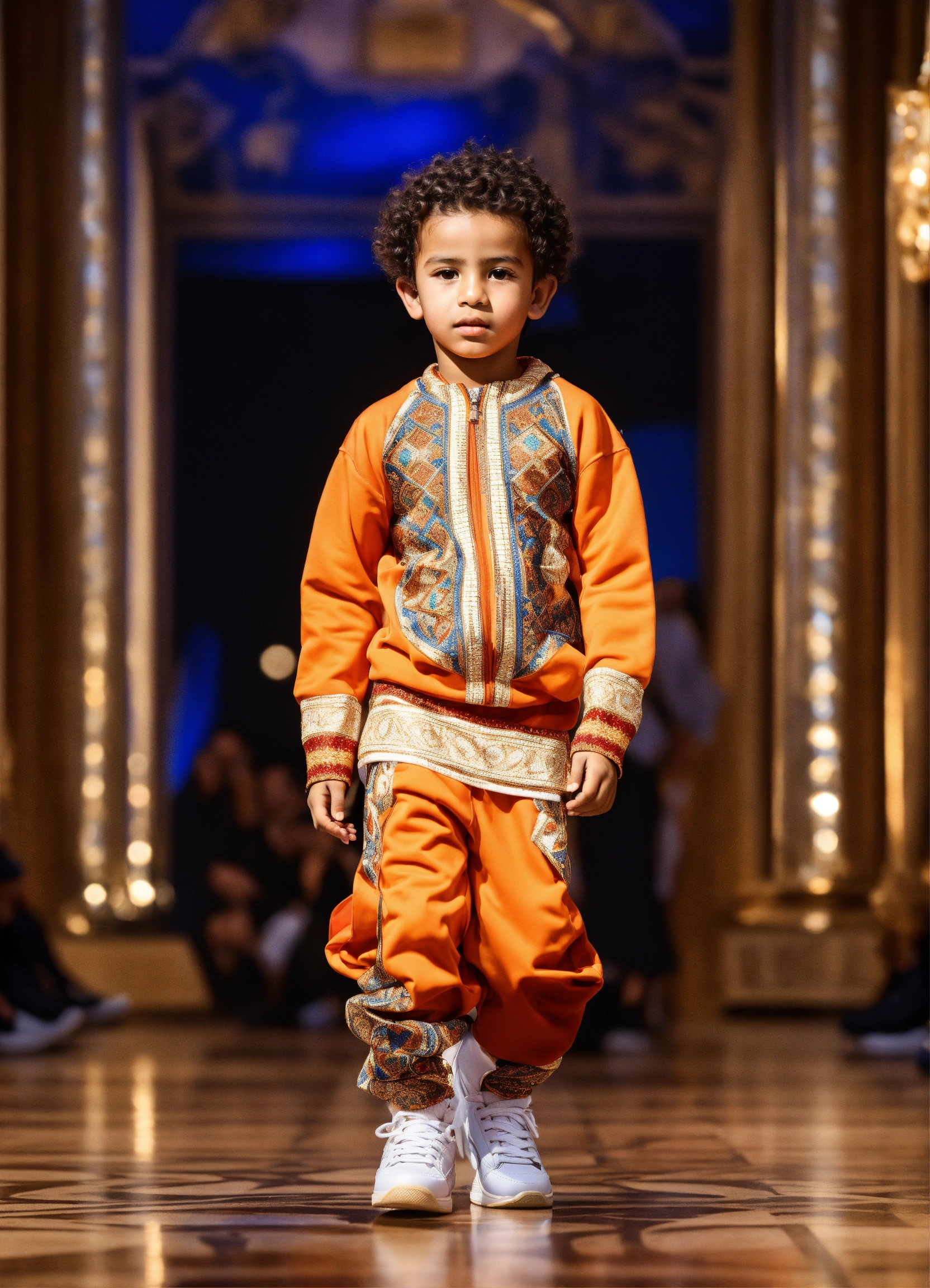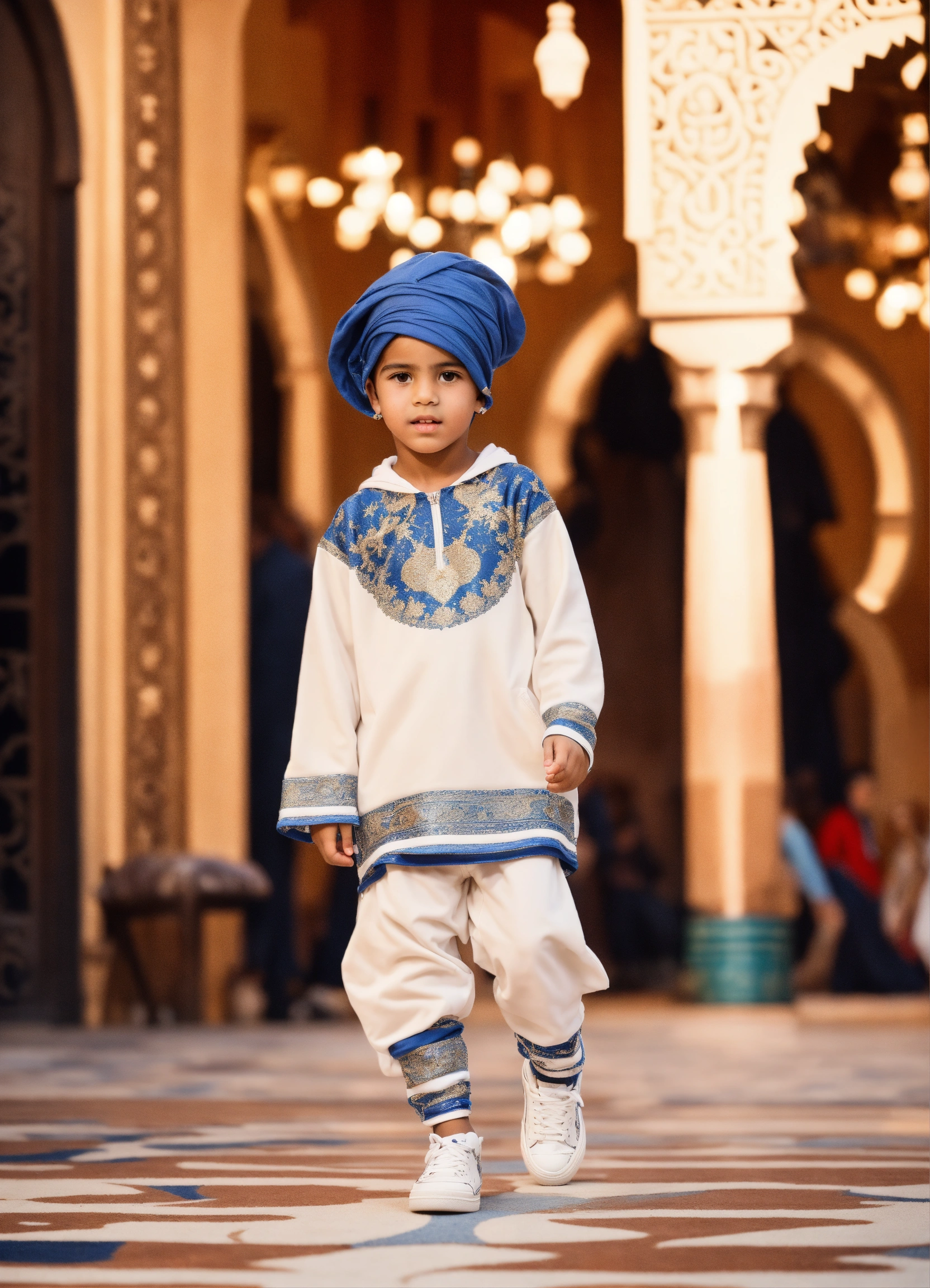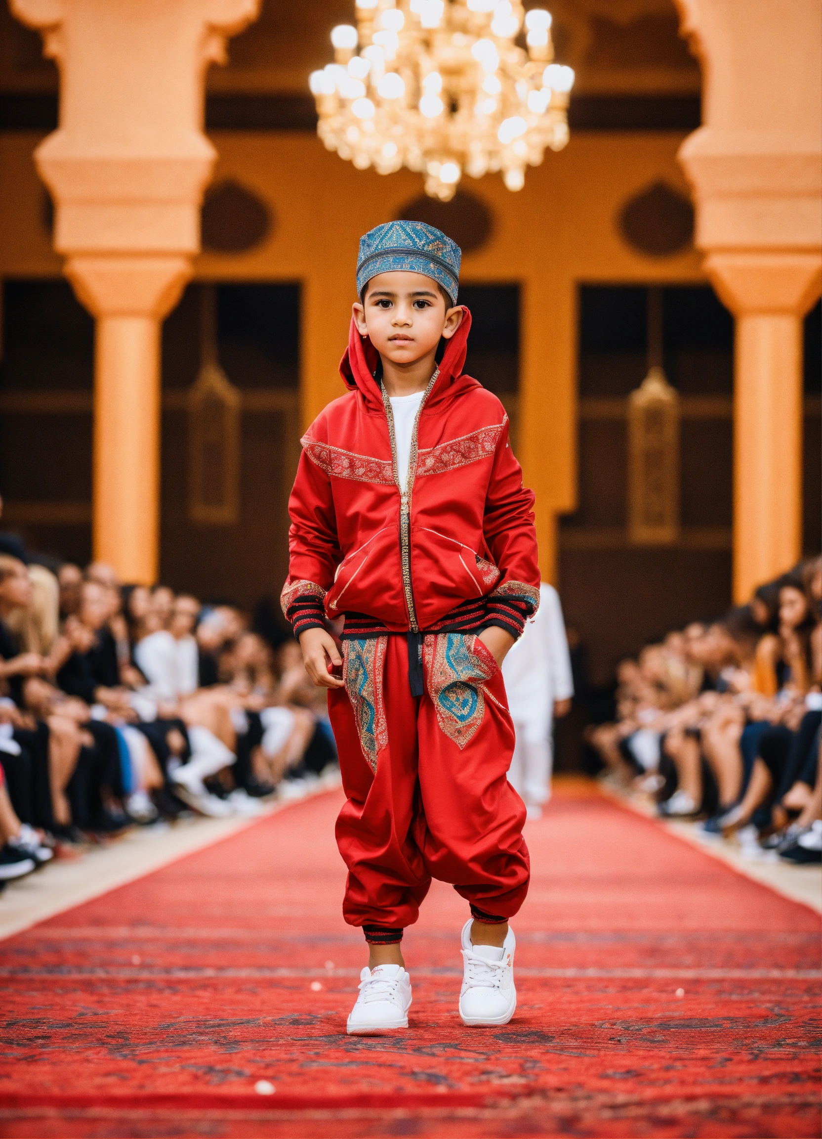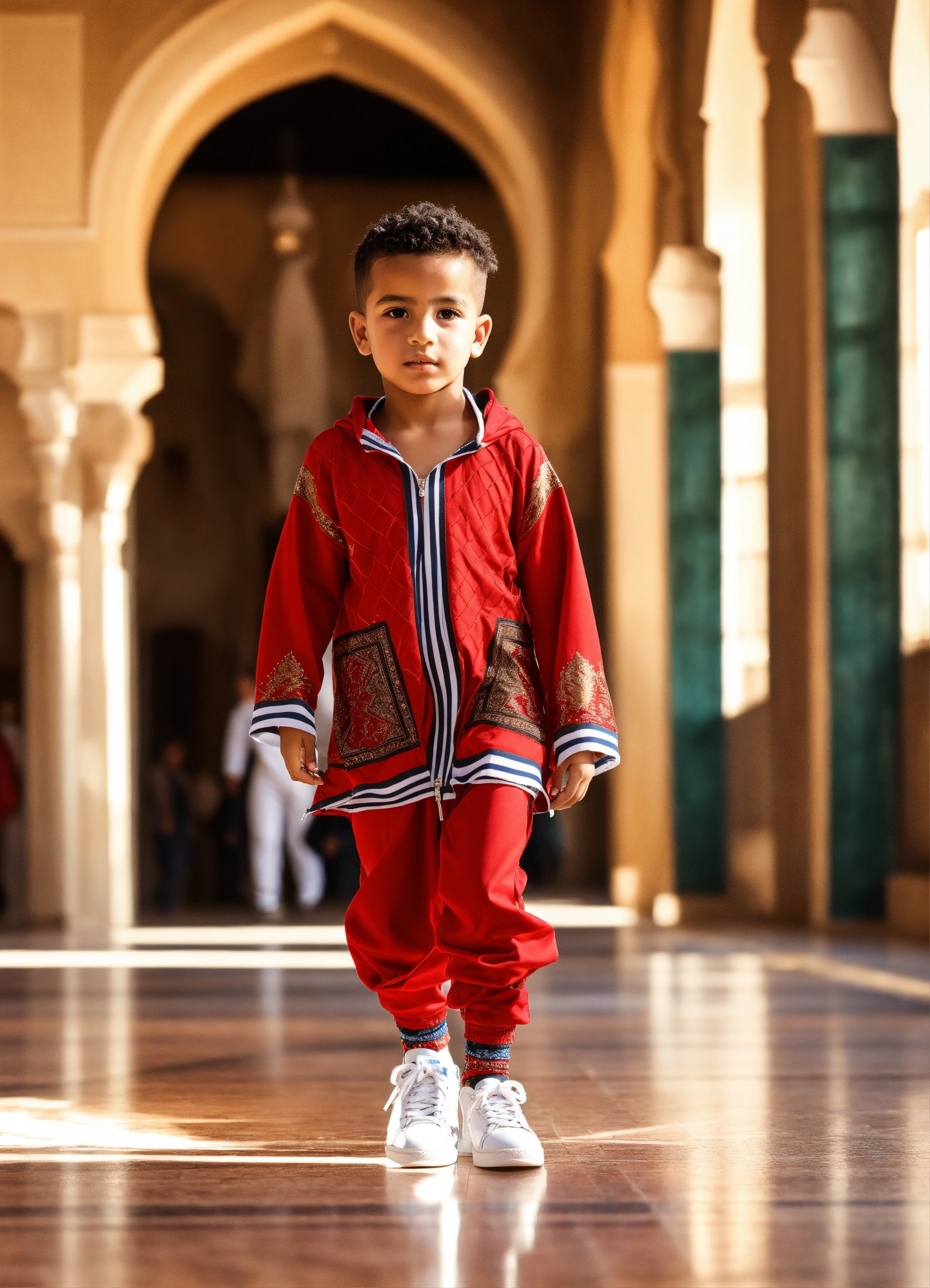 Beautiful little morrocan boy, wearing sport wear, with arabic touch morrocan style, luxury fabric, with luxury sneakers sport, with beautiful hair, no hood, haute couture, fashion photorealistic, in front decor runaway walk fashion show