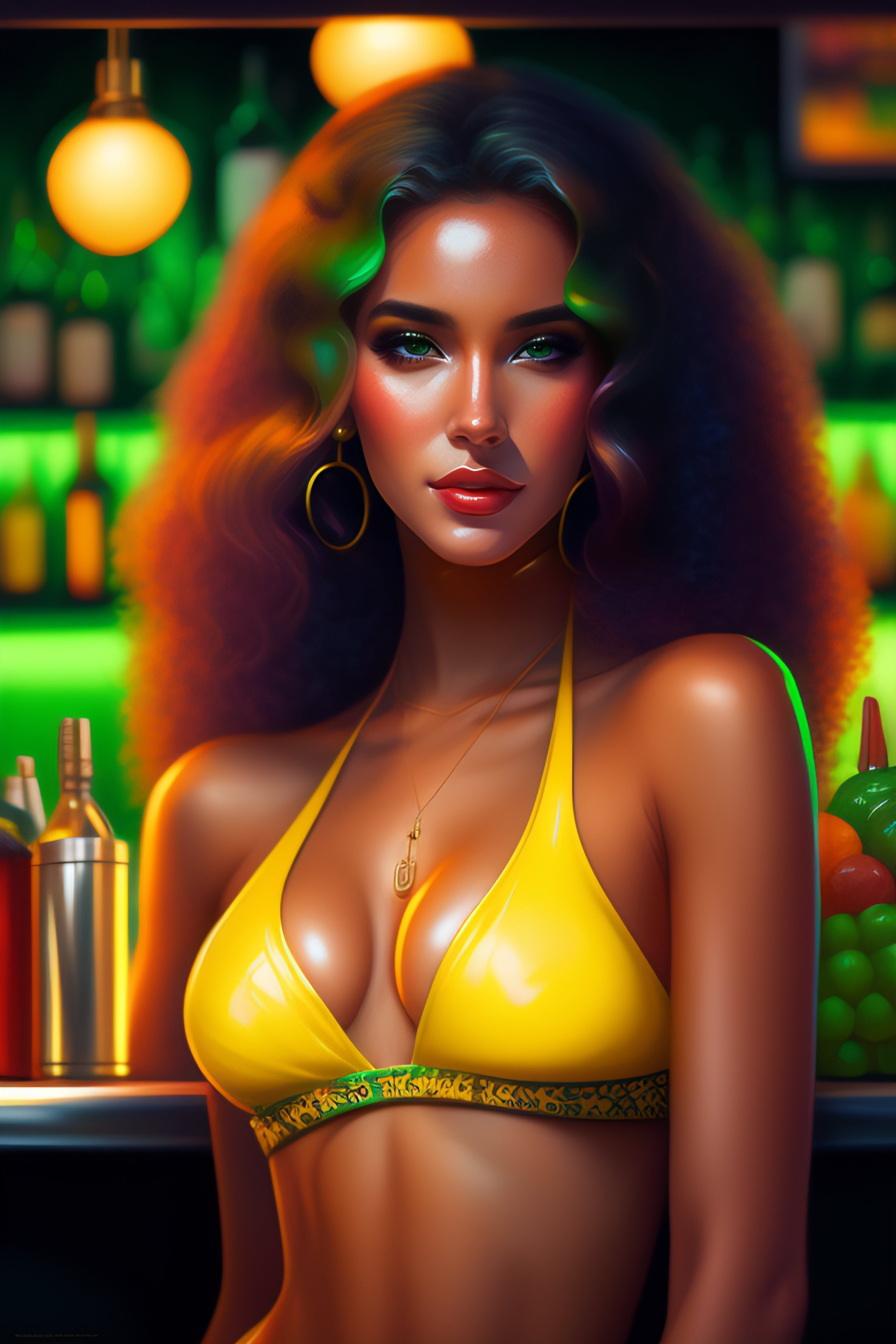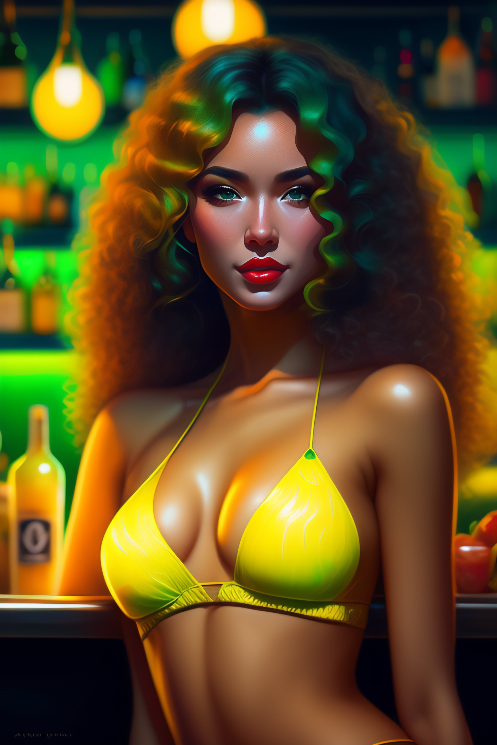 Elegant blonde brazilian twin woman smiling curly hair wearing bikini yellow & green inside a bar at night, cute face, round eyes, digital painting, fan art, pixiv, by ilya kuvshinov, katsuhiro otomo ghost-in-the-shell, magali villeneuve, artgerm, jeremy lipkin and michael garmash and rob rey deep inside a bar drink at night