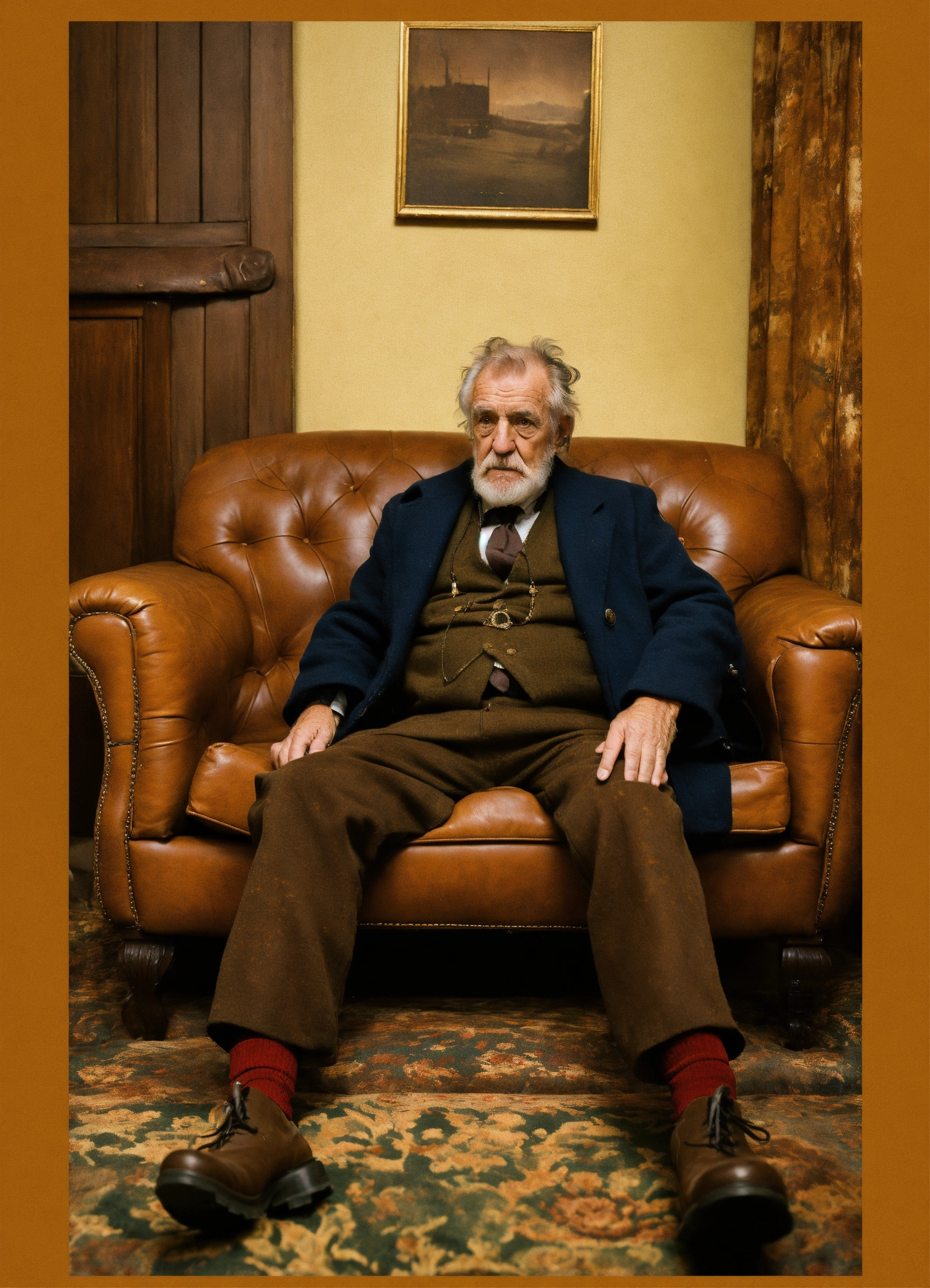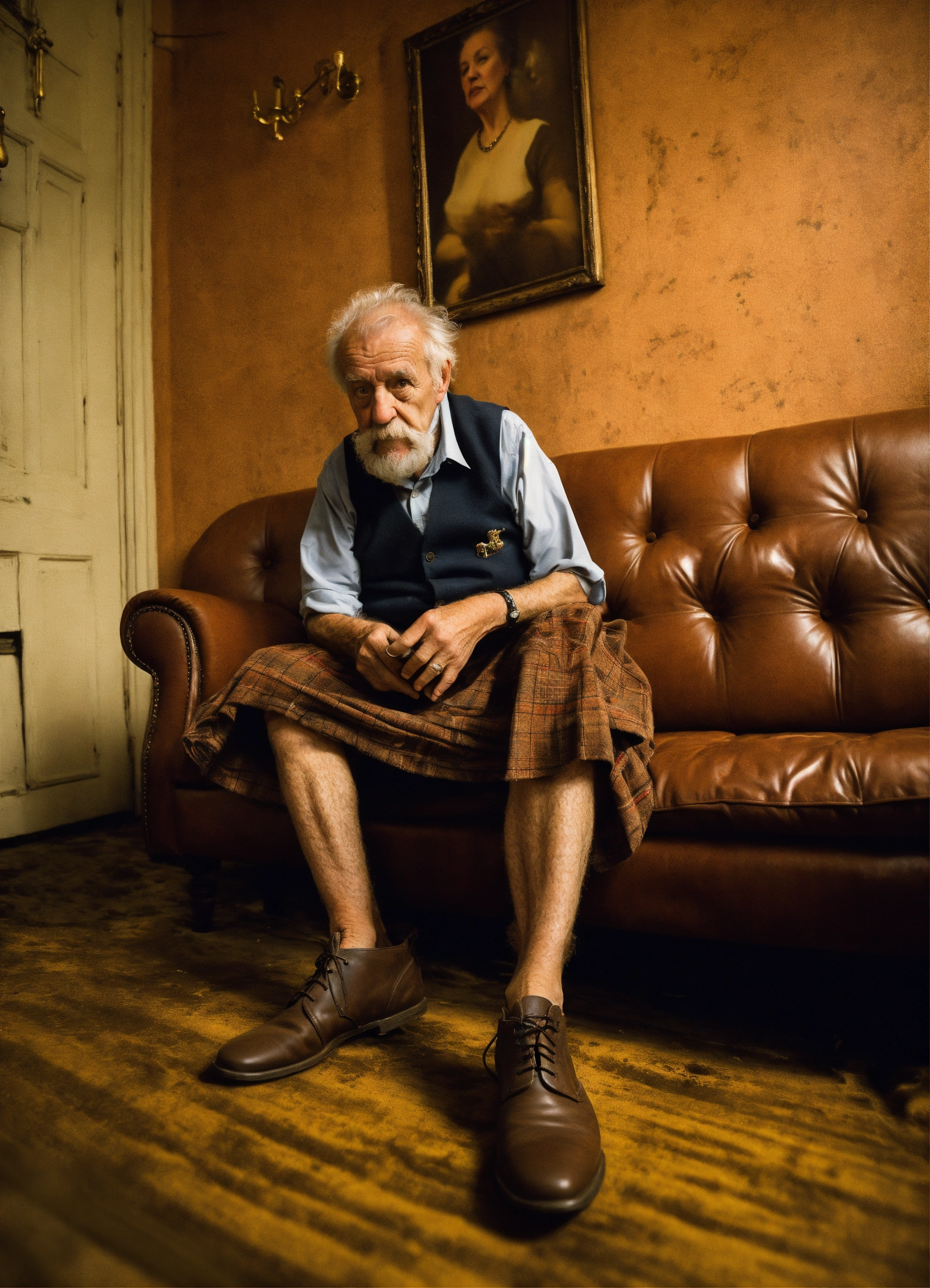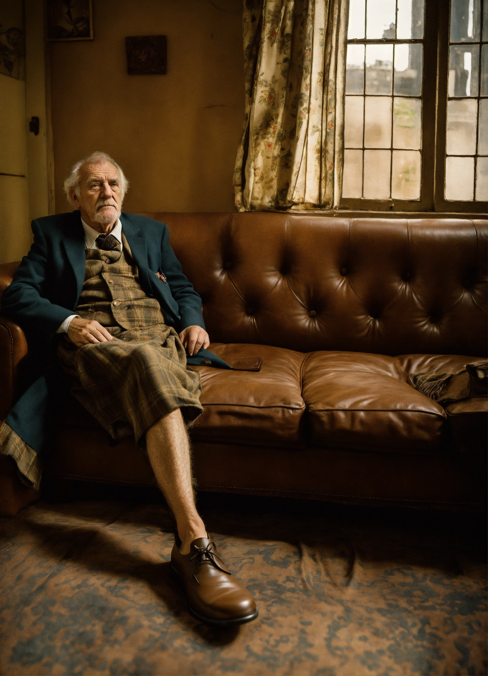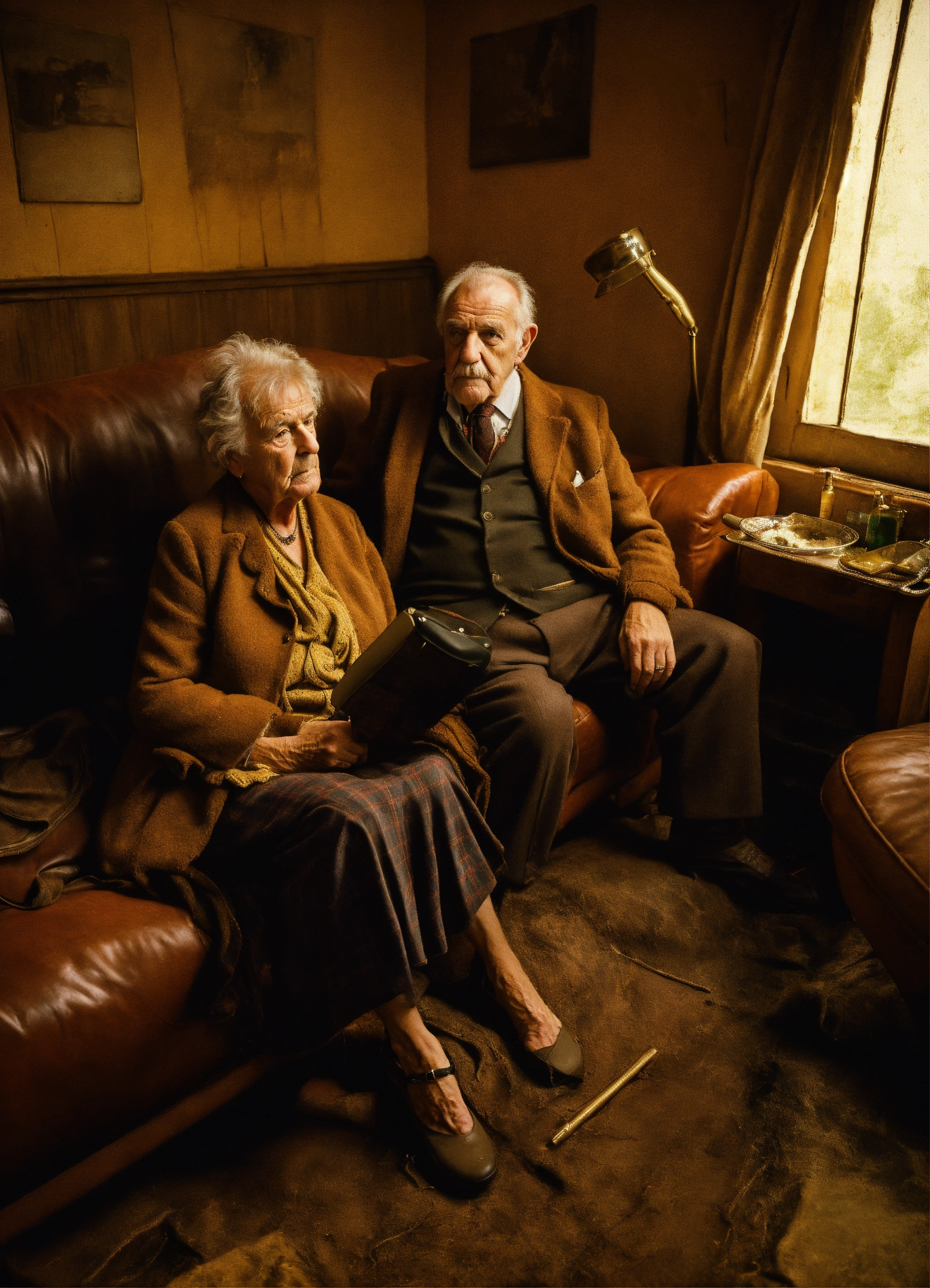 Wide angle, sleazy old scruffy scottish man sitting on a dirty brown couch, staring at old woman’s legs in the foreground