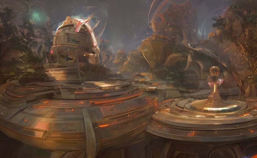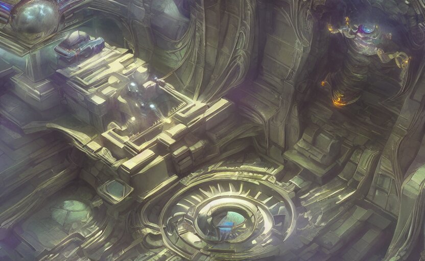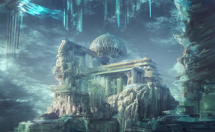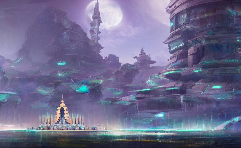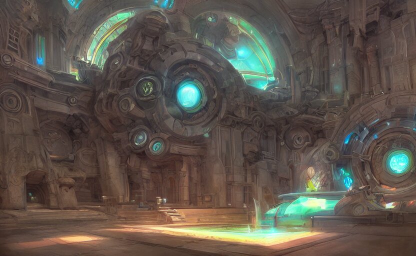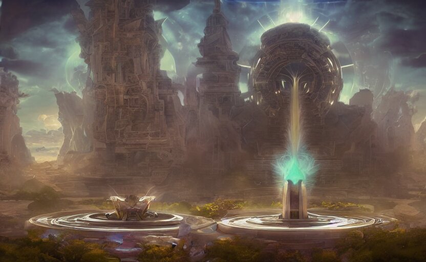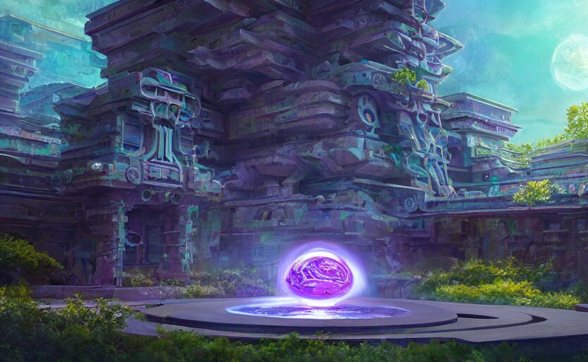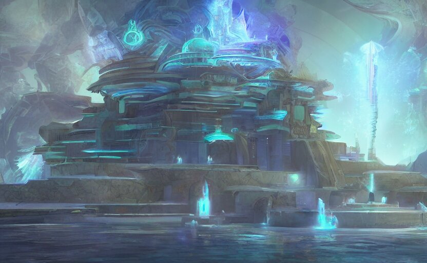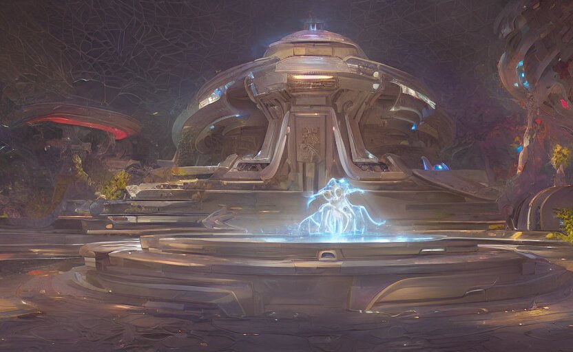 Futuristic ((((mystical temple of the goddes of moon beautiful and magical with a fountain)))). by frank lloyd wright, concept art, inrincate, sharp focus, digital painting, unreal engine, cgsociety, neoclassical, mech, robot, fractal flame, cinematic, overwatch skin, highly detailded