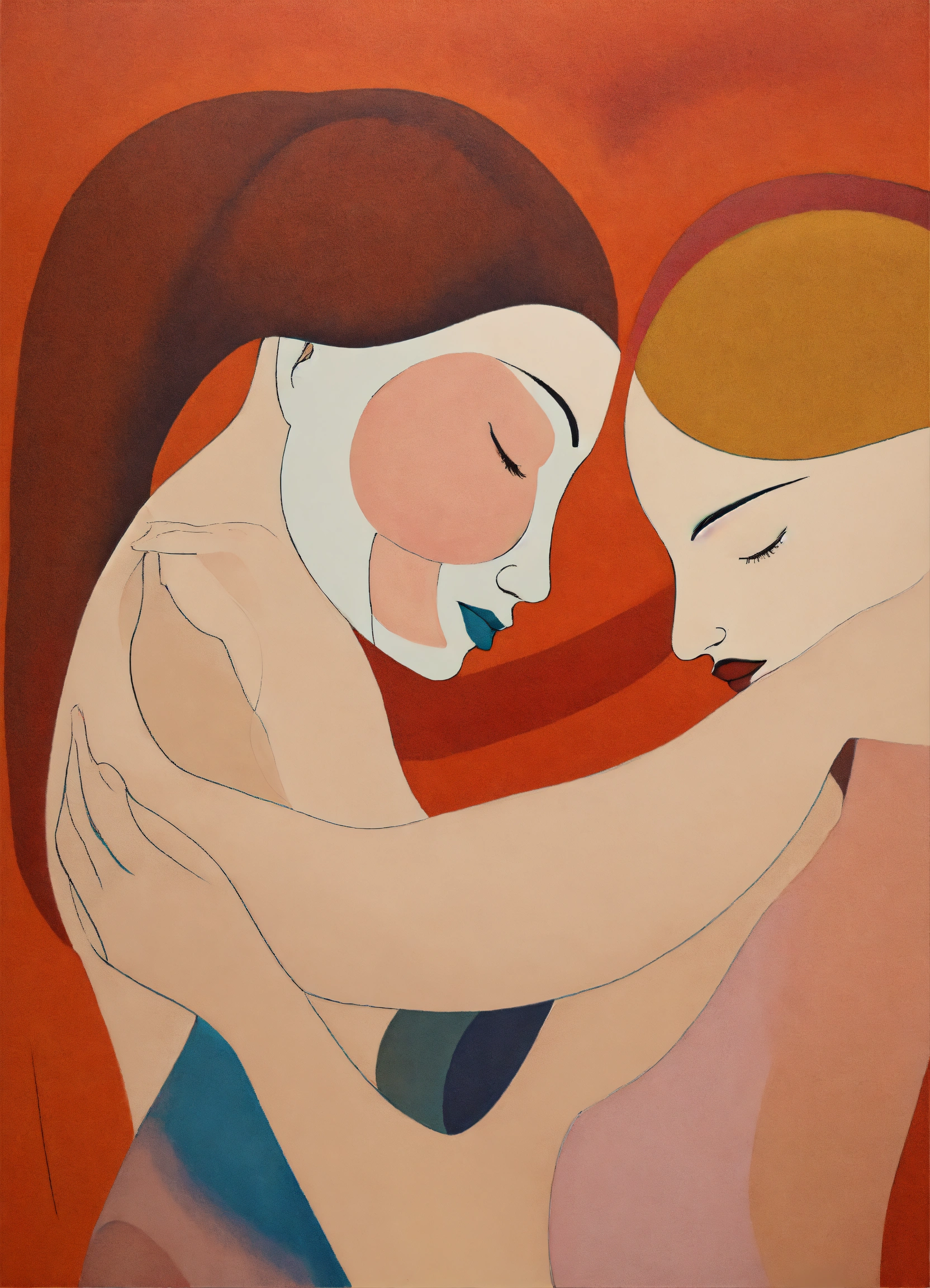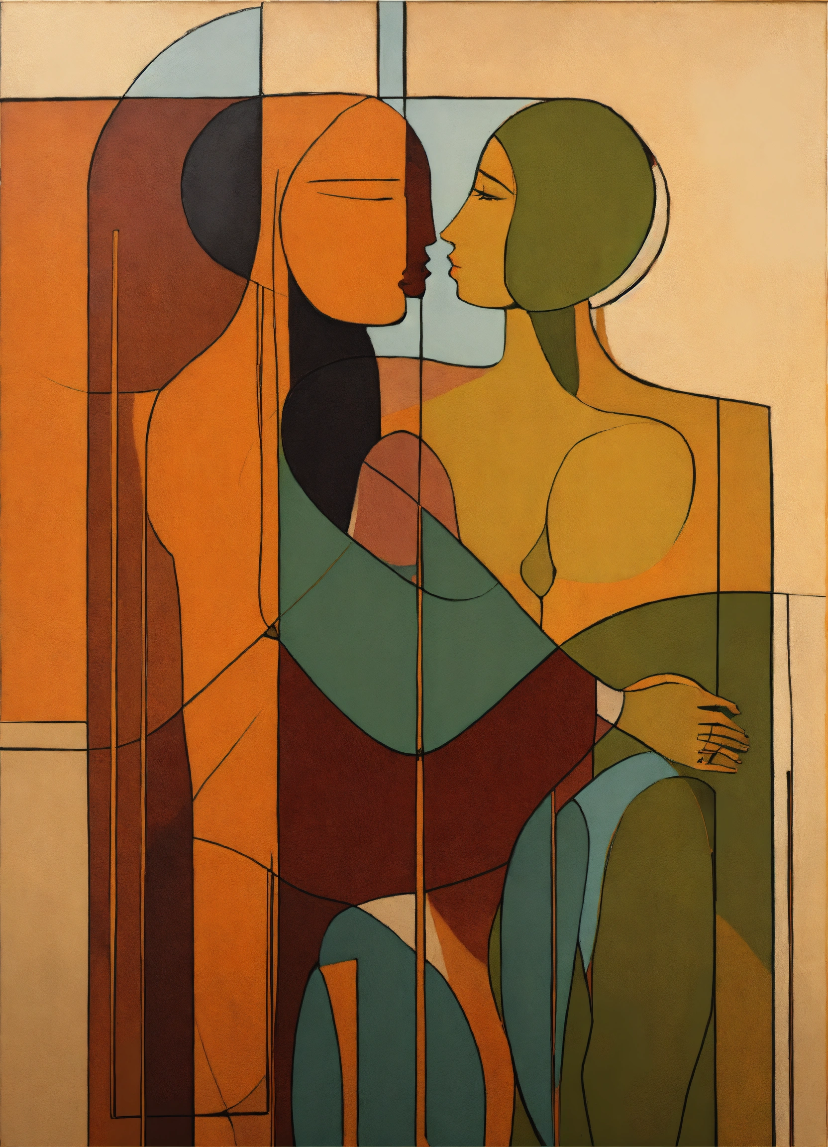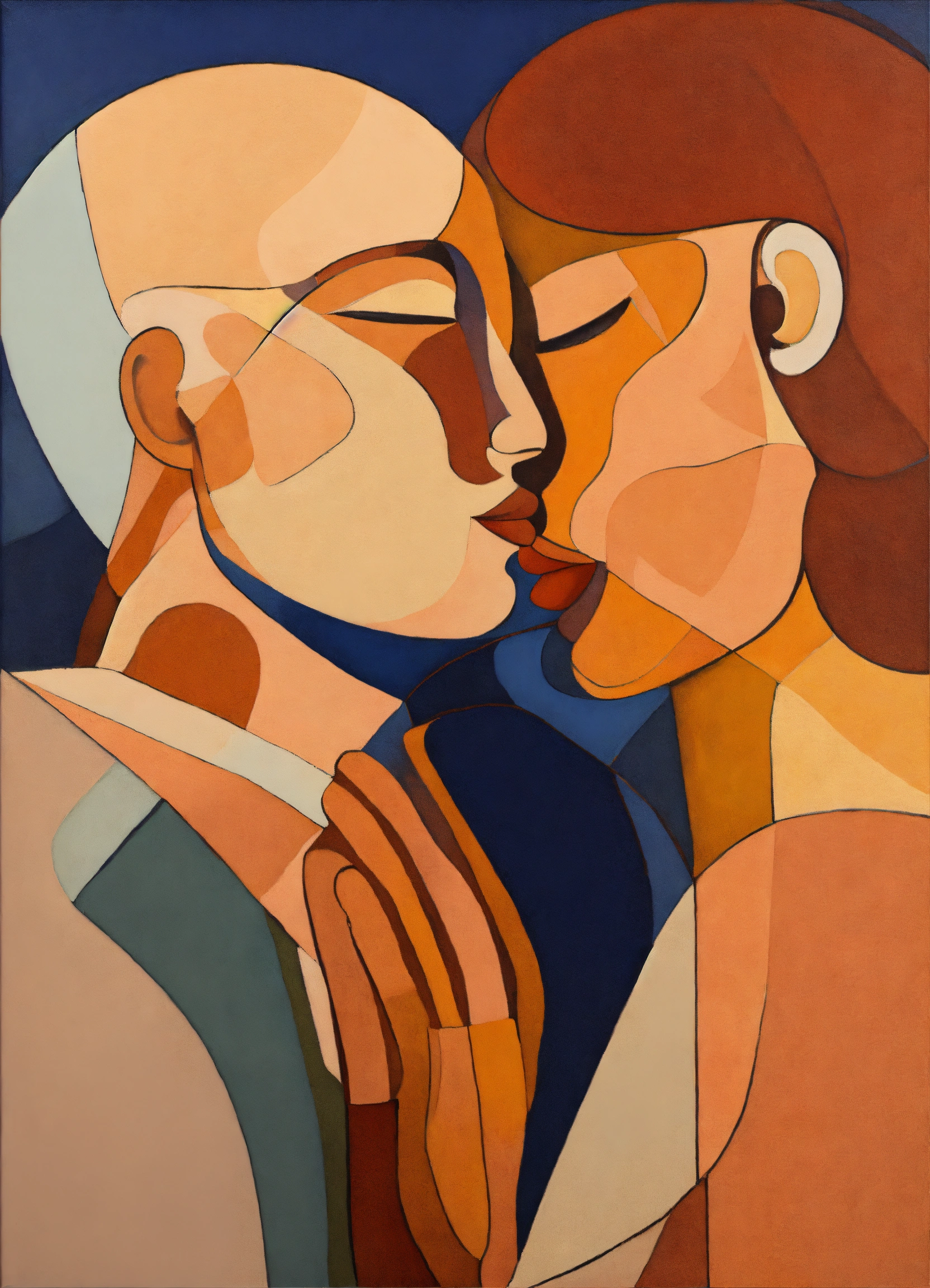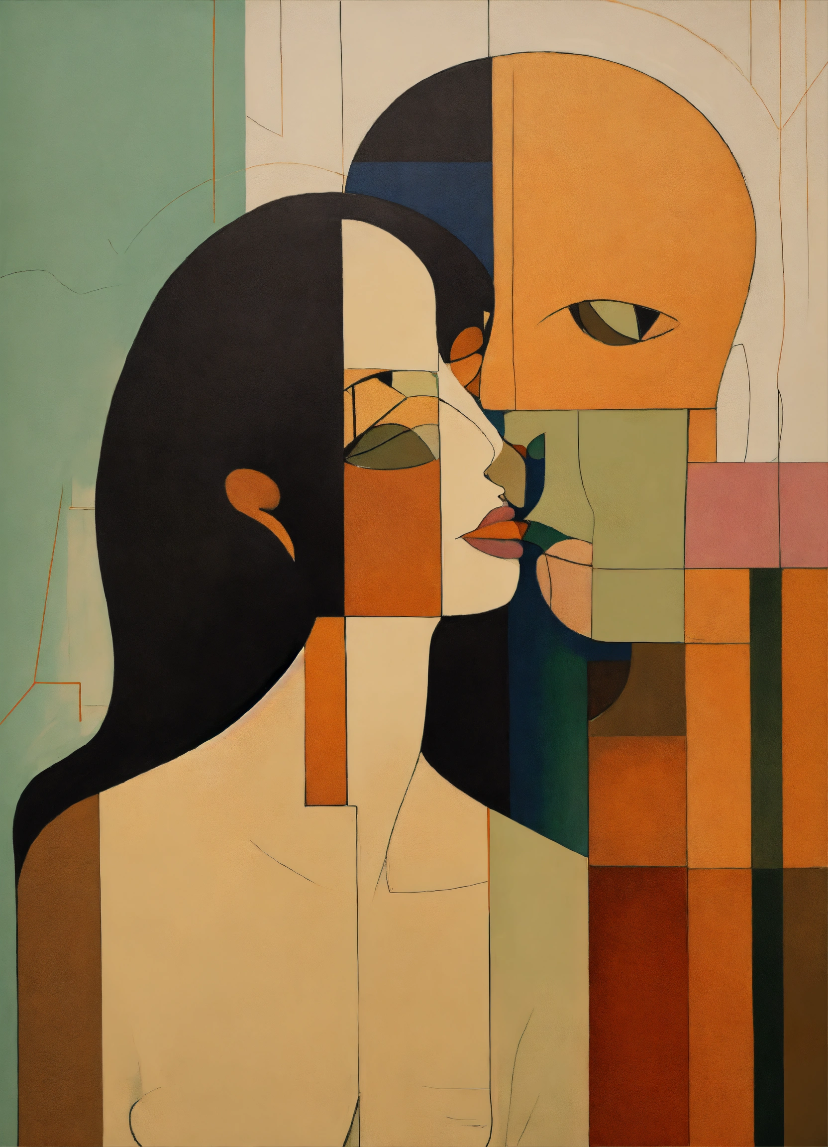 An abstract painting of a man and a woman in minimal lines in intimate moments