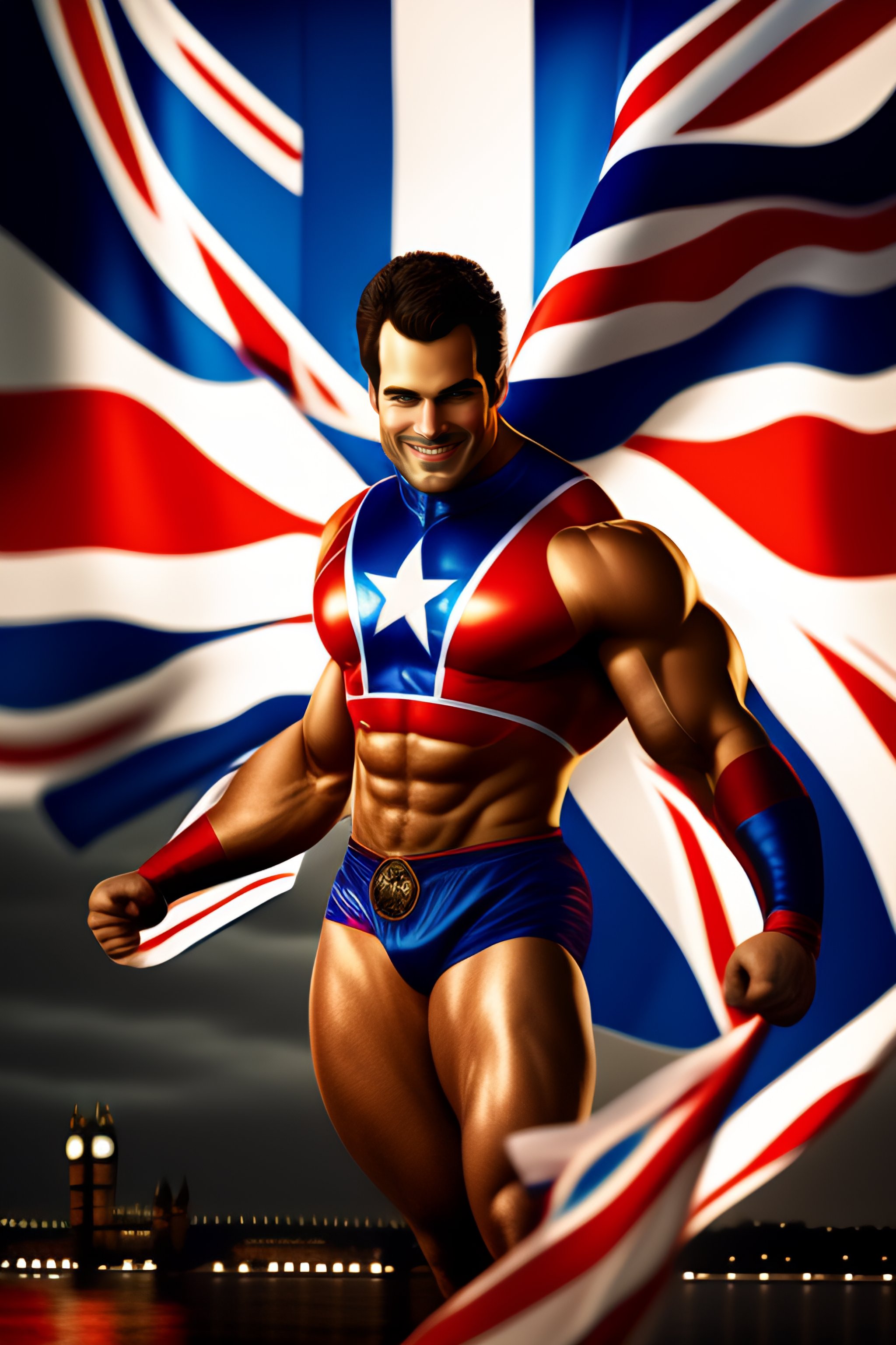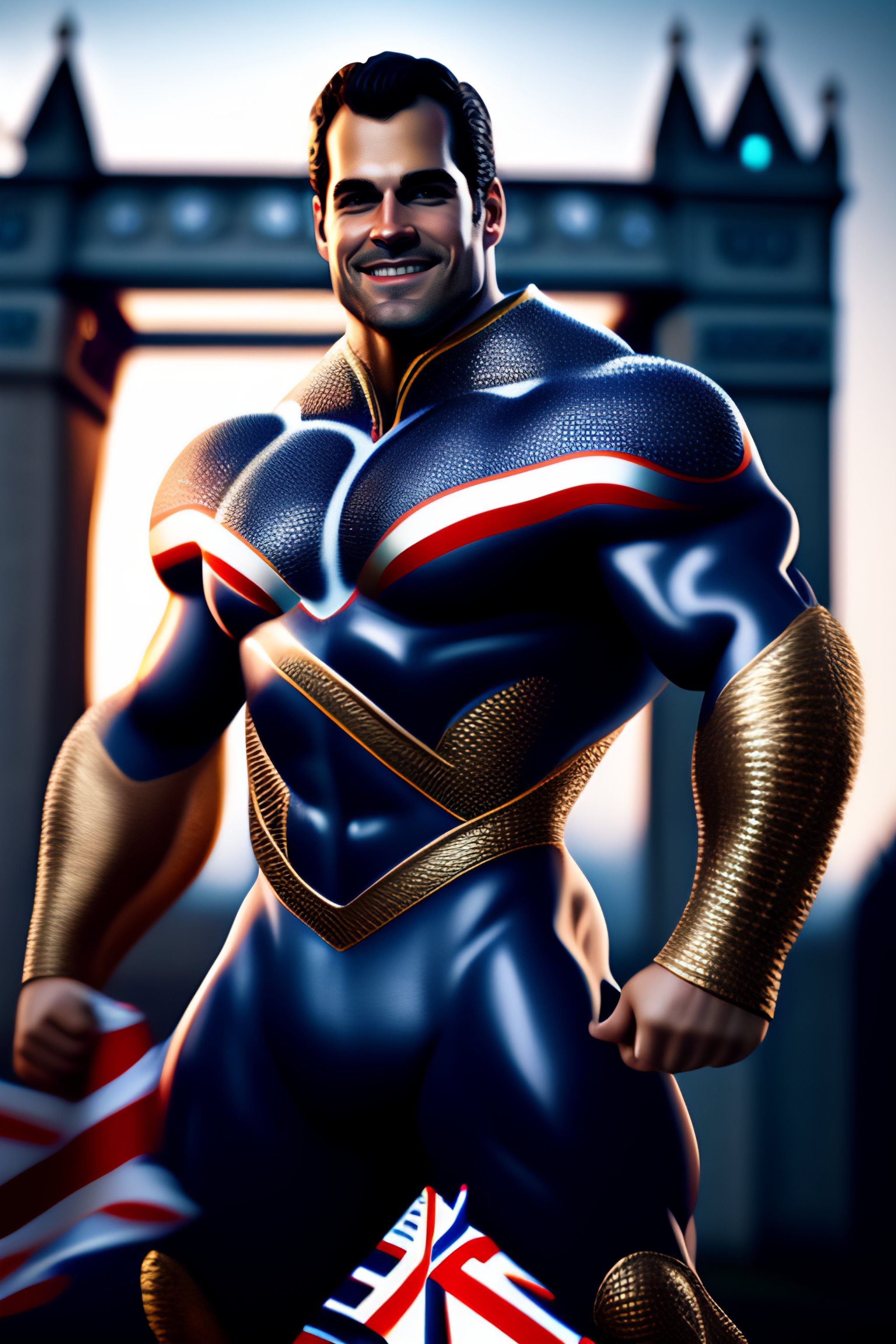 Epic comic book cover, full frame, accurate hyper realistic happy smiling henry cavill!! as hairy muscular bodybuilder superhero captain britain posing like a fitness model or hovering in the air like a superhero, wearing an intricately detailed well-ventilated glossy!!! metallic!!! patriotic british superhero costume with short sleeves and union jack flag on the chest and matching boots, smile, cleft chin, dark hair, british iconography and heraldry, london city stonehenge at night in the background, insane detail, intricate, 8k, sharp focus, cinematic, artstation, dslr photography, photo by bruce weber photography