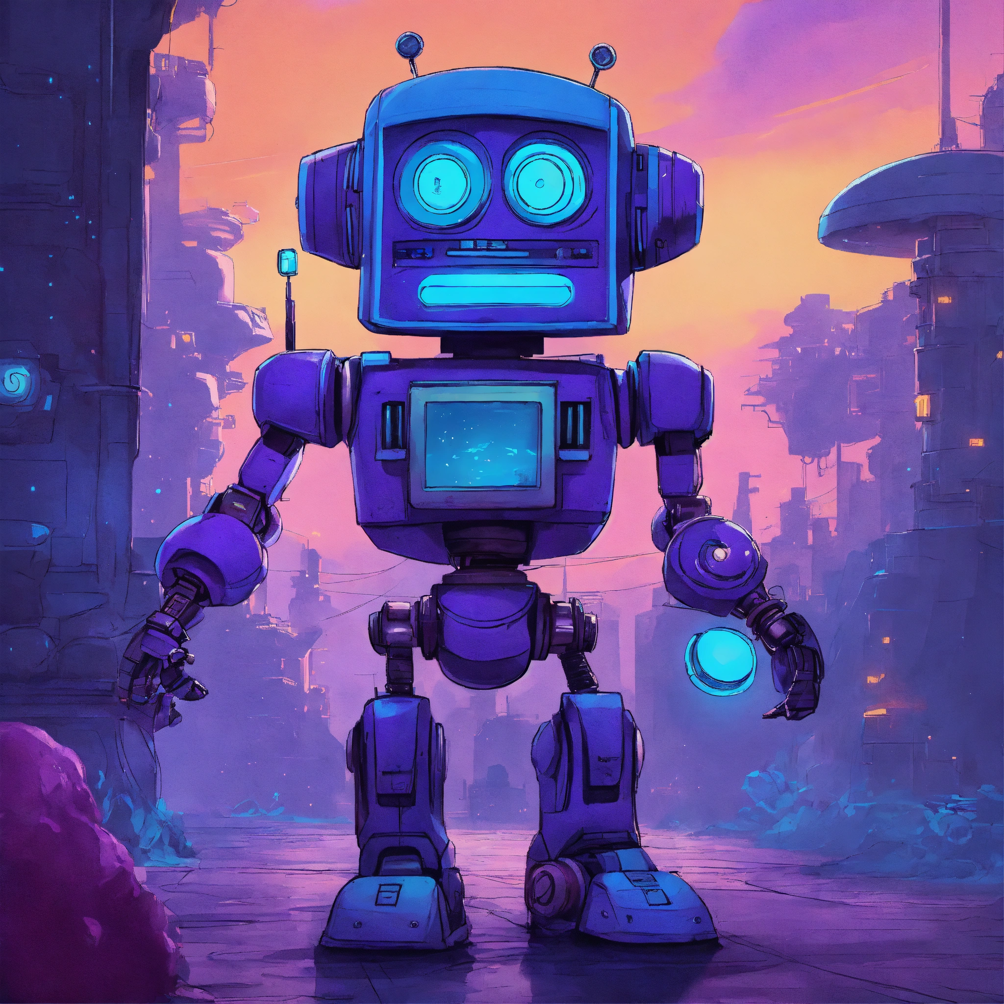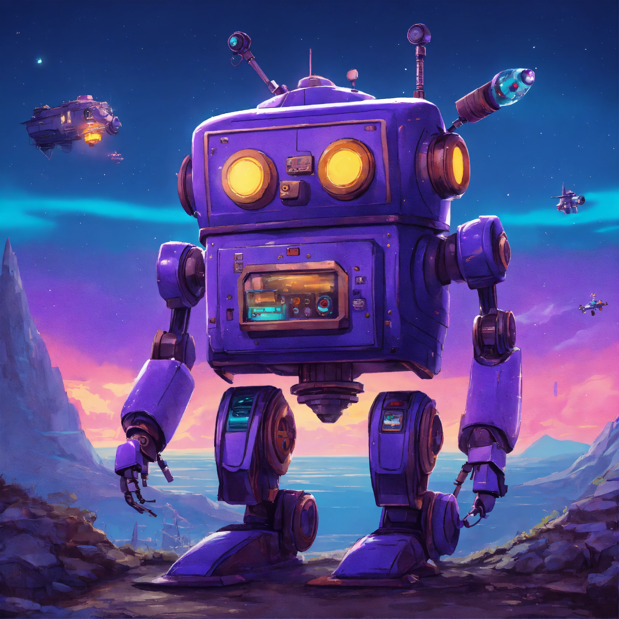 Sci-fi fantasy adventure story, fun, quirky, retro, heartwarming, action-packed, robot, 90s, blue, purple, no text